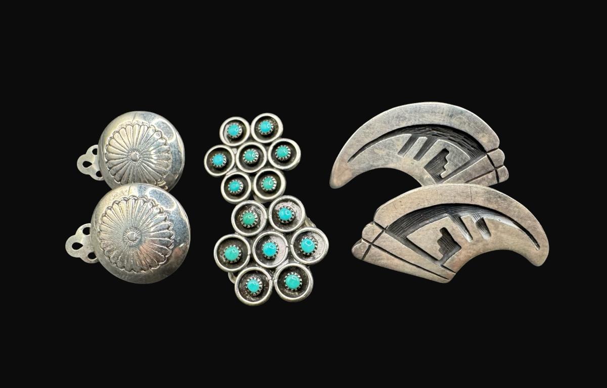 **WIRE TRANSFER IS REQUIRED IF SHIPPED.** [21.84g] Includes Zuni style earrings, Navajo style earrings, and other Southwest style earrings. All are clip-ons. Measurement of largest: 1.25”. Silver content confirmed using Niton XRF precious metals analyzer. **ALL PRECIOUS METALS SALES ARE FINAL. NO REFUNDS WILL BE GIVEN FOR ANY REASON.** [RM]