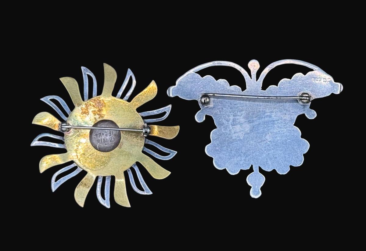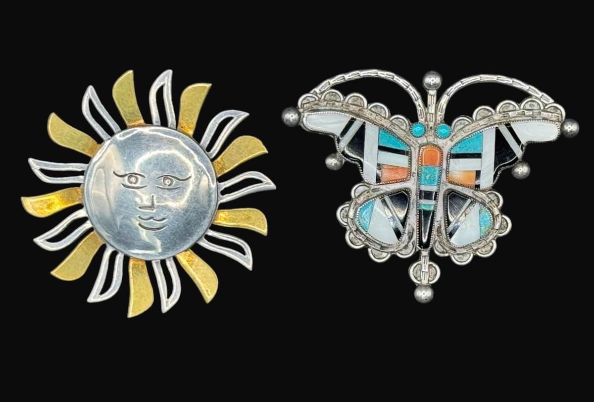 **WIRE TRANSFER IS REQUIRED IF SHIPPED.** [32.25g] Includes a Taxco marked sunshine pin with gold vermeil accents, and a turquoise, onyx, moonstone, and coral butterfly pin. Total of two pieces. Measurement of largest: 2.25”. Silver content confirmed using Niton XRF precious metals analyzer. **ALL PRECIOUS METALS SALES ARE FINAL. NO REFUNDS WILL BE GIVEN FOR ANY REASON.** [RM]