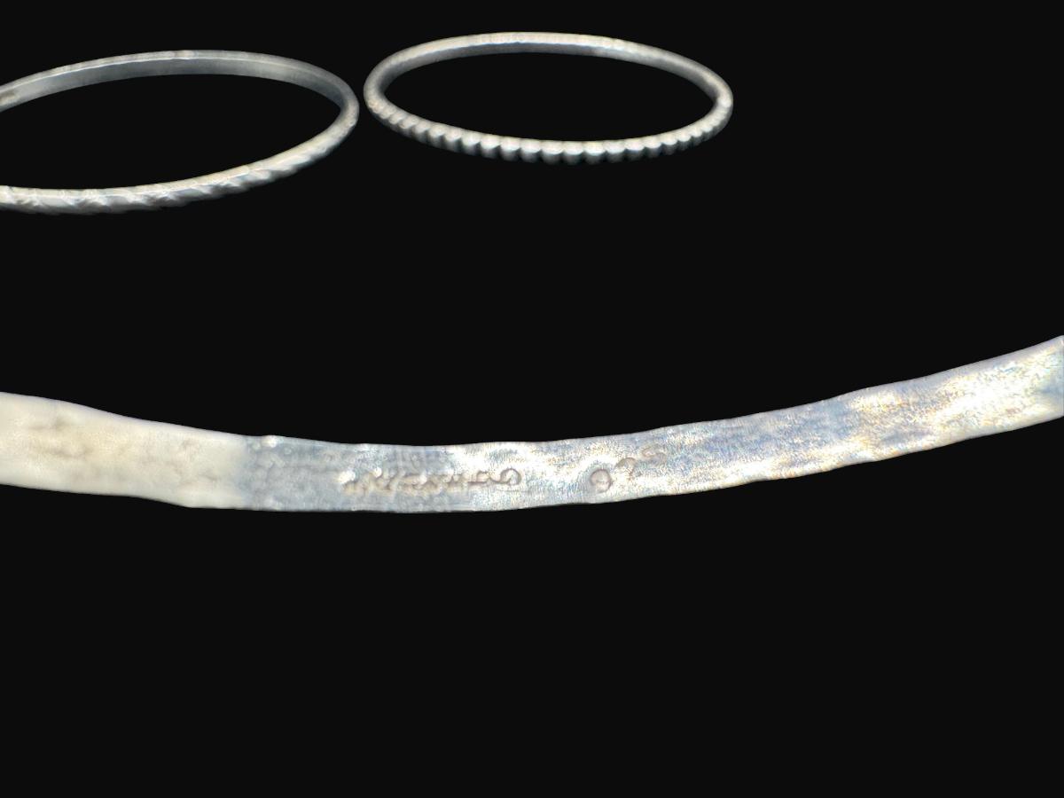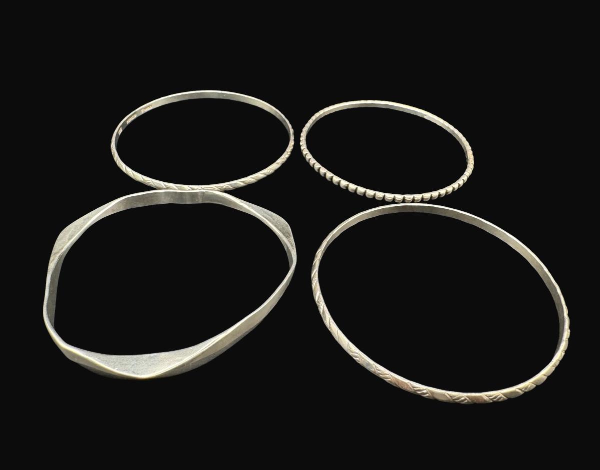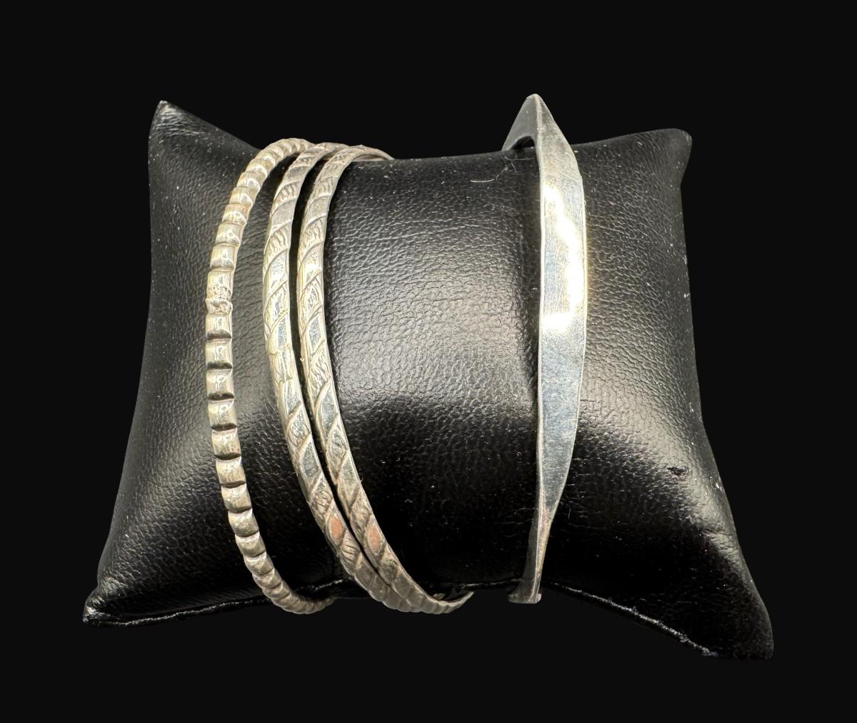 **WIRE TRANSFER IS REQUIRED IF SHIPPED.** [42.12g] Includes four bangle bracelets with various patterns, including mid-century style. Silver content confirmed using Niton XRF precious metals analyzer. **ALL PRECIOUS METALS SALES ARE FINAL. NO REFUNDS WILL BE GIVEN FOR ANY REASON.** [RM]