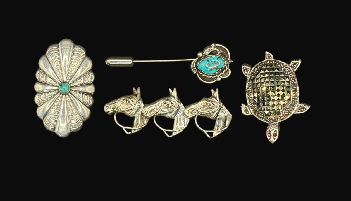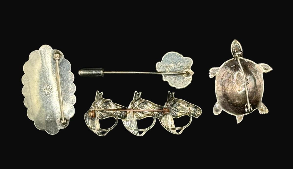 **WIRE TRANSFER IS REQUIRED IF SHIPPED.** [26.57g] Includes a turquoise cabochon stick pin, a marcasite turtle, a horse head pin, and a bell pin. The horse head pin is marked “Beau Navajo.” Total of four pieces. Measurement of largest: 2.25”. Silver content confirmed using Niton XRF precious metals analyzer. **ALL PRECIOUS METALS SALES ARE FINAL. NO REFUNDS WILL BE GIVEN FOR ANY REASON.** [RM]