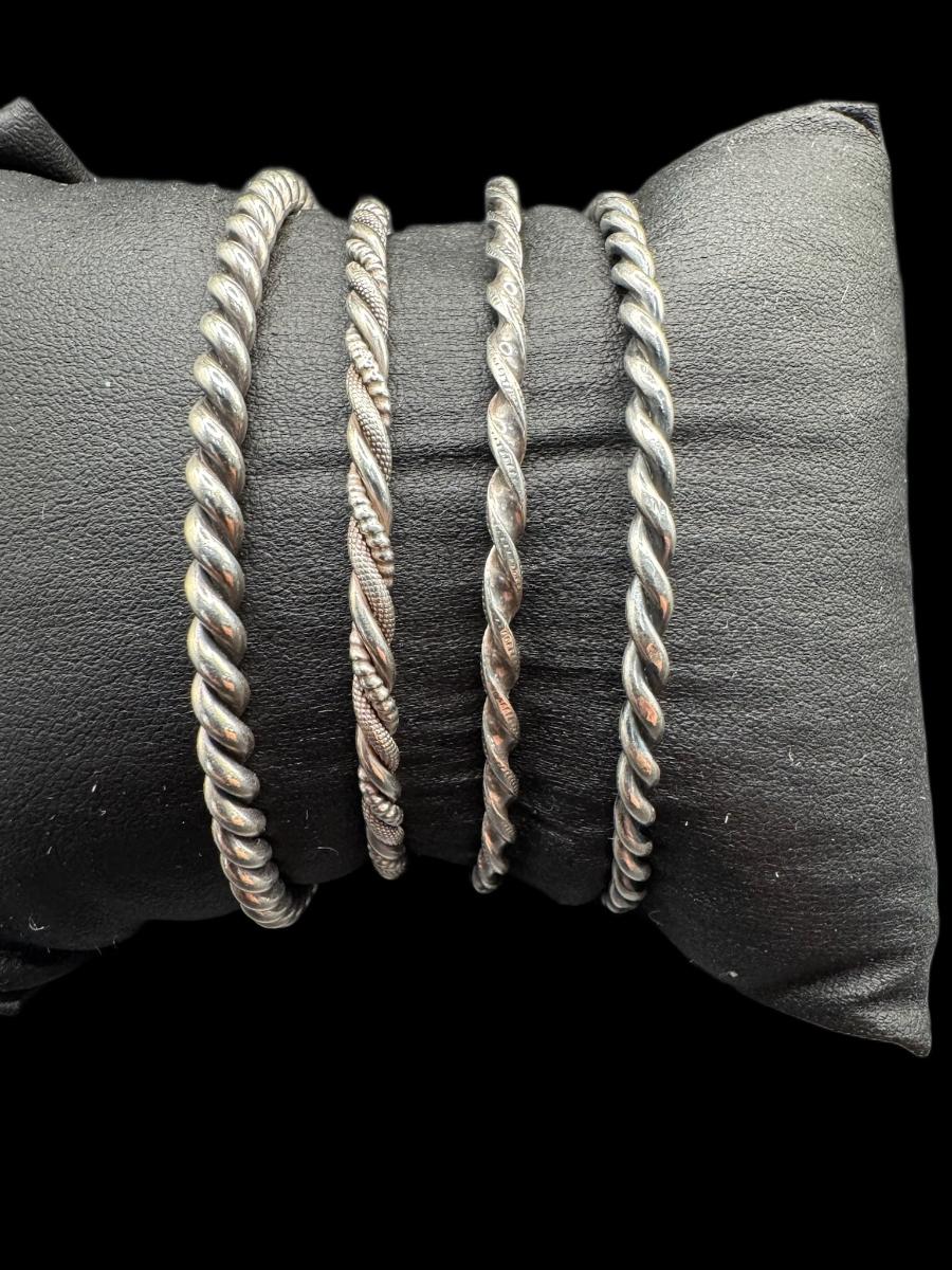 **WIRE TRANSFER IS REQUIRED IF SHIPPED.** [43.04g] Includes four twisted sterling silver bangles. Each is approximately 2.75” in diameter. Silver content confirmed using Niton XRF precious metals analyzer. **ALL PRECIOUS METALS SALES ARE FINAL. NO REFUNDS WILL BE GIVEN FOR ANY REASON.** [RM]