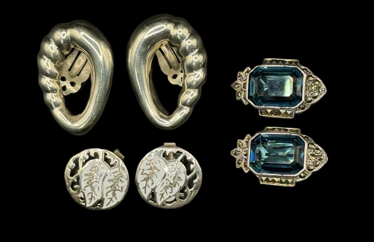 **WIRE TRANSFER IS REQUIRED IF SHIPPED.** [39.81g] Includes Taxco Mexico, Siam (Thailand), and London blue topaz earrings. Total of three pairs. Measurement of largest: 1.75”. Silver content confirmed using Niton XRF precious metals analyzer. **ALL PRECIOUS METALS SALES ARE FINAL. NO REFUNDS WILL BE GIVEN FOR ANY REASON.** [RM]