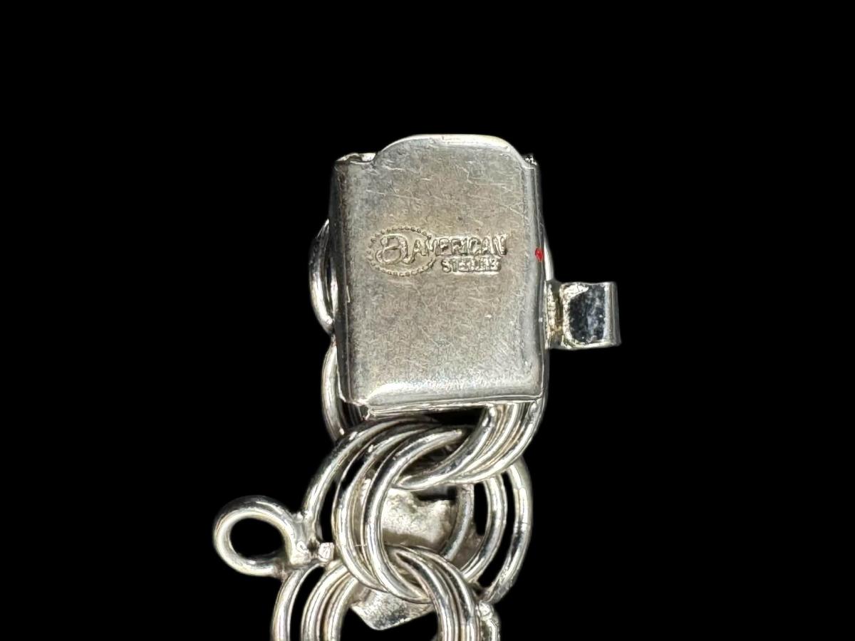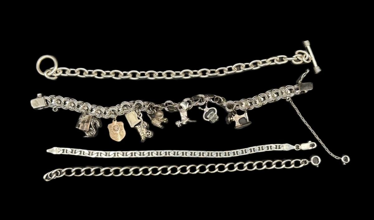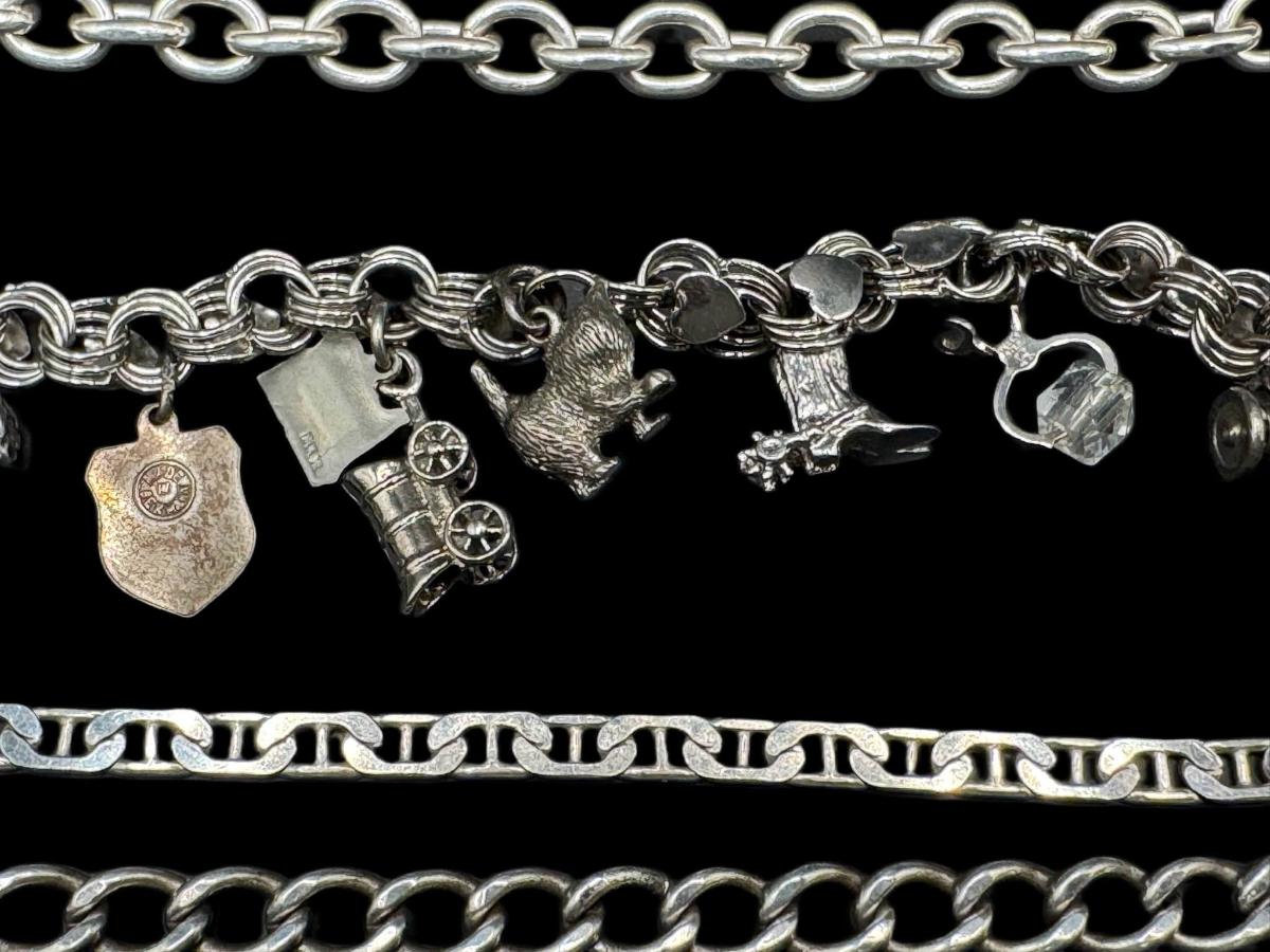 **WIRE TRANSFER IS REQUIRED IF SHIPPED.** [67.94g] Includes a charm bracelet, and three various style curb link bracelets. The clasps are intact. Age related wear. Measurement of longest: 8”. Silver content confirmed using Niton XRF precious metals analyzer. **ALL PRECIOUS METALS SALES ARE FINAL. NO REFUNDS WILL BE GIVEN FOR ANY REASON.** [RM]