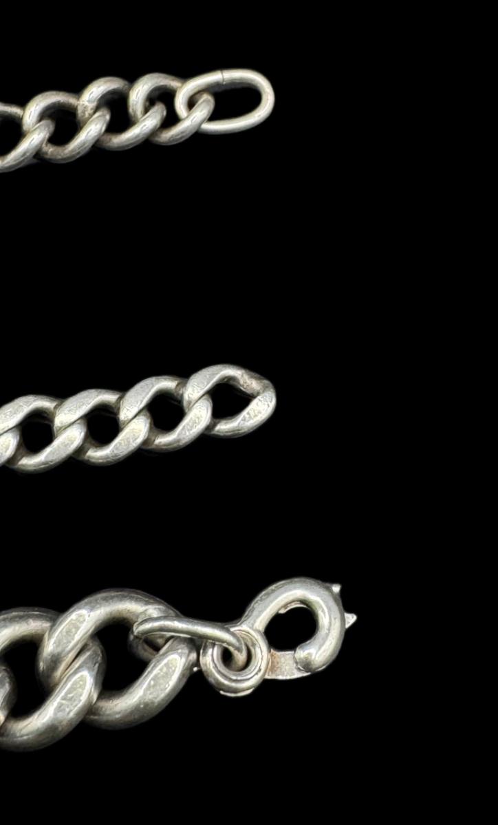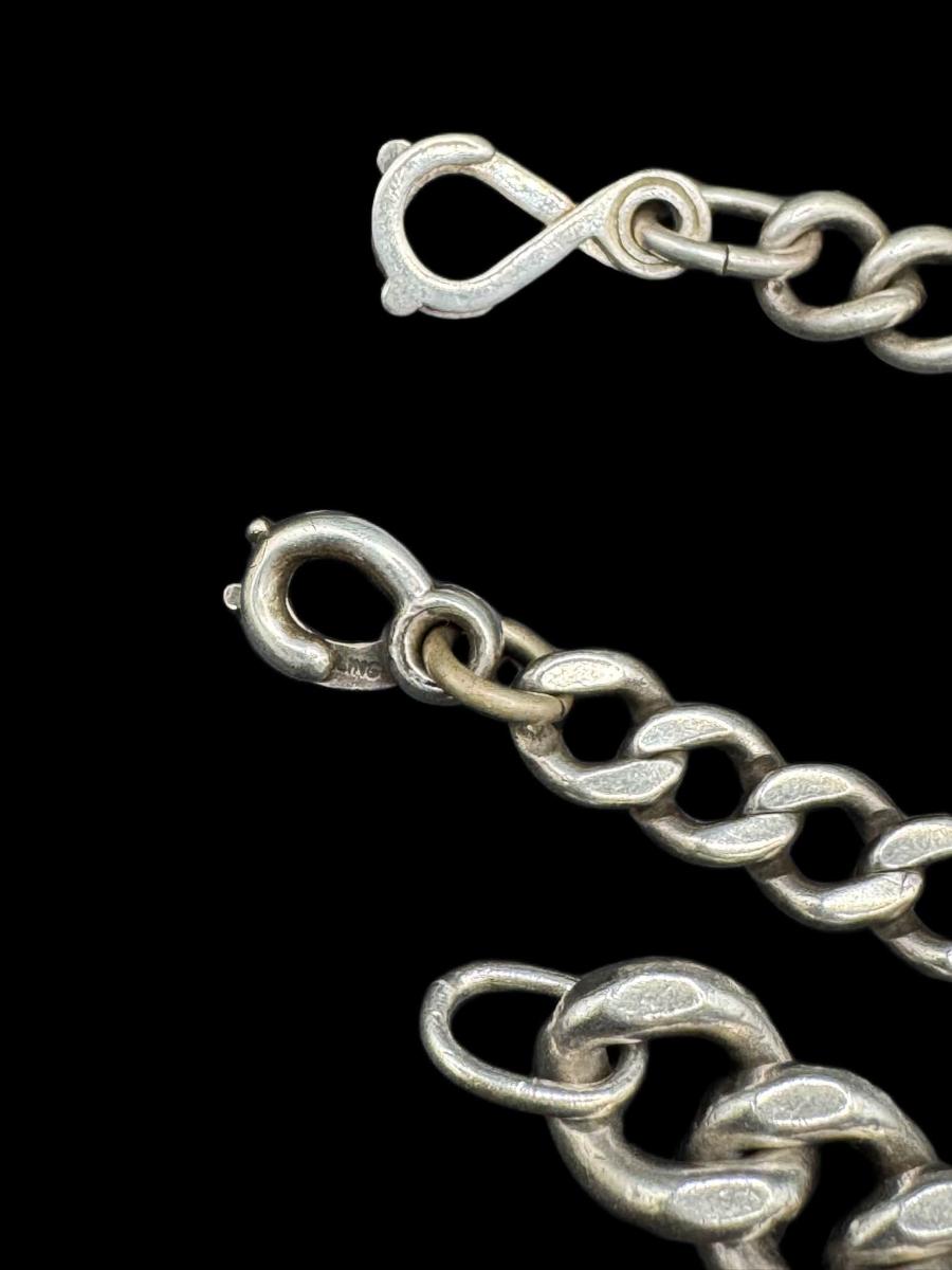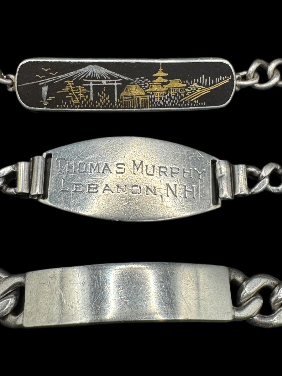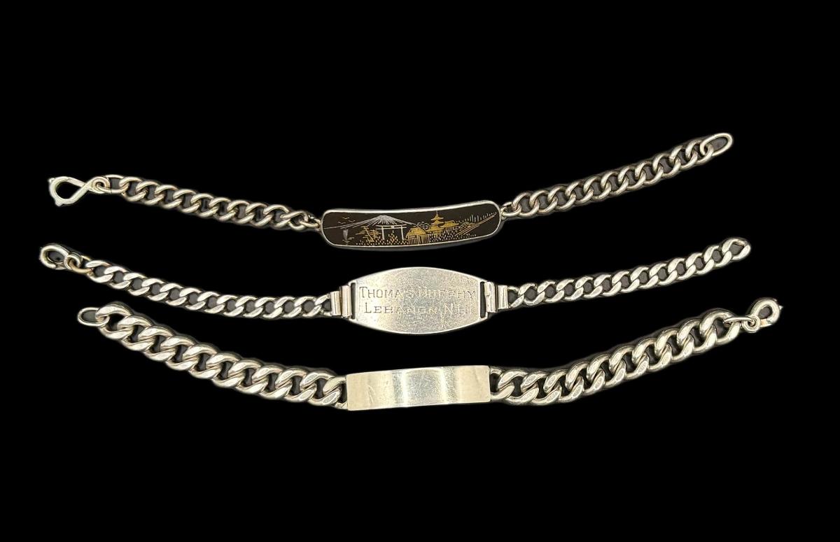 **WIRE TRANSFER IS REQUIRED IF SHIPPED.** [92.33g] Includes an Asian themed ID style bracelet, a plain ID bracelet, and a personalized ID bracelet. Total of three pieces. Measurement of longest: 8”. Silver content confirmed using Niton XRF precious metals analyzer. **ALL PRECIOUS METALS SALES ARE FINAL. NO REFUNDS WILL BE GIVEN FOR ANY REASON.** [RM]