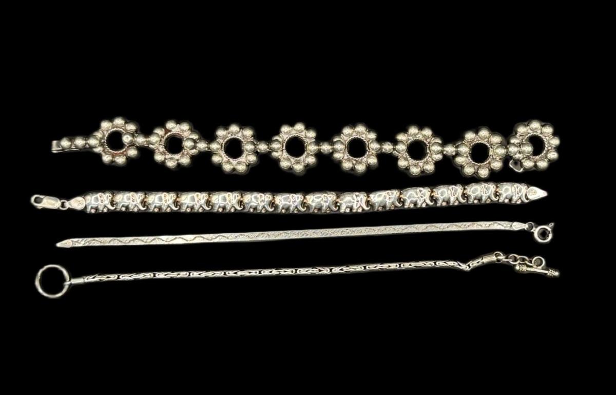 **WIRE TRANSFER IS REQUIRED IF SHIPPED.** [31.85g] Includes an elephant chain bracelet, a Byzantine style bracelet, a herringbone bracelet, and more. Total of four pieces. Measurement of longest: 7.5”. Silver content confirmed using Niton XRF precious metals analyzer. **ALL PRECIOUS METALS SALES ARE FINAL. NO REFUNDS WILL BE GIVEN FOR ANY REASON.** [RM]