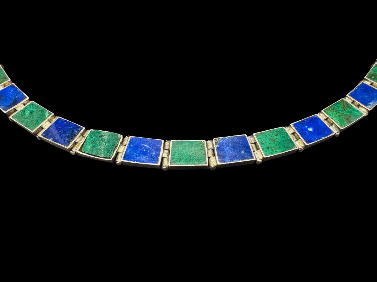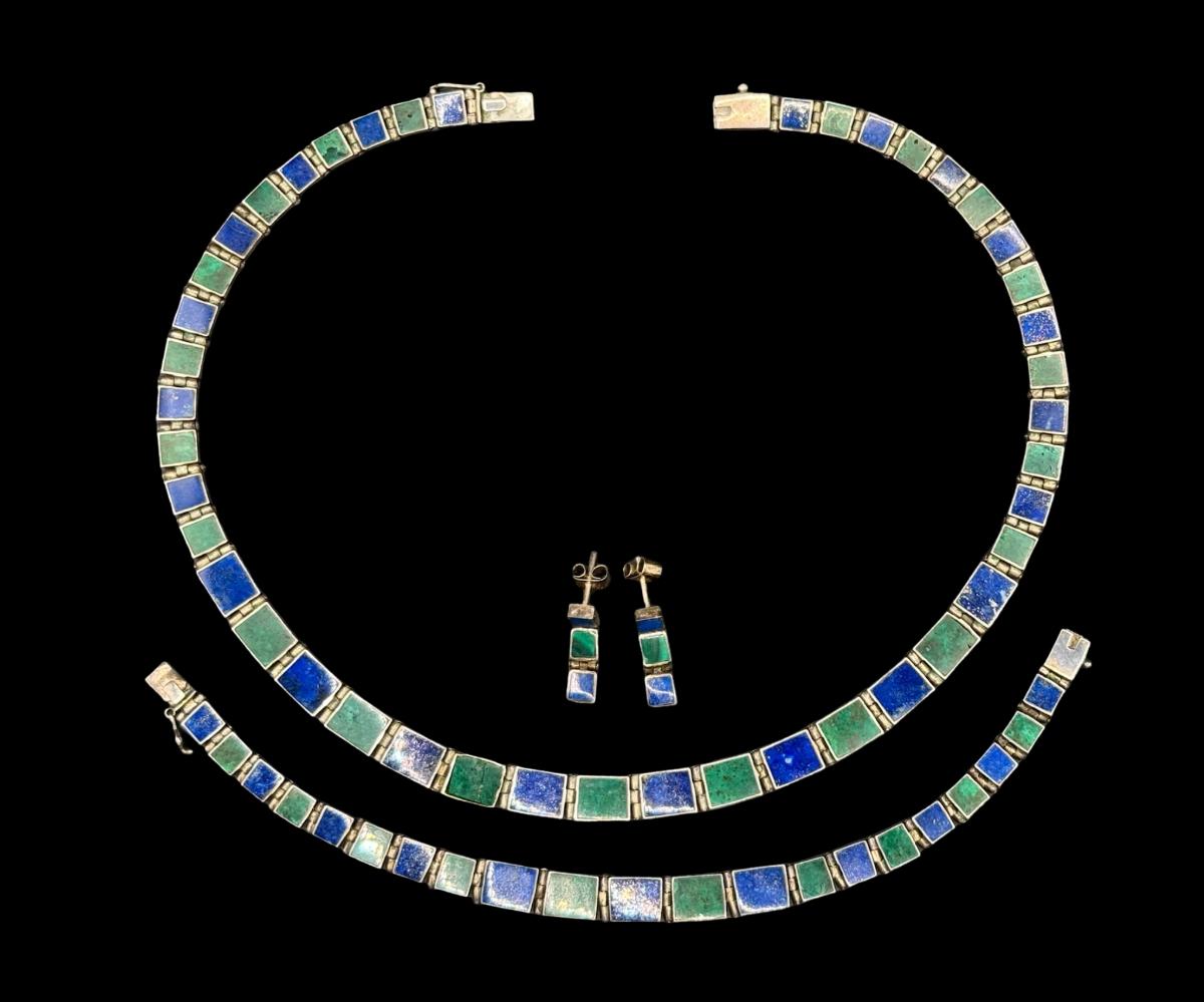 **WIRE TRANSFER IS REQUIRED IF SHIPPED.** [48.25g] Includes a necklace, bracelet, and earrings. These pieces feature lapis and malachite, in alternating hinged panels. Measurement of necklace: 16”L. Silver content confirmed using Niton XRF precious metals analyzer. **ALL PRECIOUS METALS SALES ARE FINAL. NO REFUNDS WILL BE GIVEN FOR ANY REASON.** [JL]