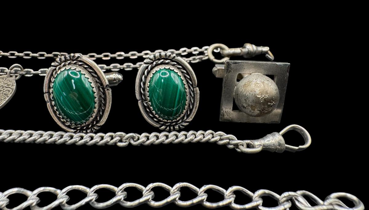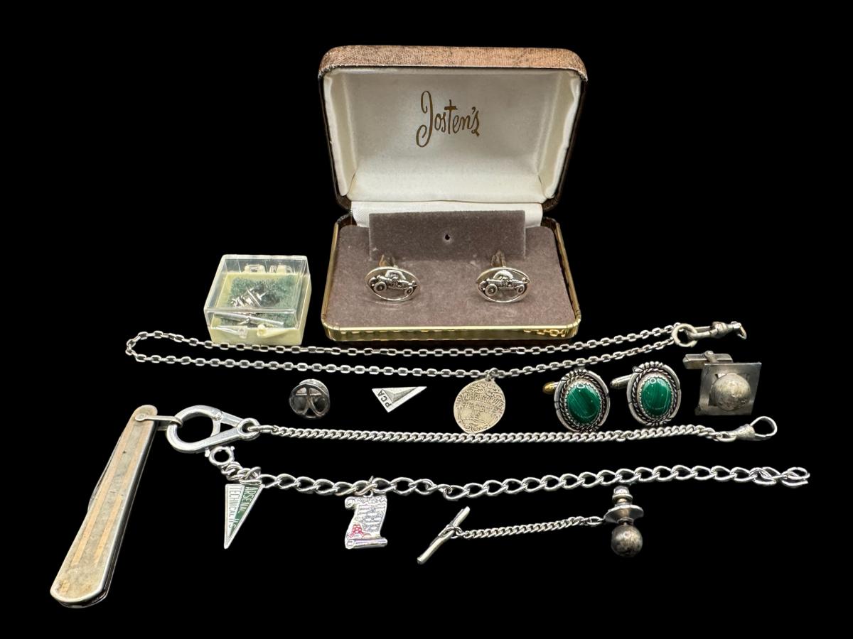 **WIRE TRANSFER IS REQUIRED IF SHIPPED.** [69.32g] Includes a pocket knife on a fob, cufflinks, pins, tie tacks, and more. Some pieces have age related wear. Weight is overall. Pin backs were removed before weighing. Silver content confirmed using Niton XRF precious metals analyzer. **ALL PRECIOUS METALS SALES ARE FINAL. NO REFUNDS WILL BE GIVEN FOR ANY REASON.** [JL]
