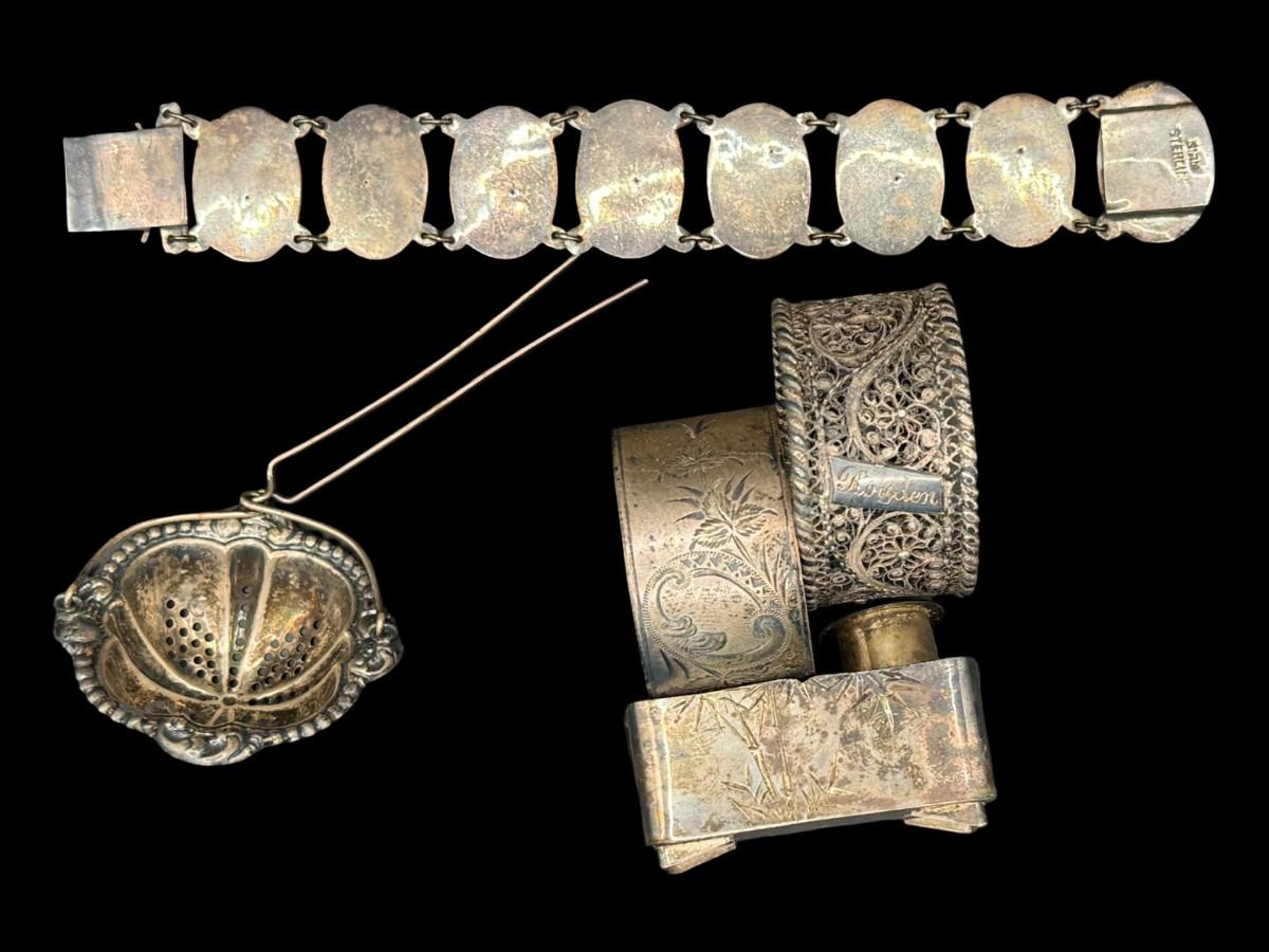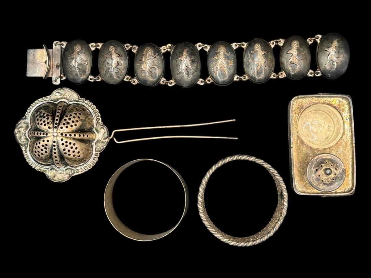 [136g] Includes napkin rings, a Siam bracelet, a tea basket, and a Japanese Meiji salt service. Total of five pieces. Silver content confirmed using Niton XRF precious metals analyzer. [KD]