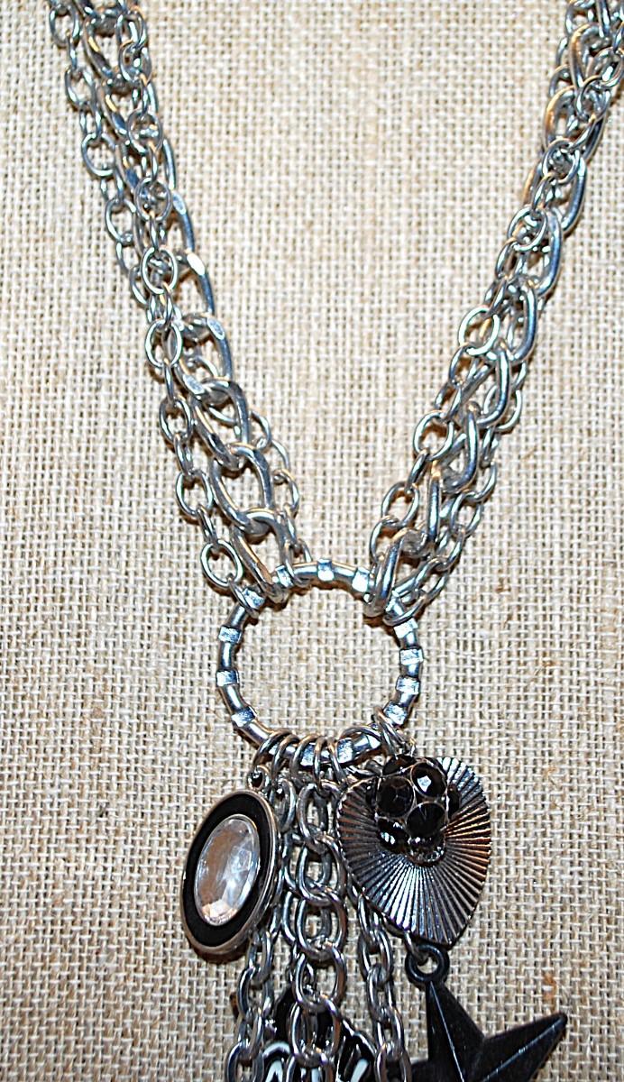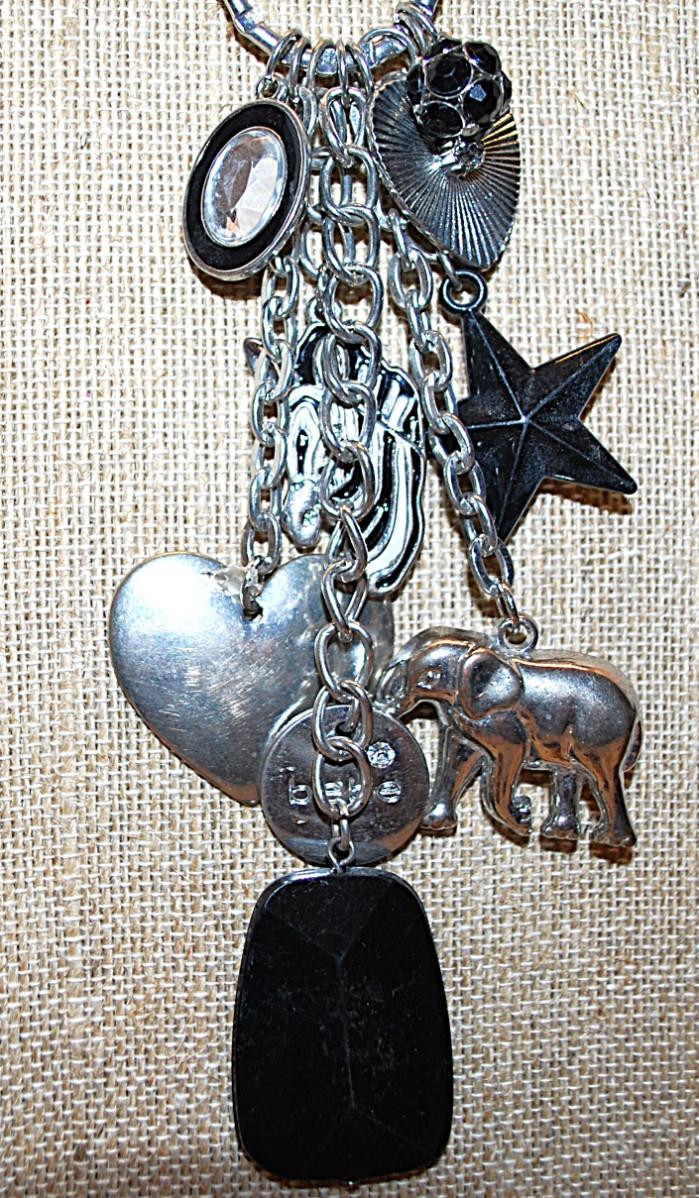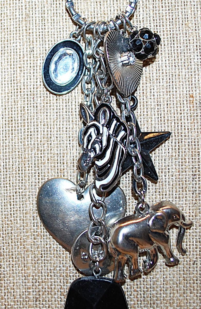 Marked "©bebe'' CHARMS NECKLACE with Elephant, Star, Hearts, Zebra, Bejeweled Black Ball & Oval and Lobster Clasp 36" L