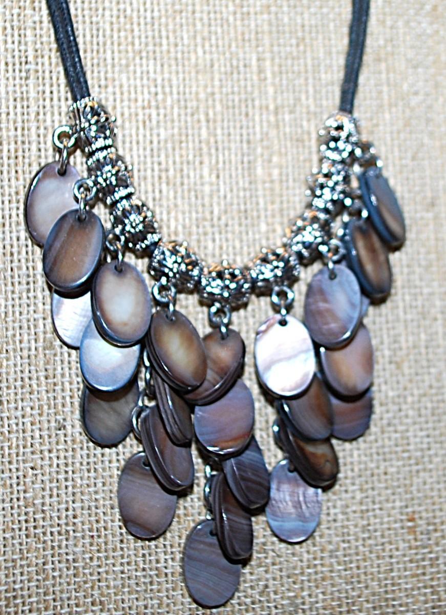 Marked "lia sophia" NECKLACE with Iridescent Style Oval Acrylic Disks + Silver Tone Barrel Accents and Cord Chain and Lobster Clasp 15" L