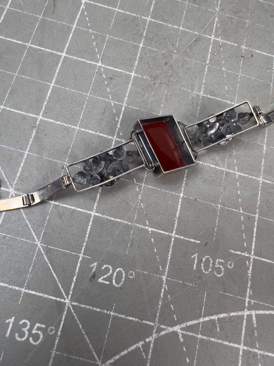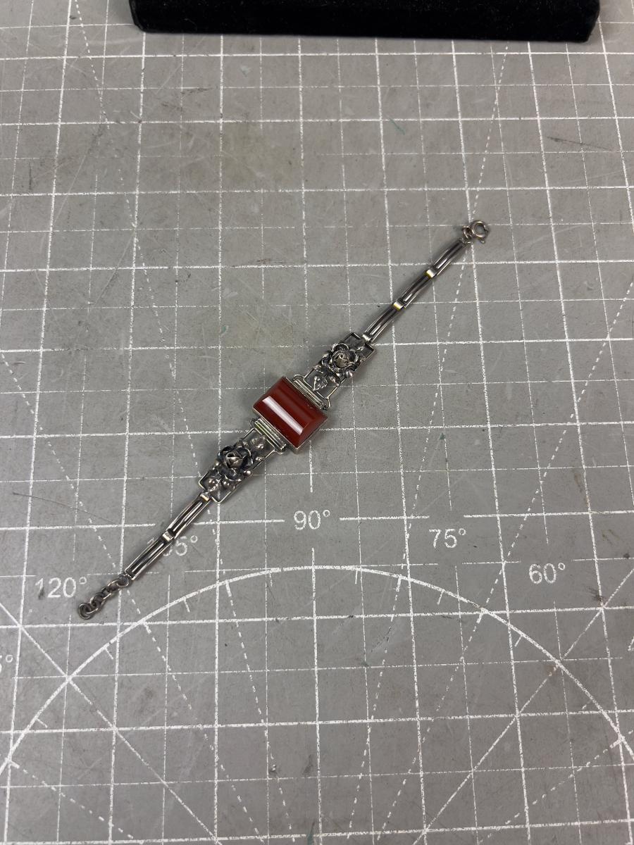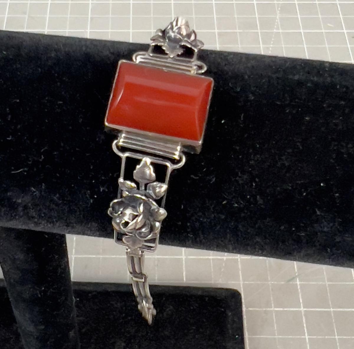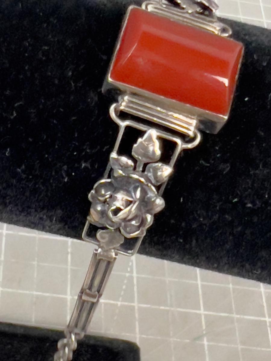 6" Long. Very Interesting. Wearable. Has a Rust Color Cut Stone. Like Carnelian