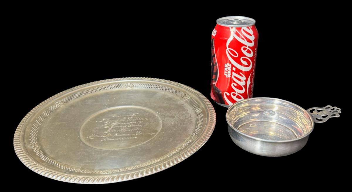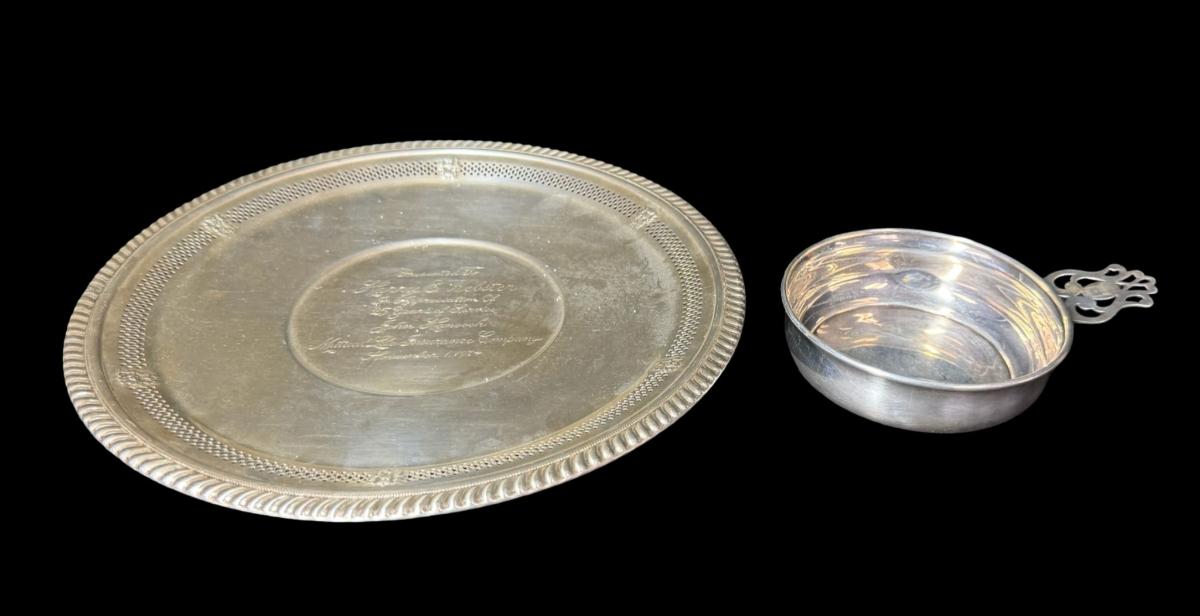 **WIRE TRANSFER IS REQUIRED IF SHIPPED.** [290g] Includes a serving tray with engraved salutation, and a porridger. Age related wear. **ALL PRECIOUS METALS SALES ARE FINAL. NO REFUNDS WILL BE GIVEN FOR ANY REASON.** [LD]