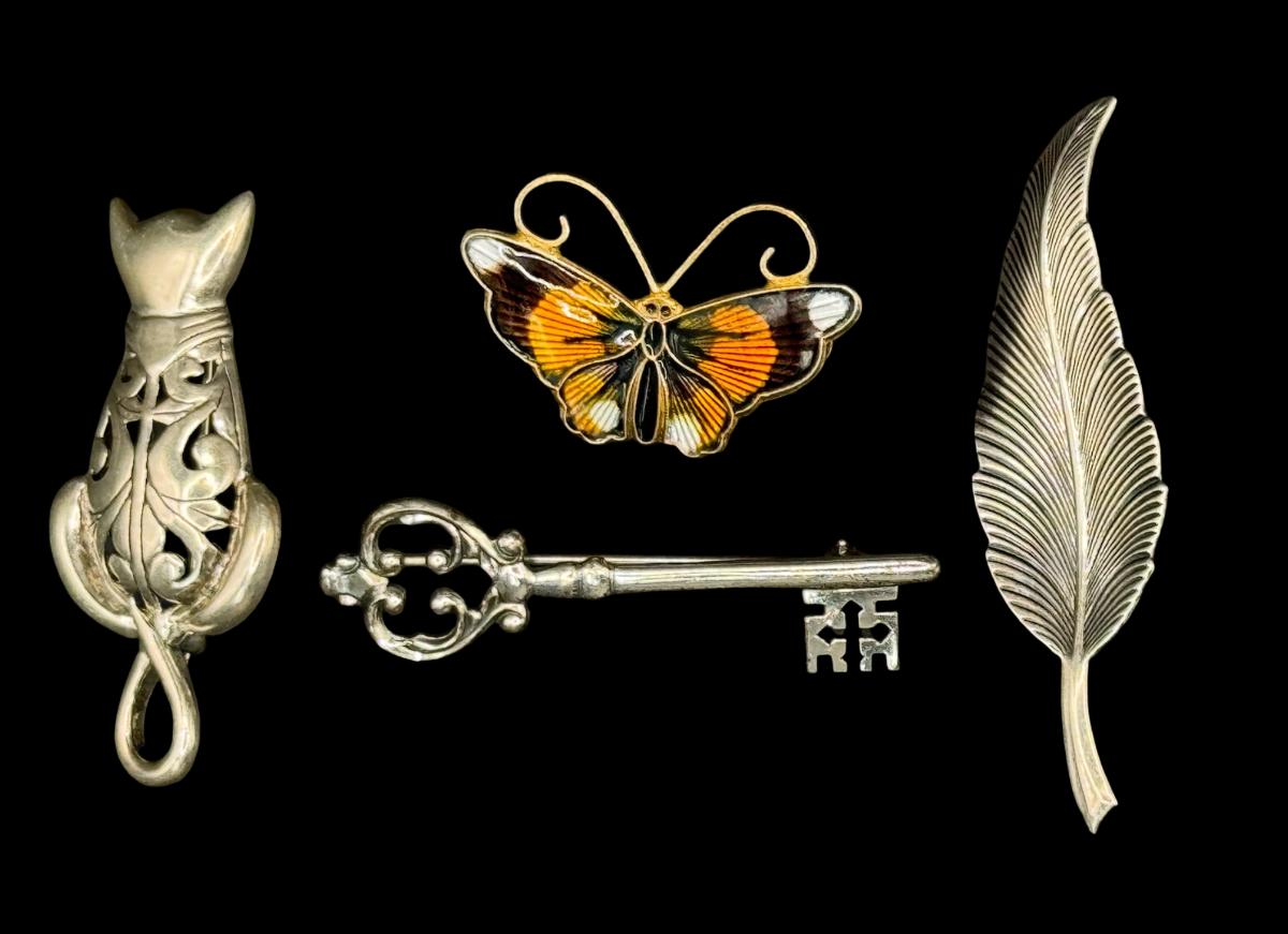 **WIRE TRANSFER IS REQUIRED IF SHIPPED.** [16.29g] Includes a vintage enameled butterfly with gold vermeil wash, a cat, a Danecraft key, and a leaf. Total of four pieces. **ALL PRECIOUS METALS SALES ARE FINAL. NO REFUNDS WILL BE GIVEN FOR ANY REASON.** [JL]