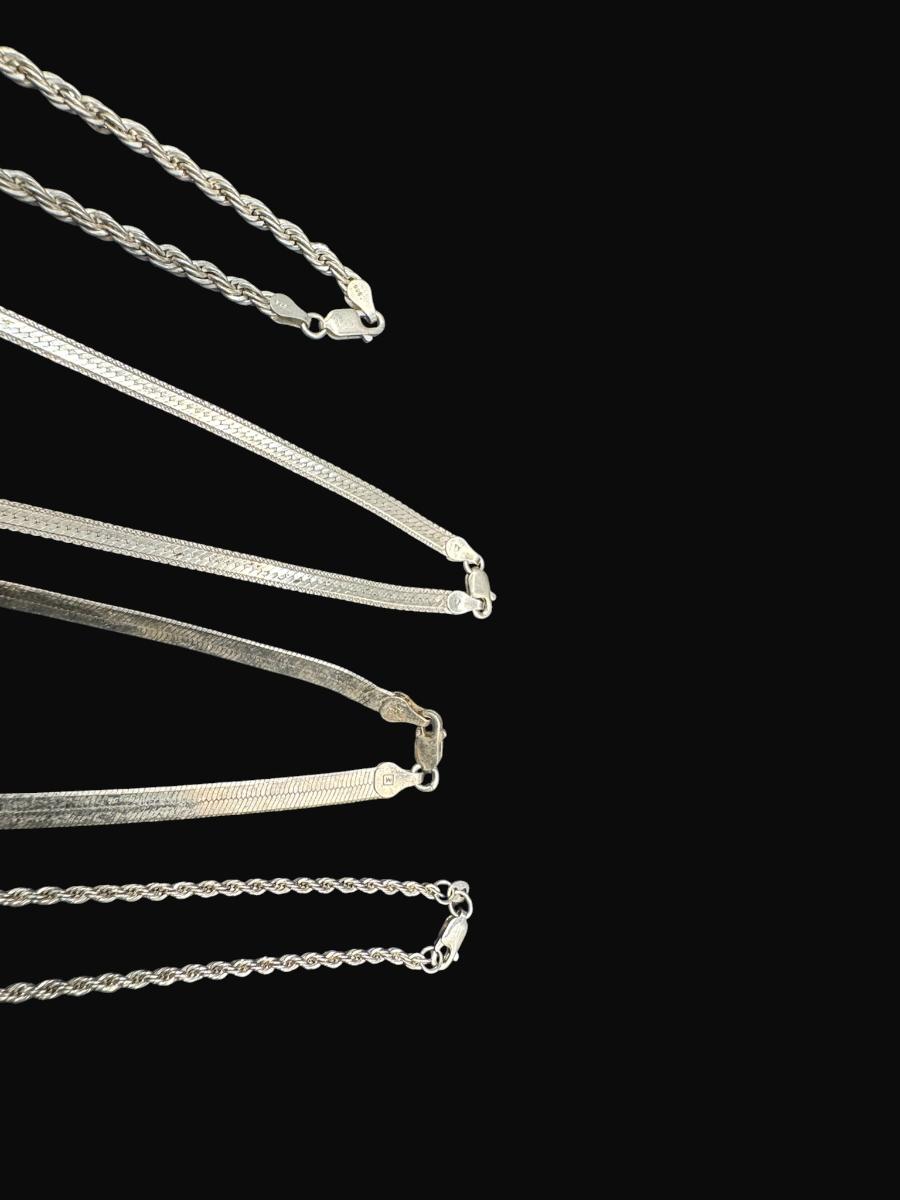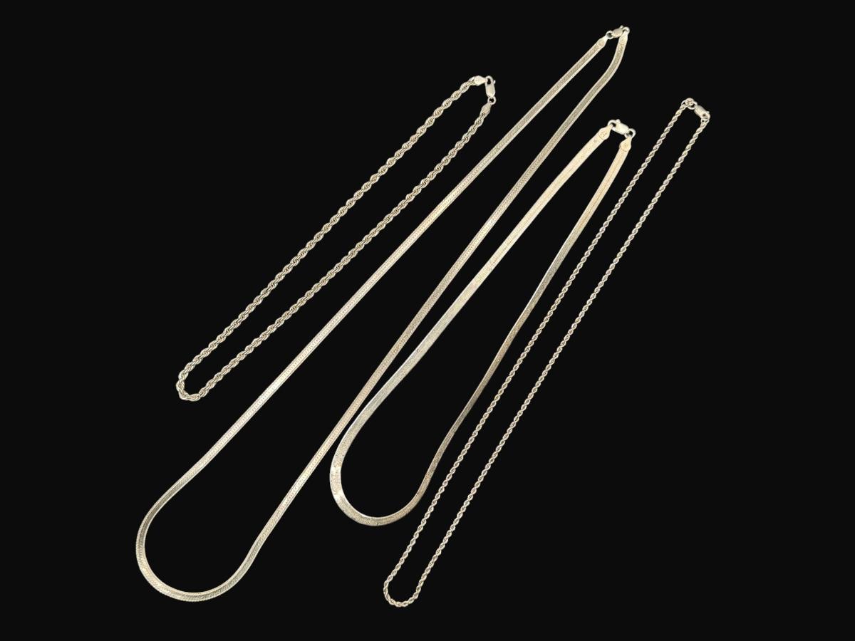 **WIRE TRANSFER IS REQUIRED IF SHIPPED.** [60.0g] Includes two herringbone chains and two twisted rope chains. Age related wear, but no repairs are needed. **ALL PRECIOUS METALS SALES ARE FINAL. NO REFUNDS WILL BE GIVEN FOR ANY REASON.** [AG]