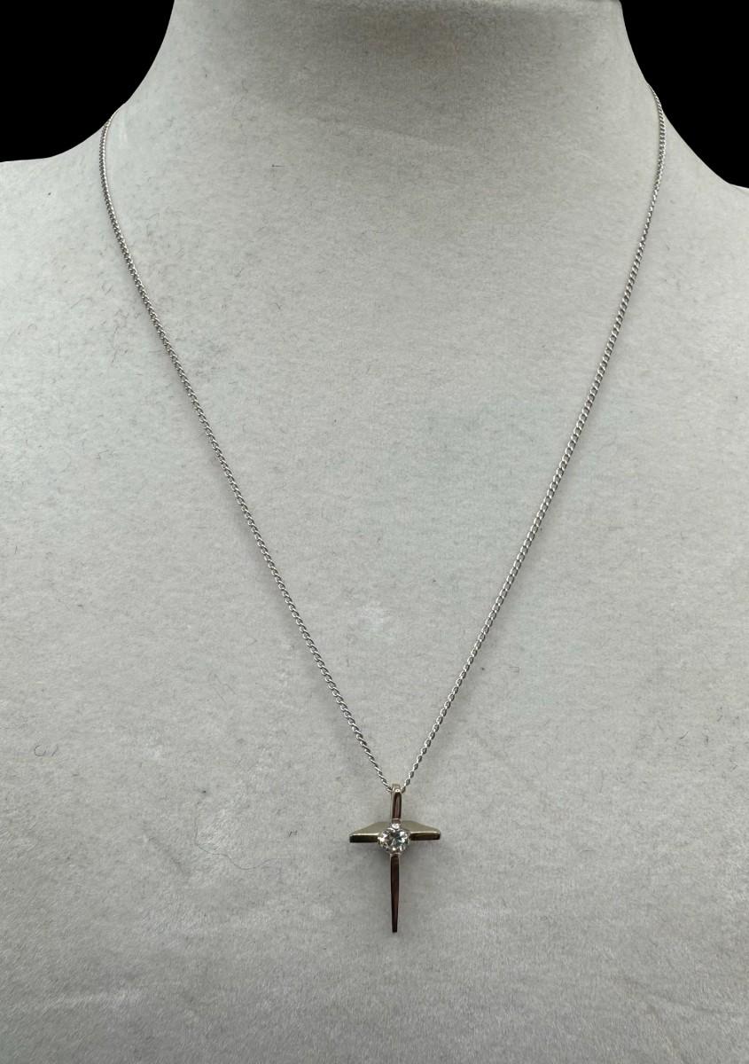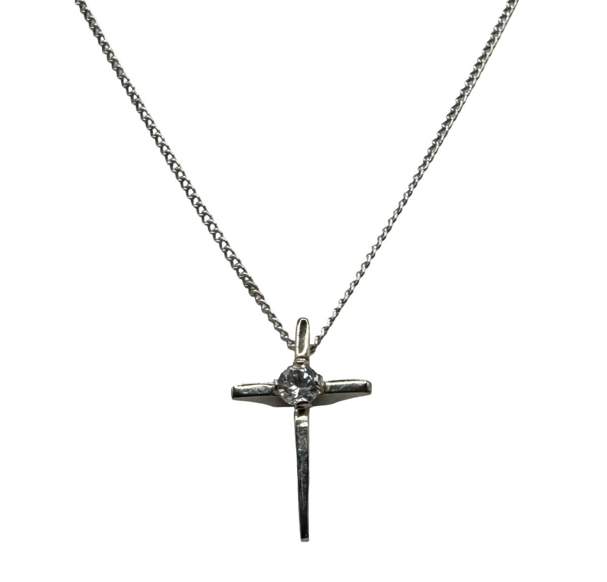 [1.87g] The pendant is a cross with a clear stone, and is marked “Sterling, Chapel.” The cable chain is marked “sterling,” and measures 15 inches long. [BK]