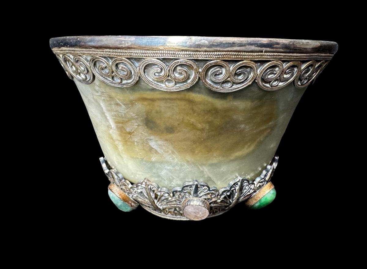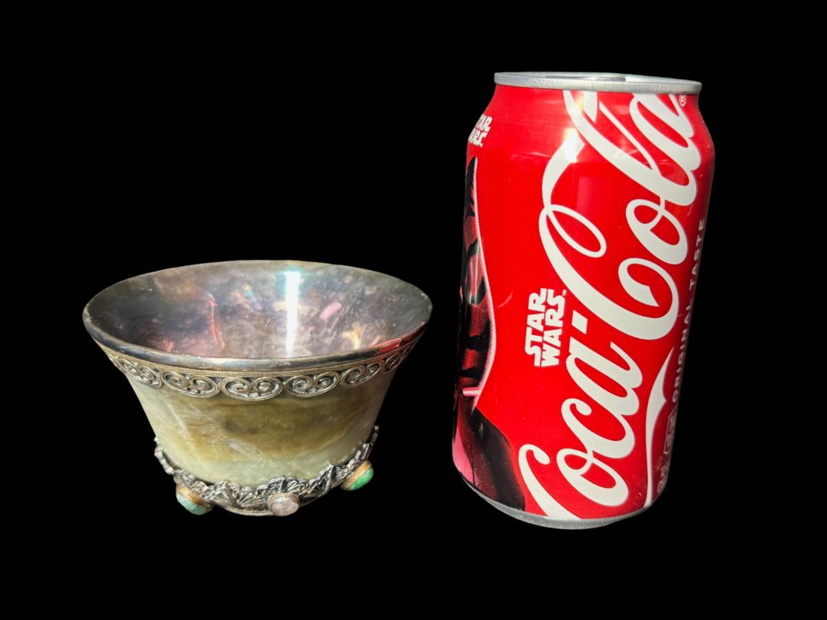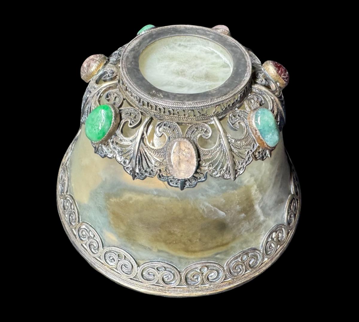 **WIRE TRANSFER IS REQUIRED IF SHIPPED.** [170g] This piece is sterling silver with a shell overlay. It also has cabochon stones of amethyst, jadeite, moonstone, and more at the base. Measurement: 3.5”H x 3.75” Diameter. Pre-auction estimate: $200-$300. **ALL PRECIOUS METALS SALES ARE FINAL. NO REFUNDS WILL BE GIVEN FOR ANY REASON.** [JL]