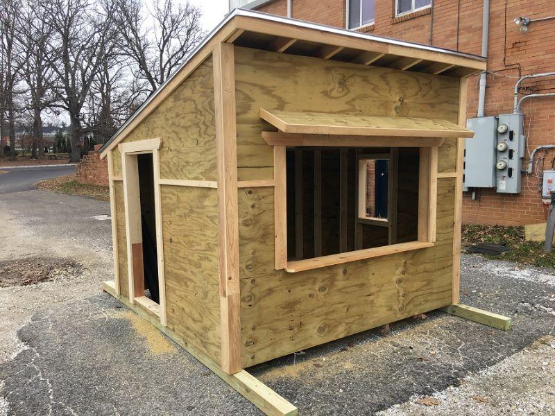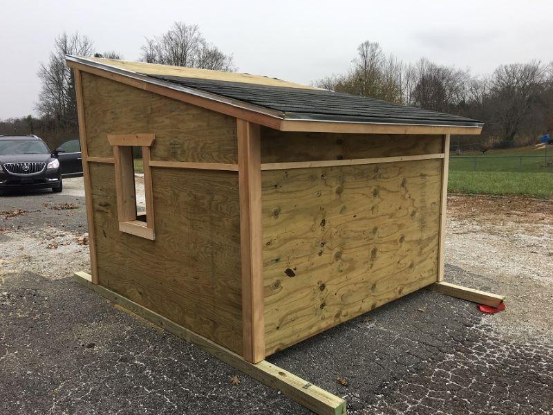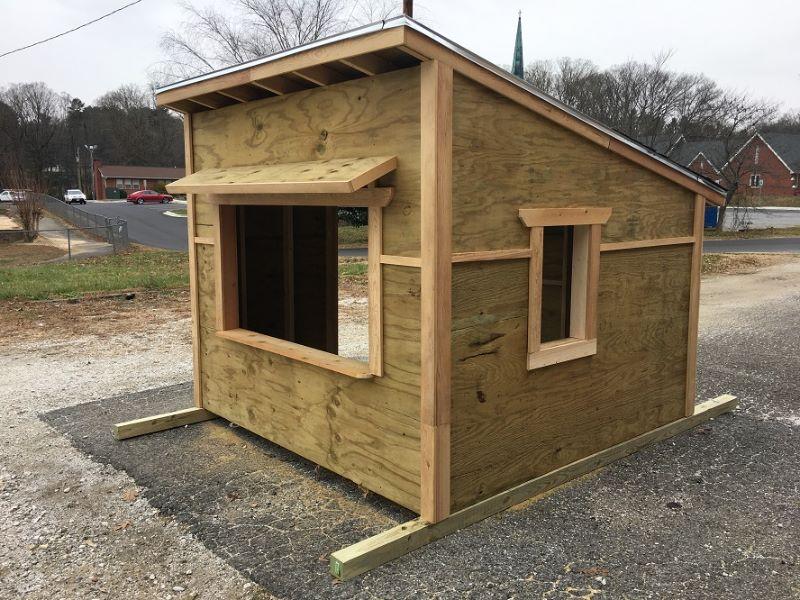 This Sturdy 8' x 8' x 7' Wood Playhouse was built by Steven and Terry King and Joan and Kevin Rickert with materials donated by the Garage on 25. The front window sports a roof overhang and window overhang. There is a framed side doorway on the left side and a framed window on the right. The back is solid wood and sports another overhang. The interior is roomy and big enough for a few kids to get together and play and/or to allow plenty of room to set up store shelfs so they can open for business. The roof is fully shingled. No side door allows adults to keep an eye on children playing inside. The exterior has been left unpainted so that it can be customized to your favorite entrepreneur's desired look. The interior awaits your favorite color hue or vintage grocery posters/signs, reclaimed board game boards, children's art, etc. - Add shelving and grocery or craft inventory - Add a table and chairs with board games or puzzles to set up hours of game playing. - Add a simple shelf base to the front window, paint a lemon on the side and your little one is ready to open their Lemonade Stand. Your possibilities are limitless. Make your bid on this sure to be popular playhouse and bring home years of backyard joys or front yard customers!