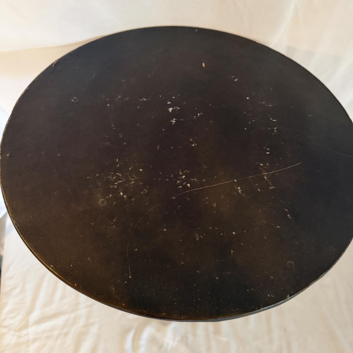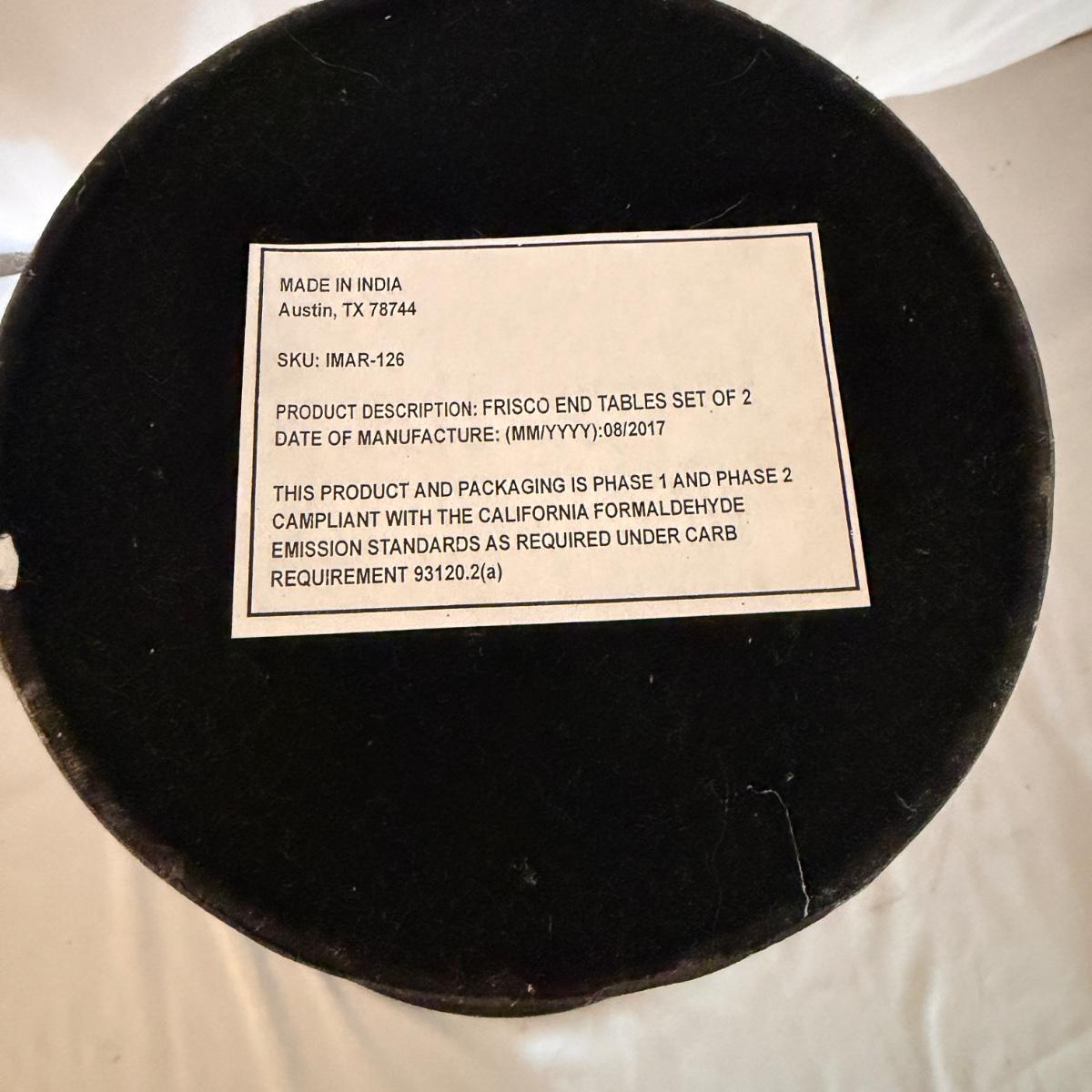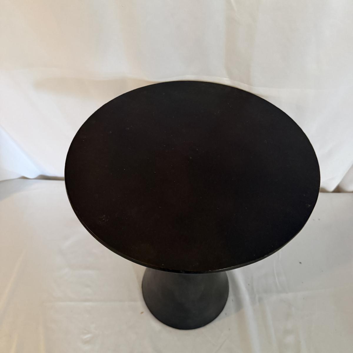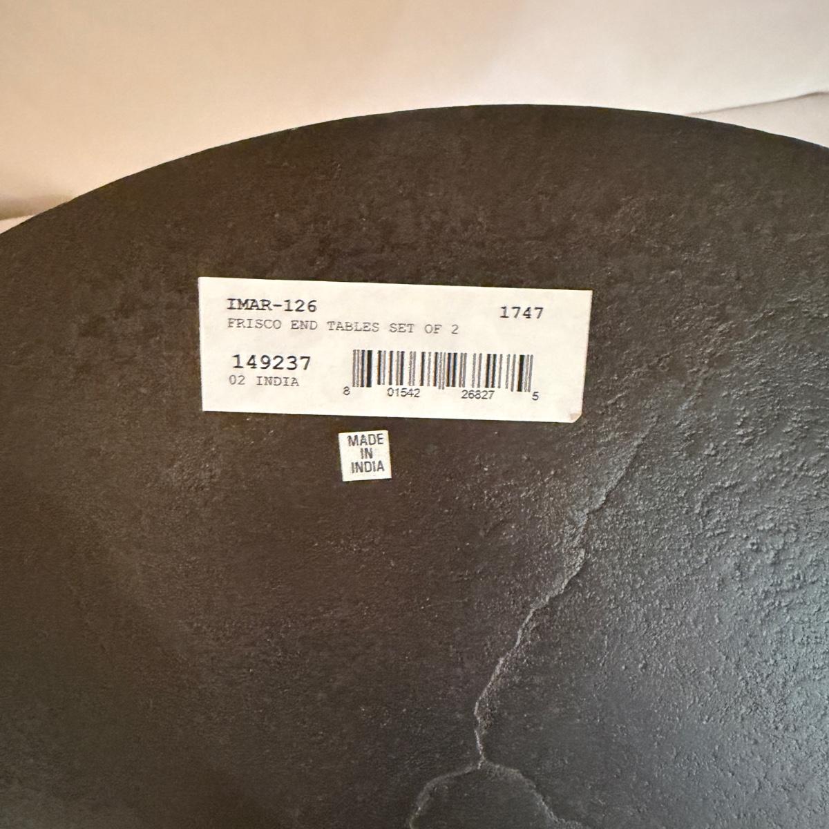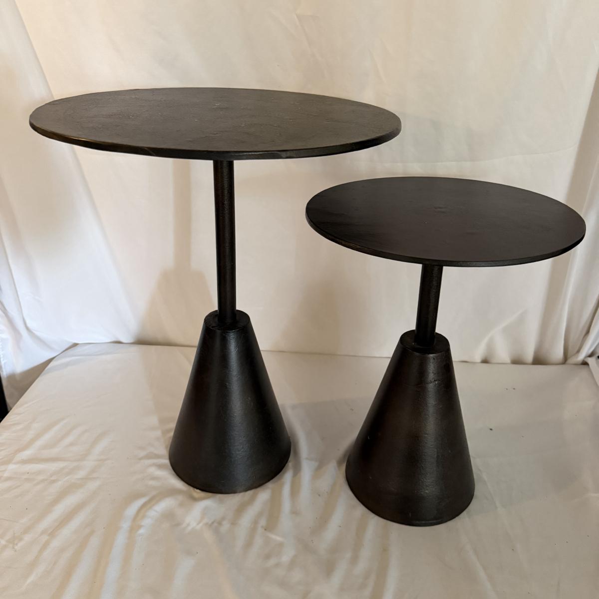 Lot includes two Marlow collection Frisco aluminum end tables. Largest table measures 16”D x 19.5”H. Largest table has nicks and scratches on top, see pictures.