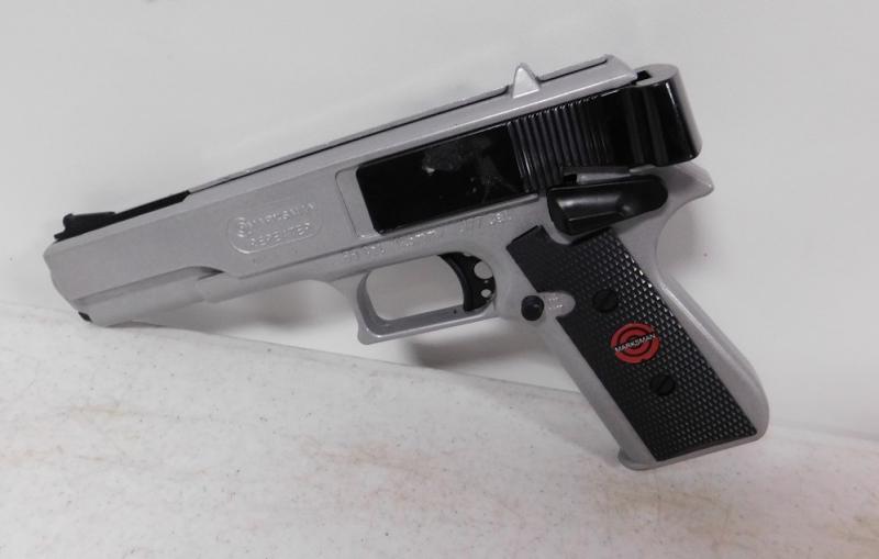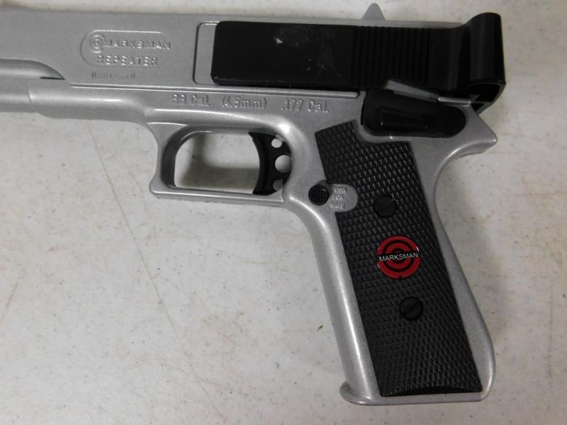 Marksman Repeater Chrome BB Gun in good condition. Has some wear areas.