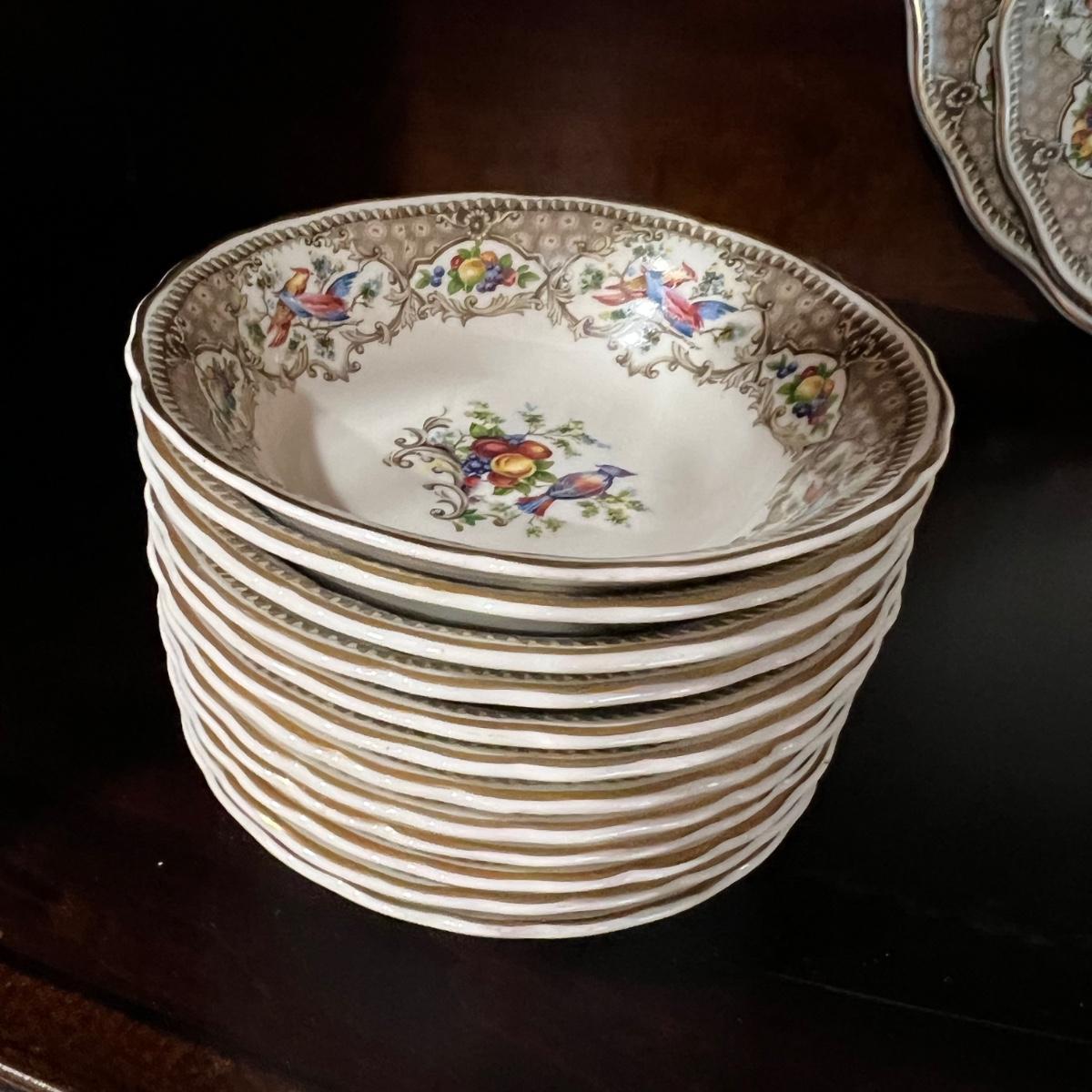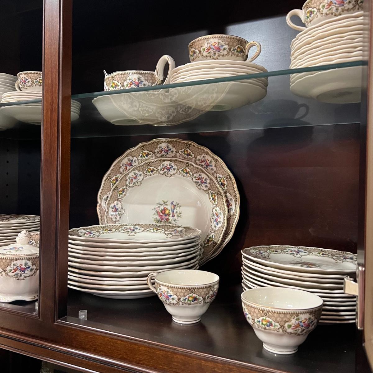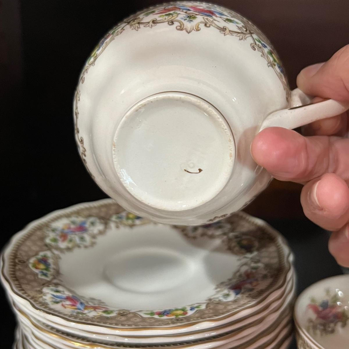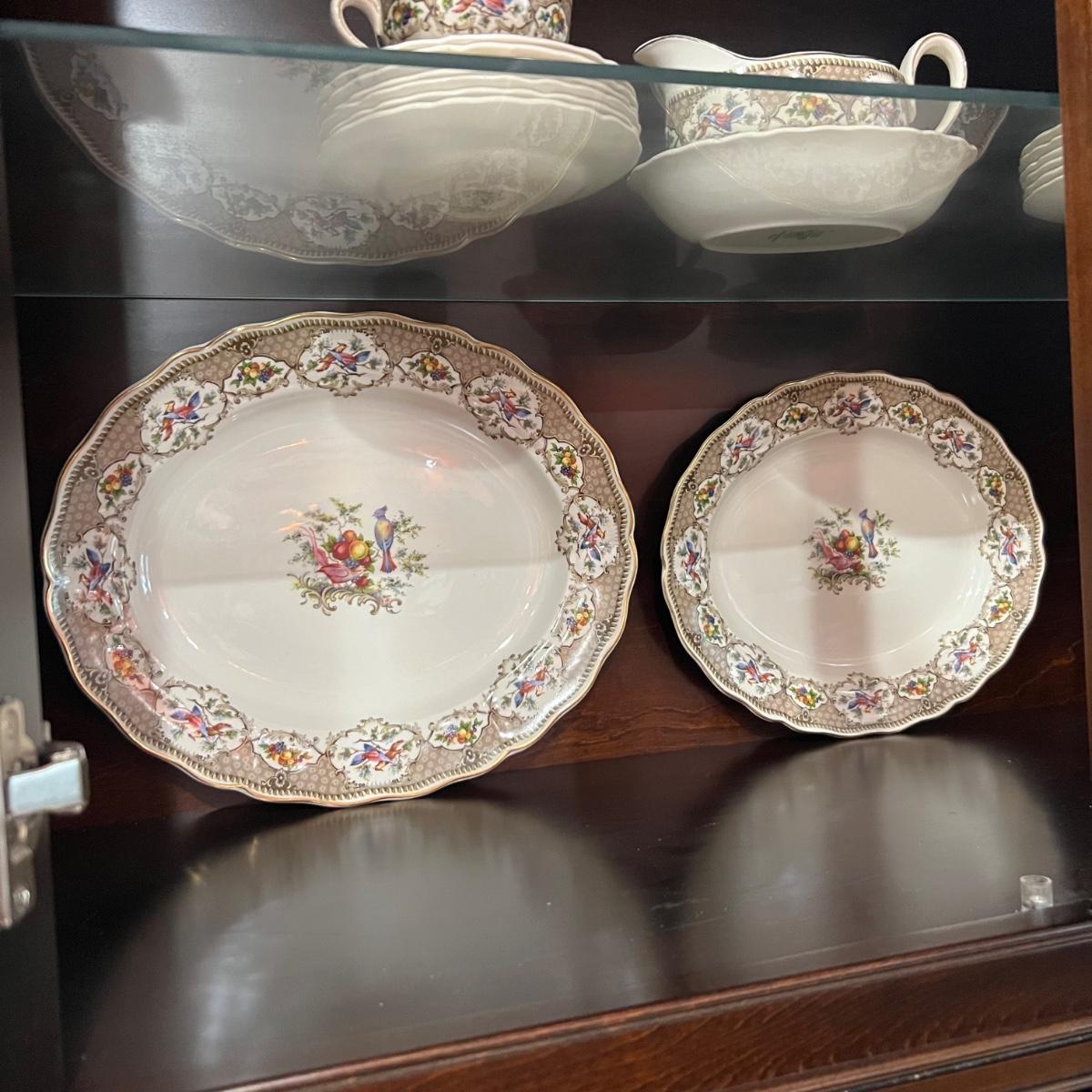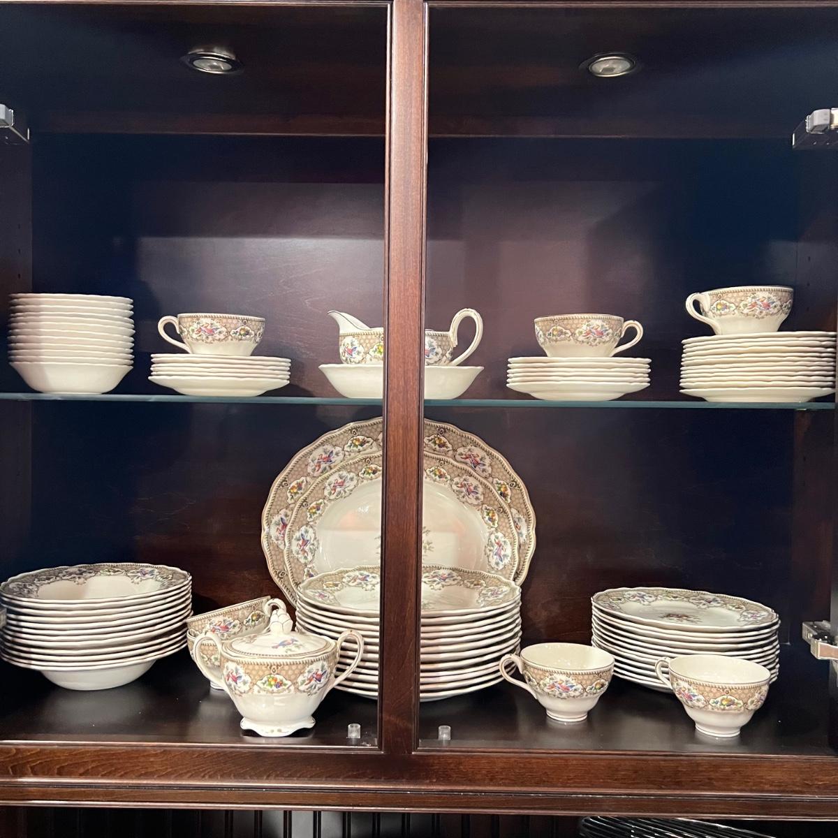 This Marlborough China dinnerware 81 piece set is the “˜Royal Petal’ design. There are 12 pieces of - dinner plates (10”), salad plates, bread plates, dessert bowls, small bowls, saucers (only seven cups) plus a large and a medium platter, gravy boat/dish and sugar bowl.. A few pieces of each have crazing or discoloration, see images. All in all, not including the blemishes pieces, this would be a ten person setting, minus cups as there are only seven.