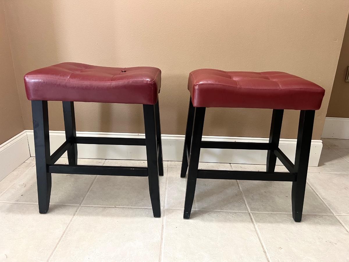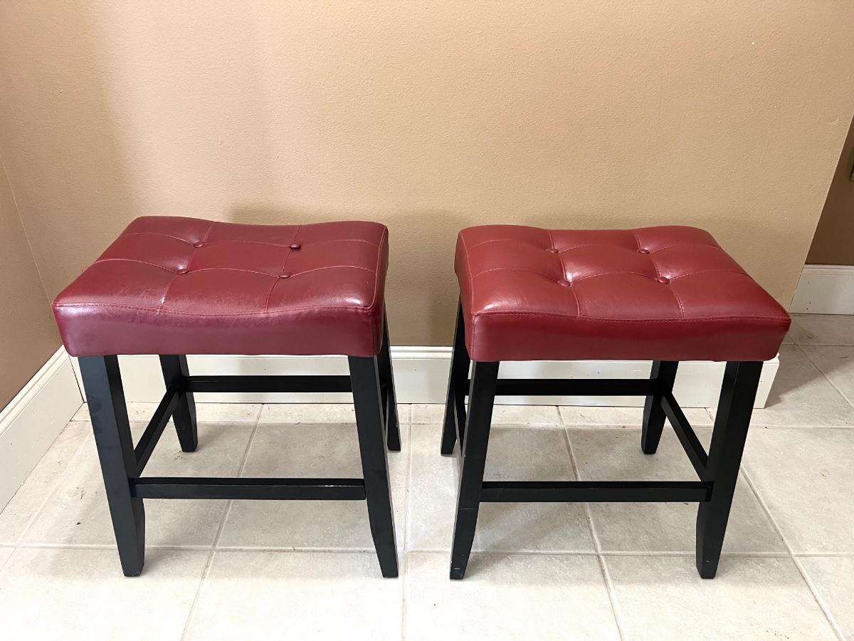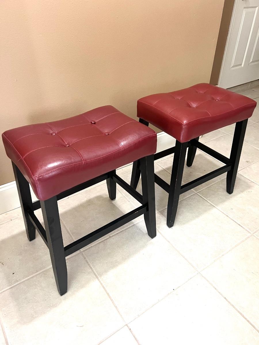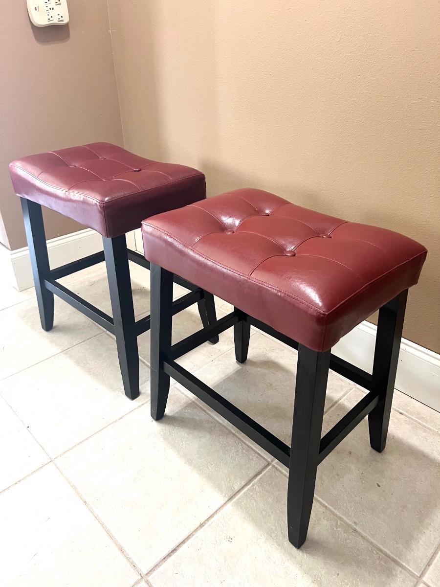 Set of two maroon and black barstools measure 25 inches tall, 20 inches wide, and 14 inches deep.