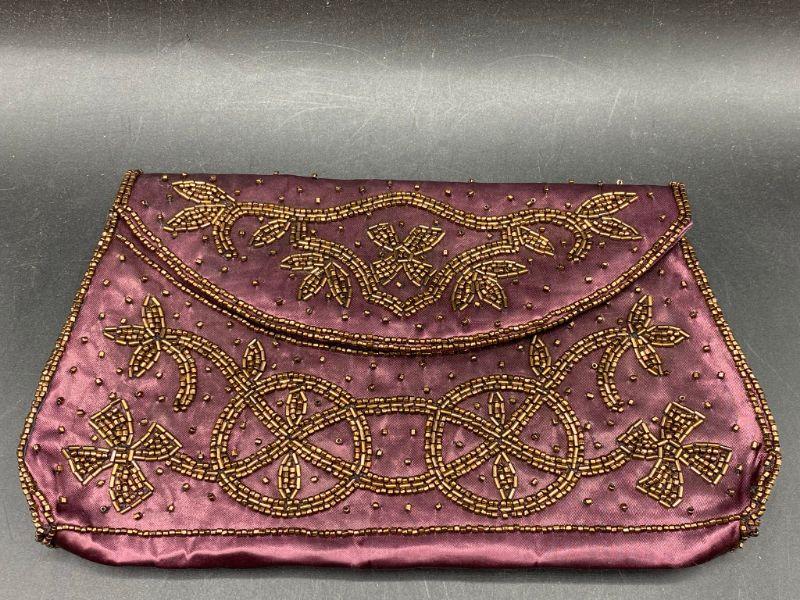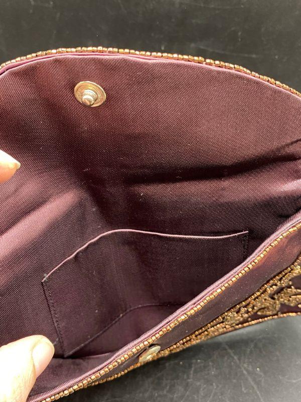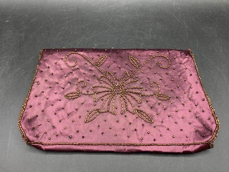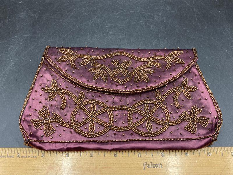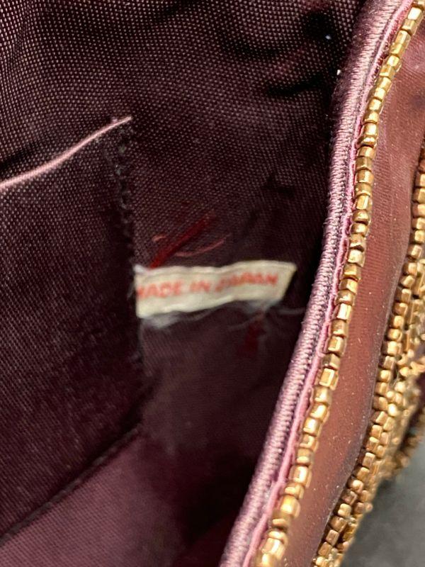 Vintage handbag clutch. Maroon/ dark red satin like fabric with gold bead work. No strap. Snap closure, mirror pocket inside. Made in Japan. About 8" across.