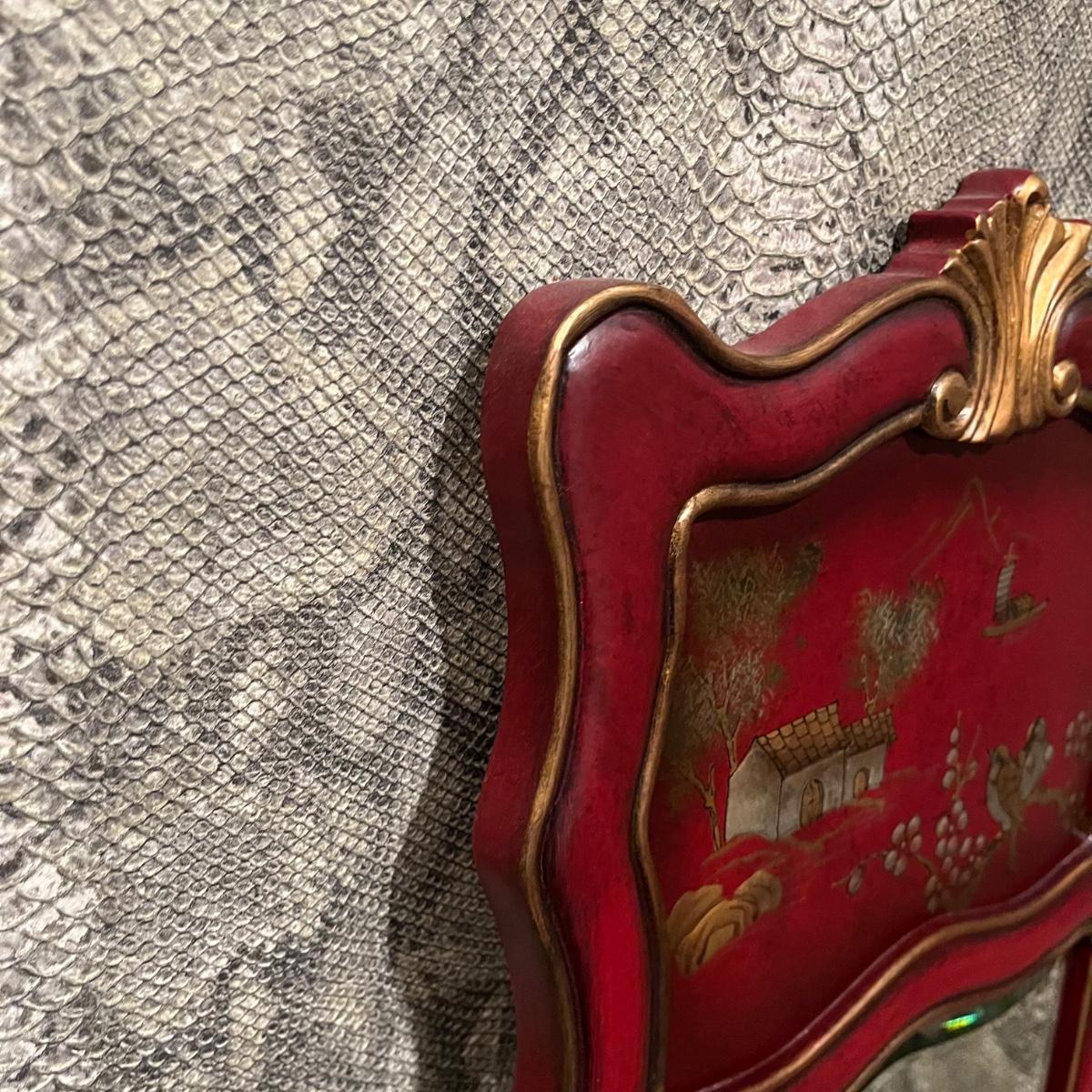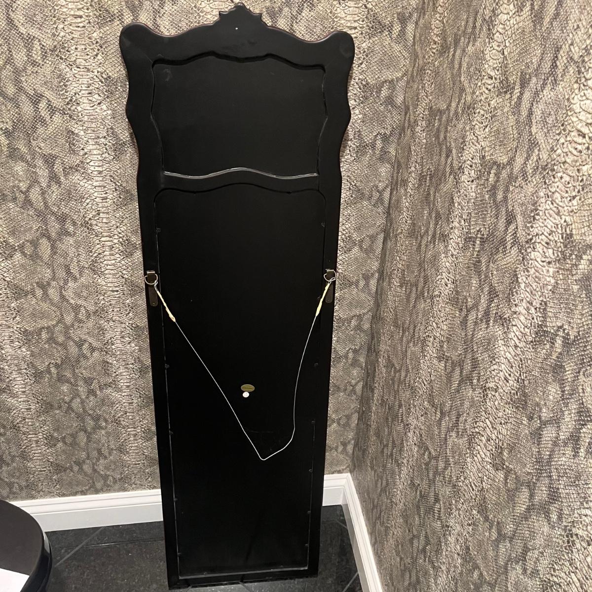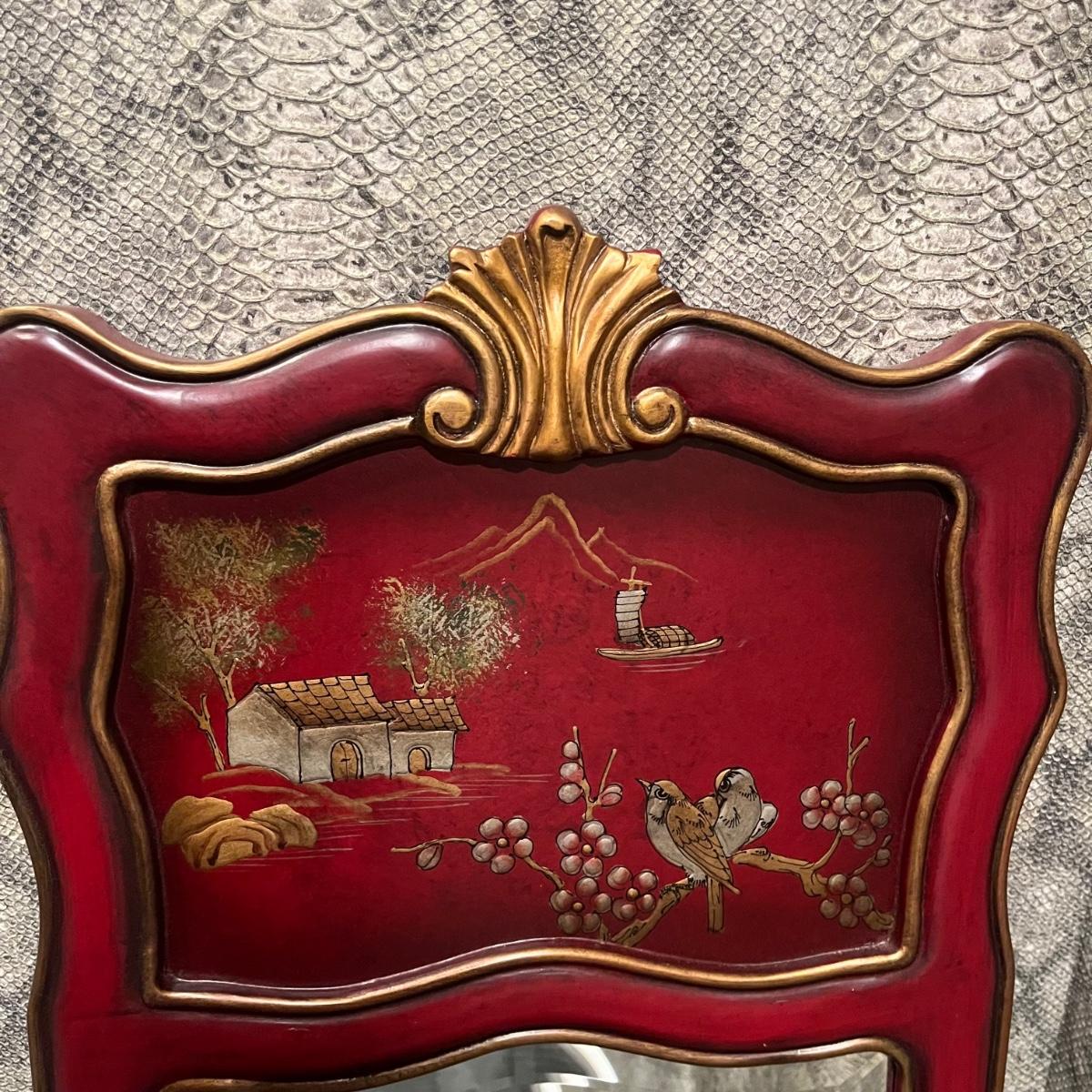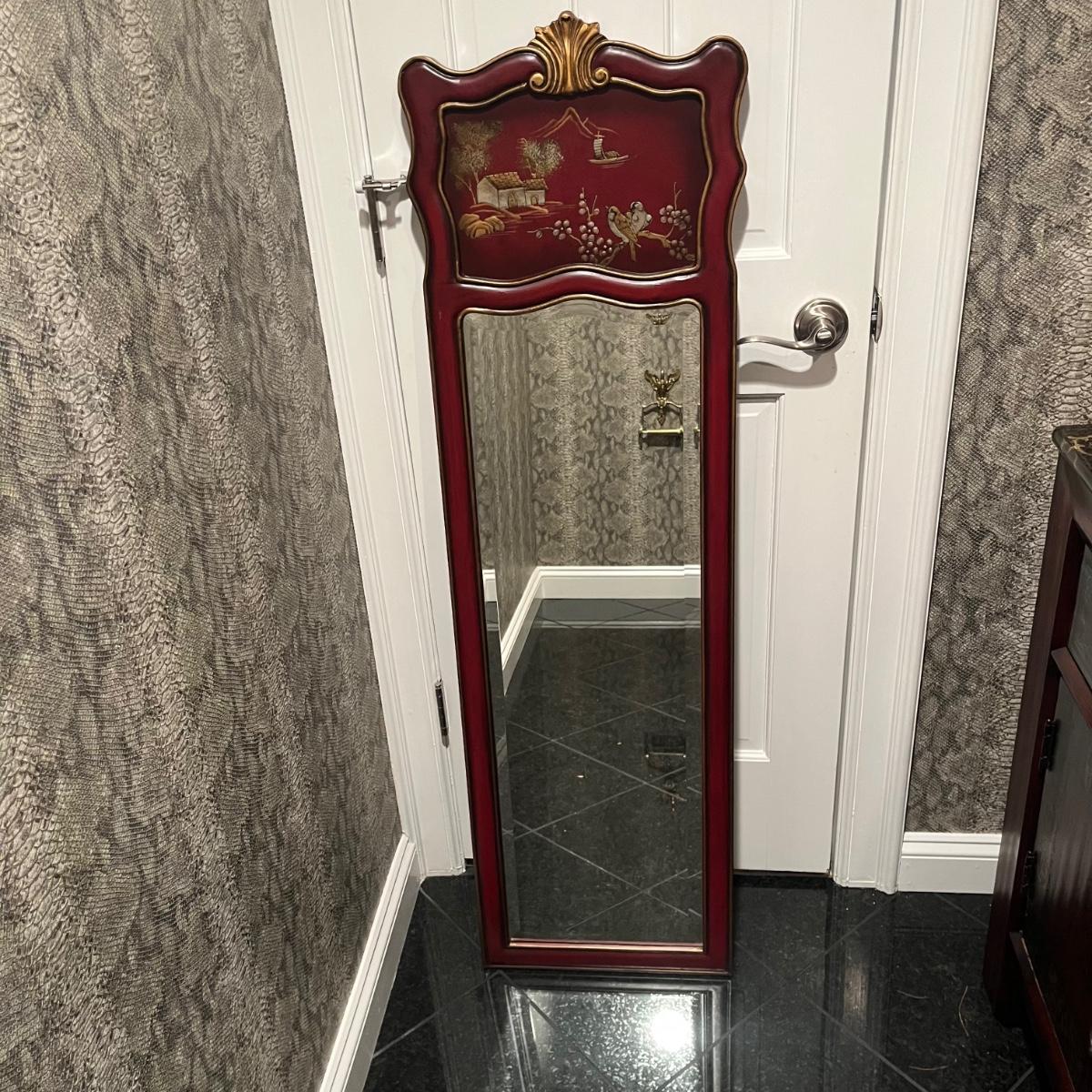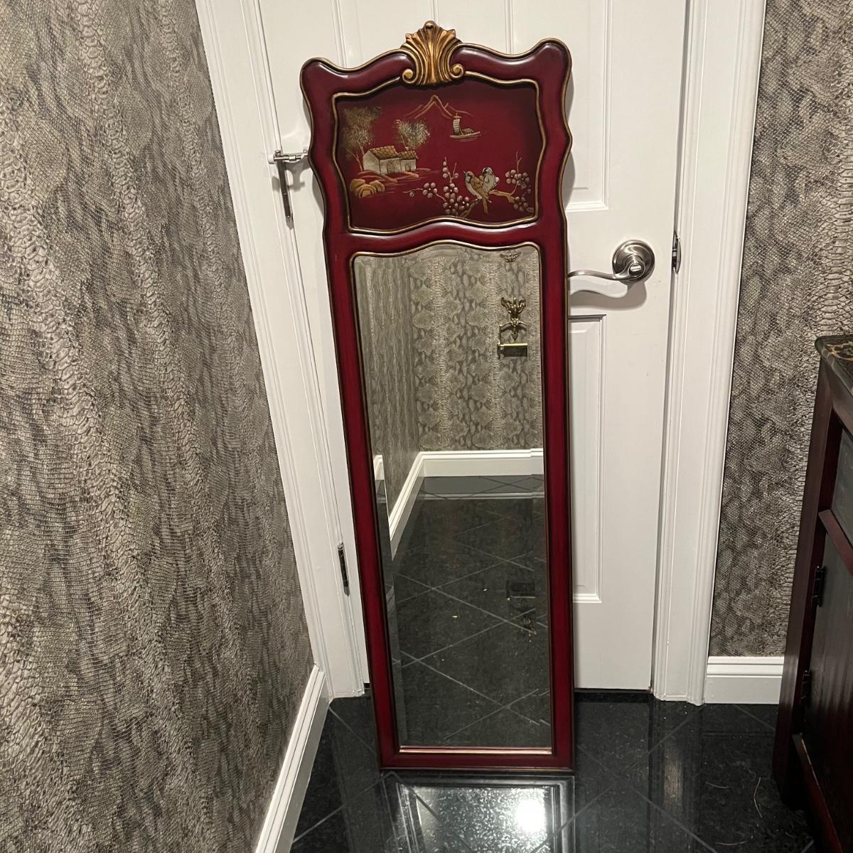 Lot includes a maroon colored wooden framed beveled mirror with a metal wastebasket with oriental design. Mirror measures 16” x 1” x 52”.