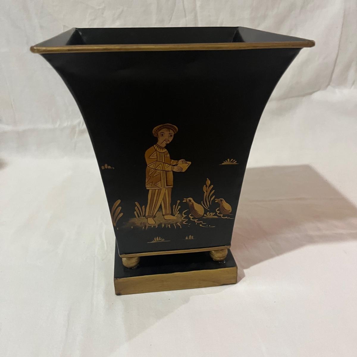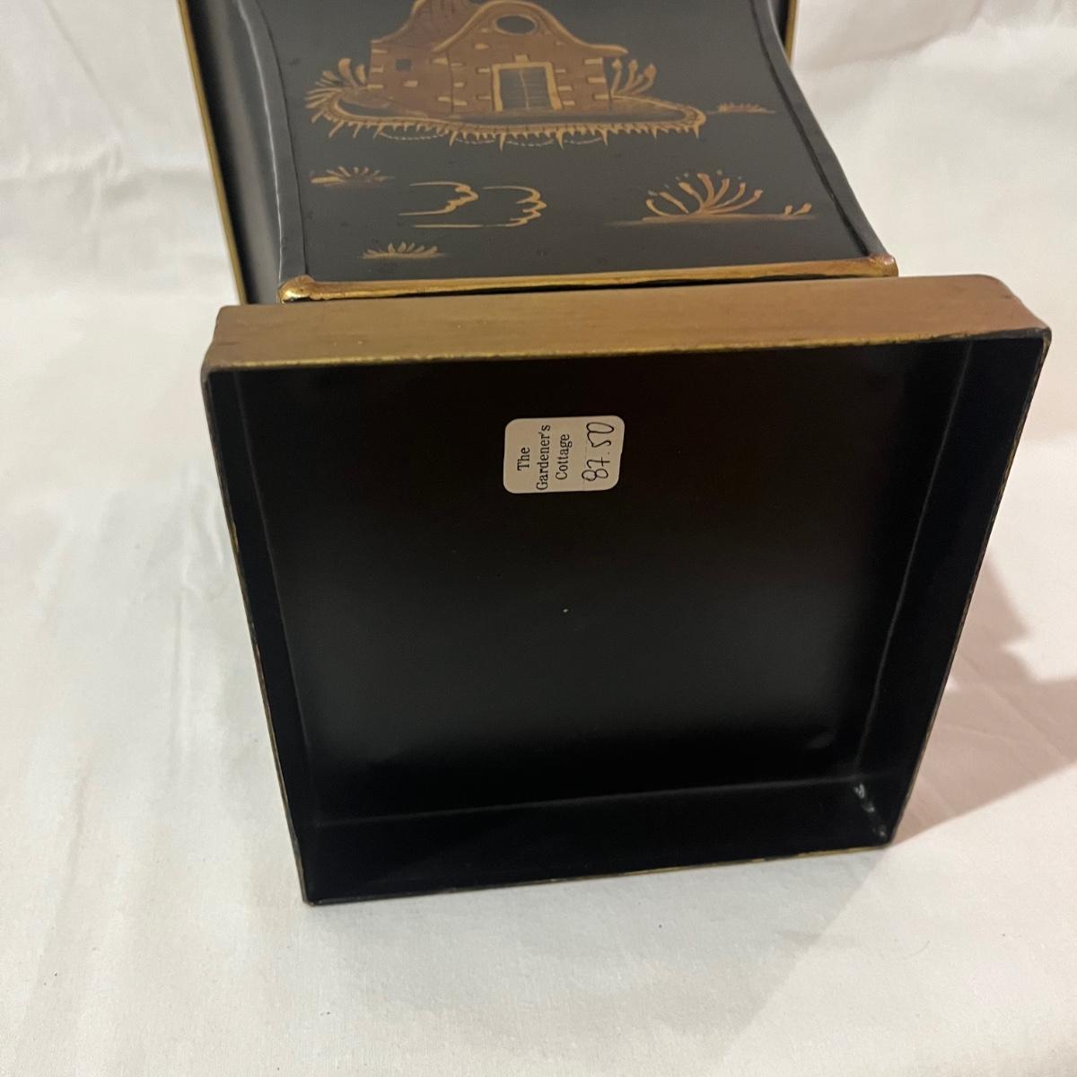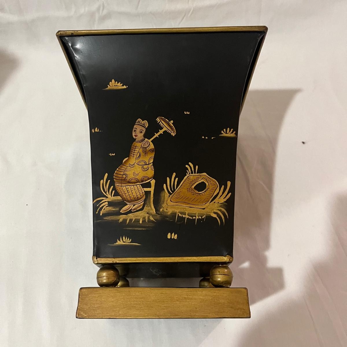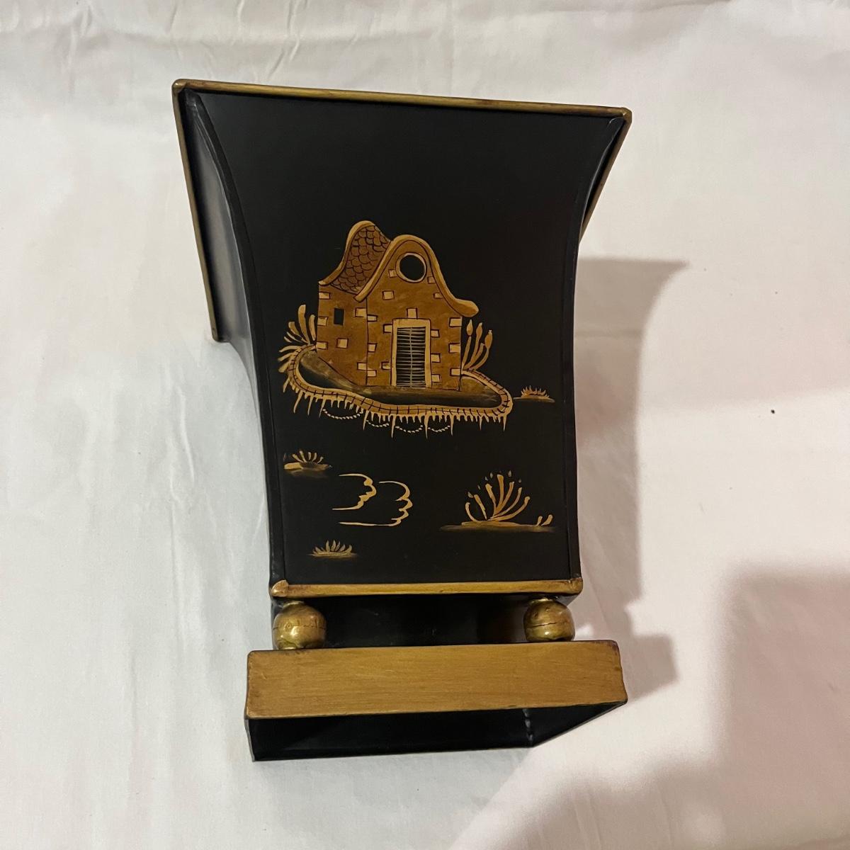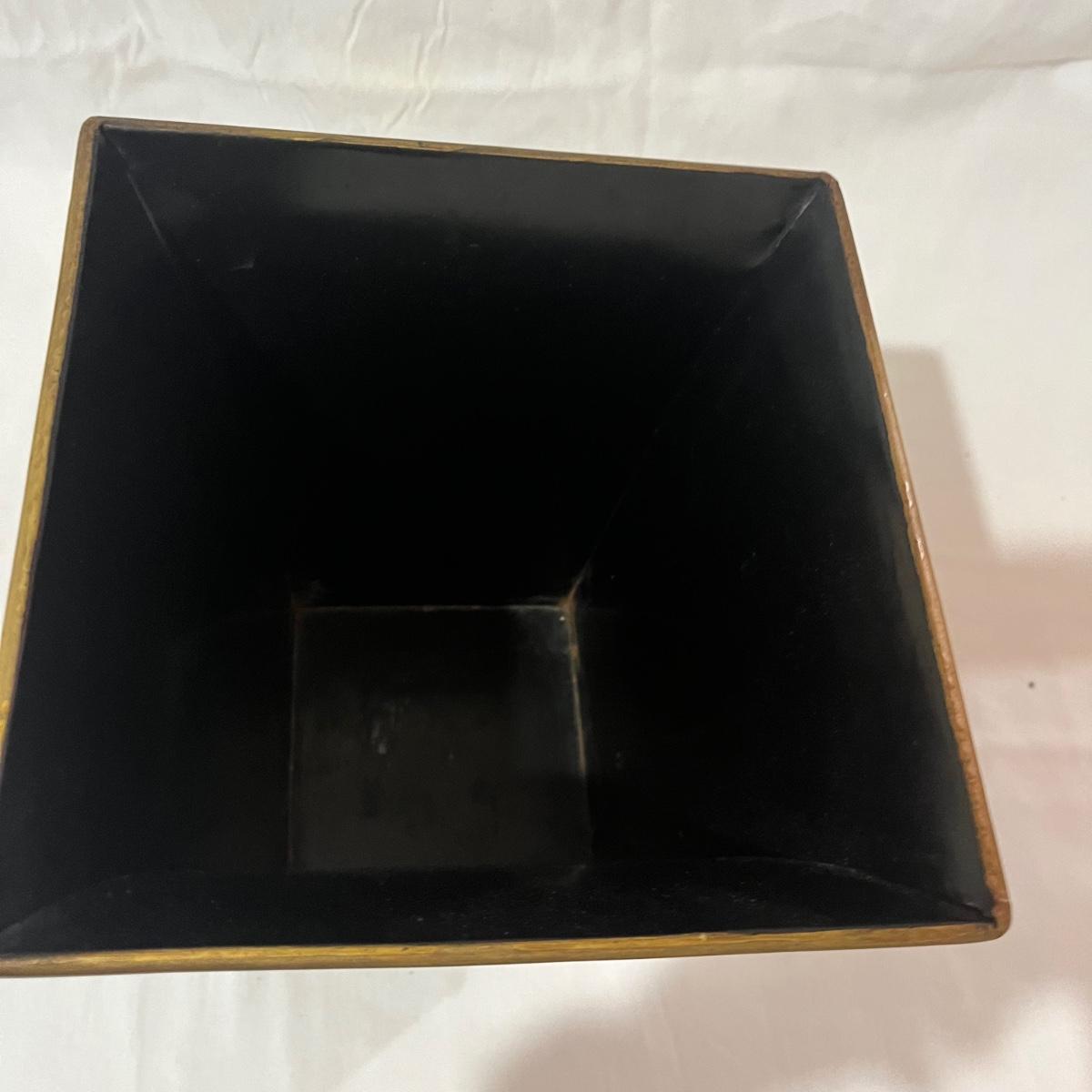 Lot includes a maroon colored wooden framed beveled mirror with a metal wastebasket with oriental design. Mirror measures 16” x 1” x 52”.