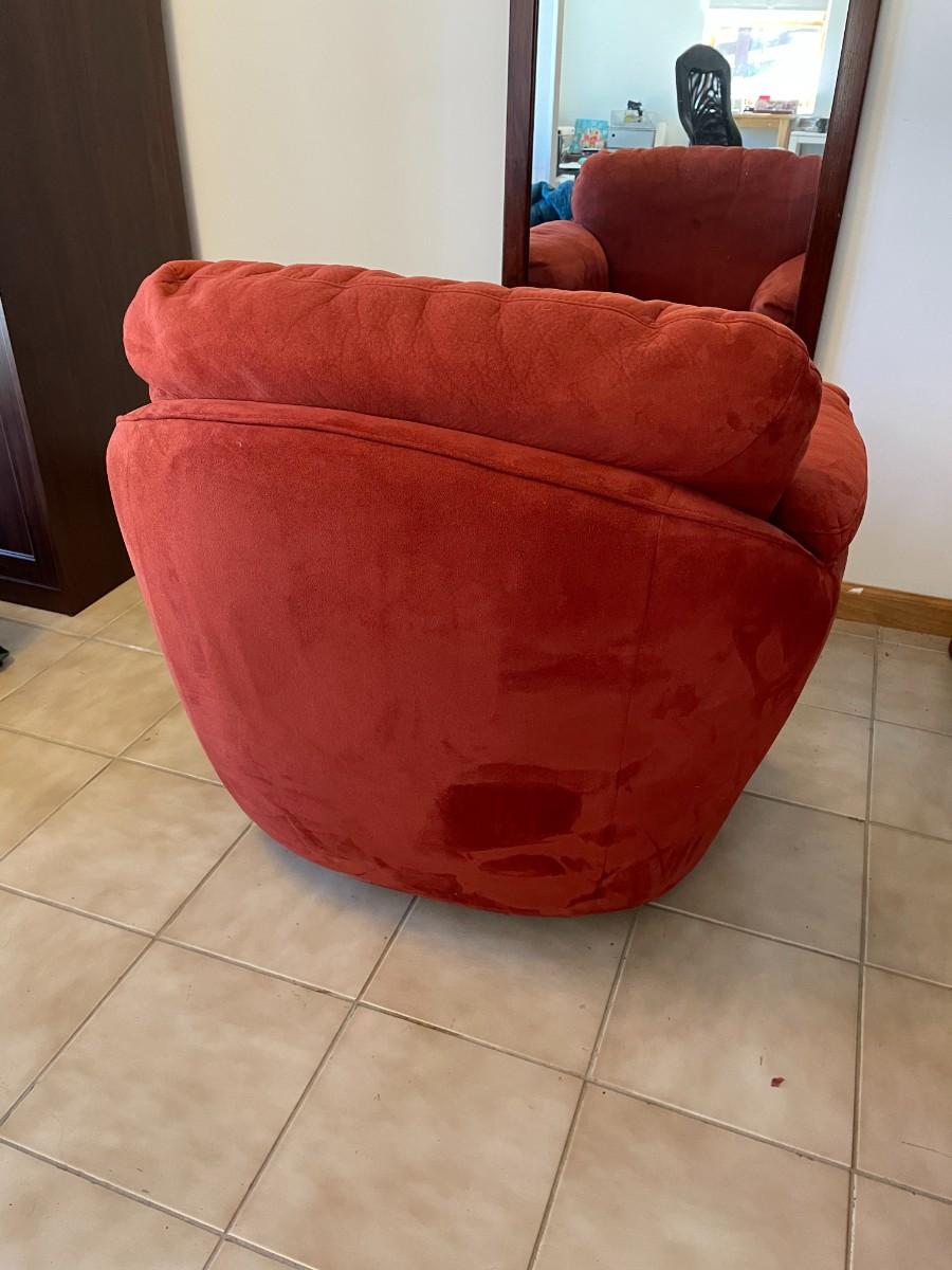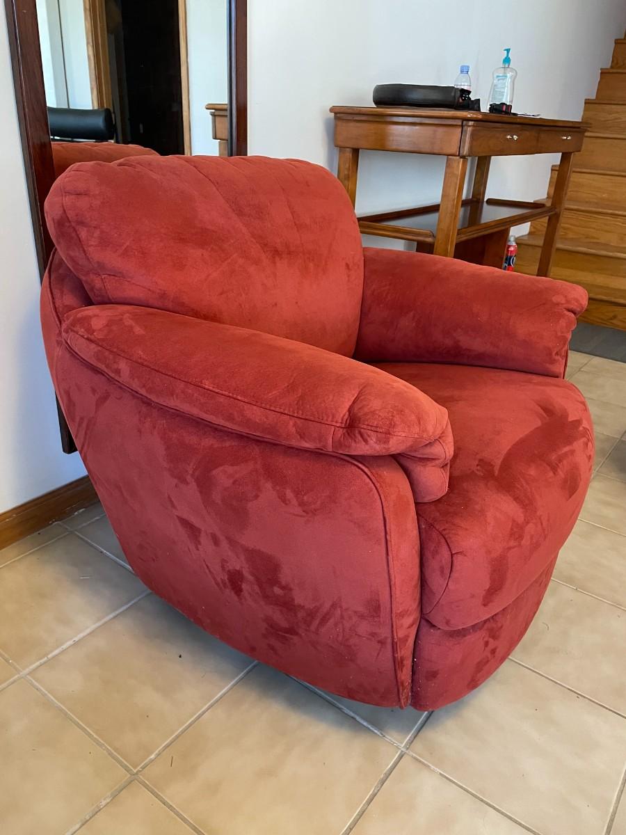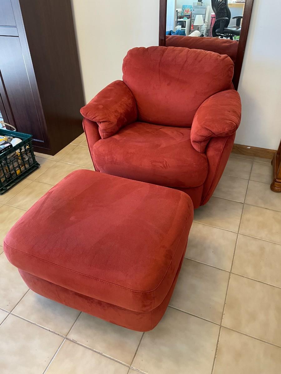 Chair is very comfortable. It swivels and rocks. Chair: 37"(w) x 42"(d) x 34"(h). Ottoman: 28"(w) x 23(d) x 17"(h)