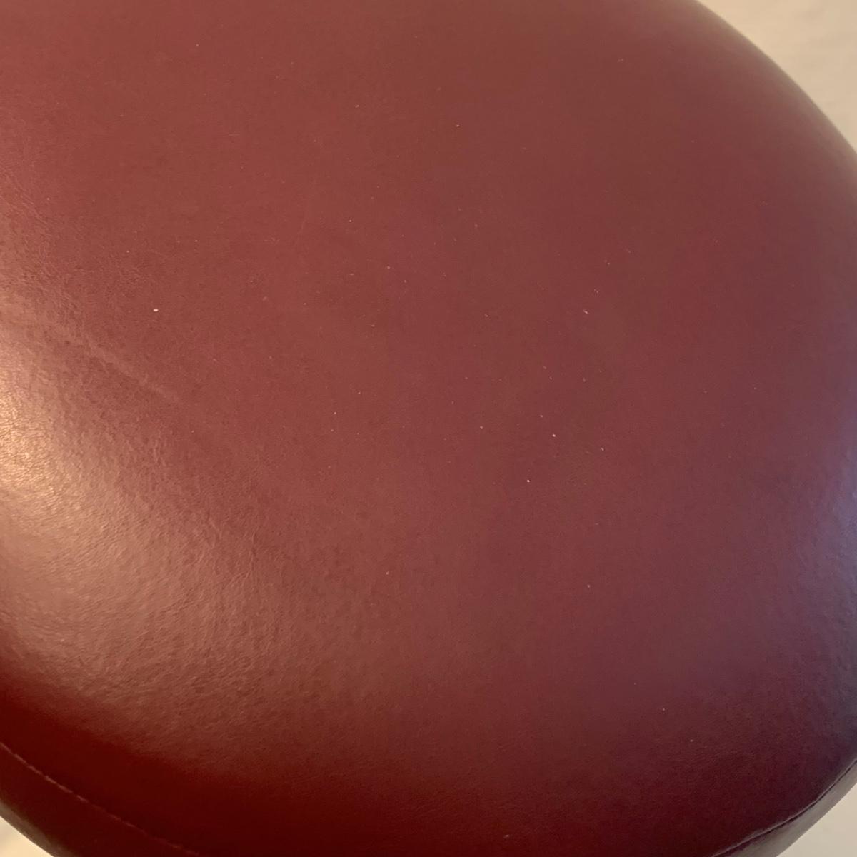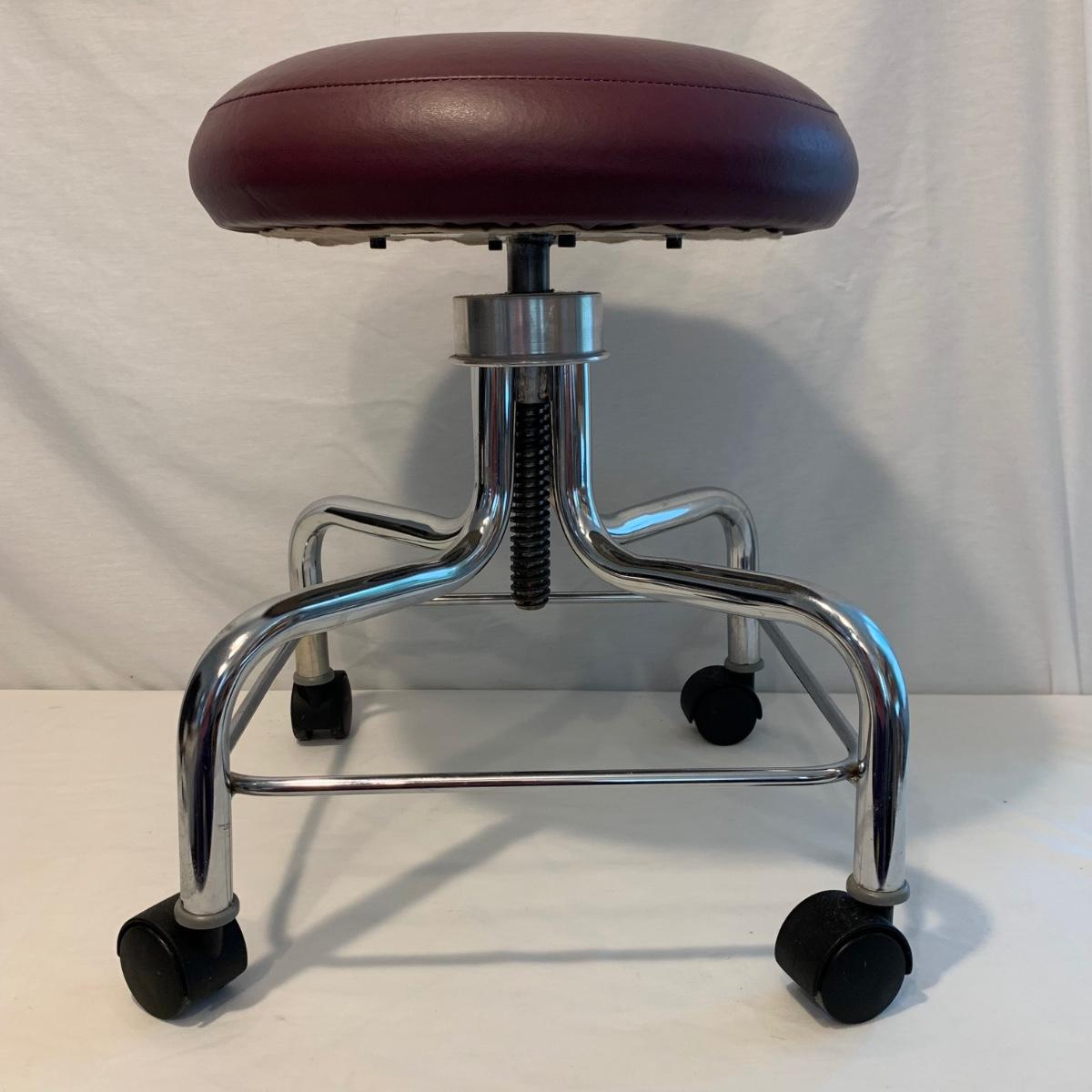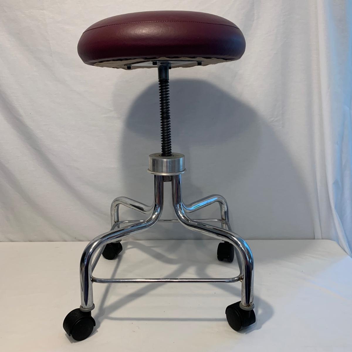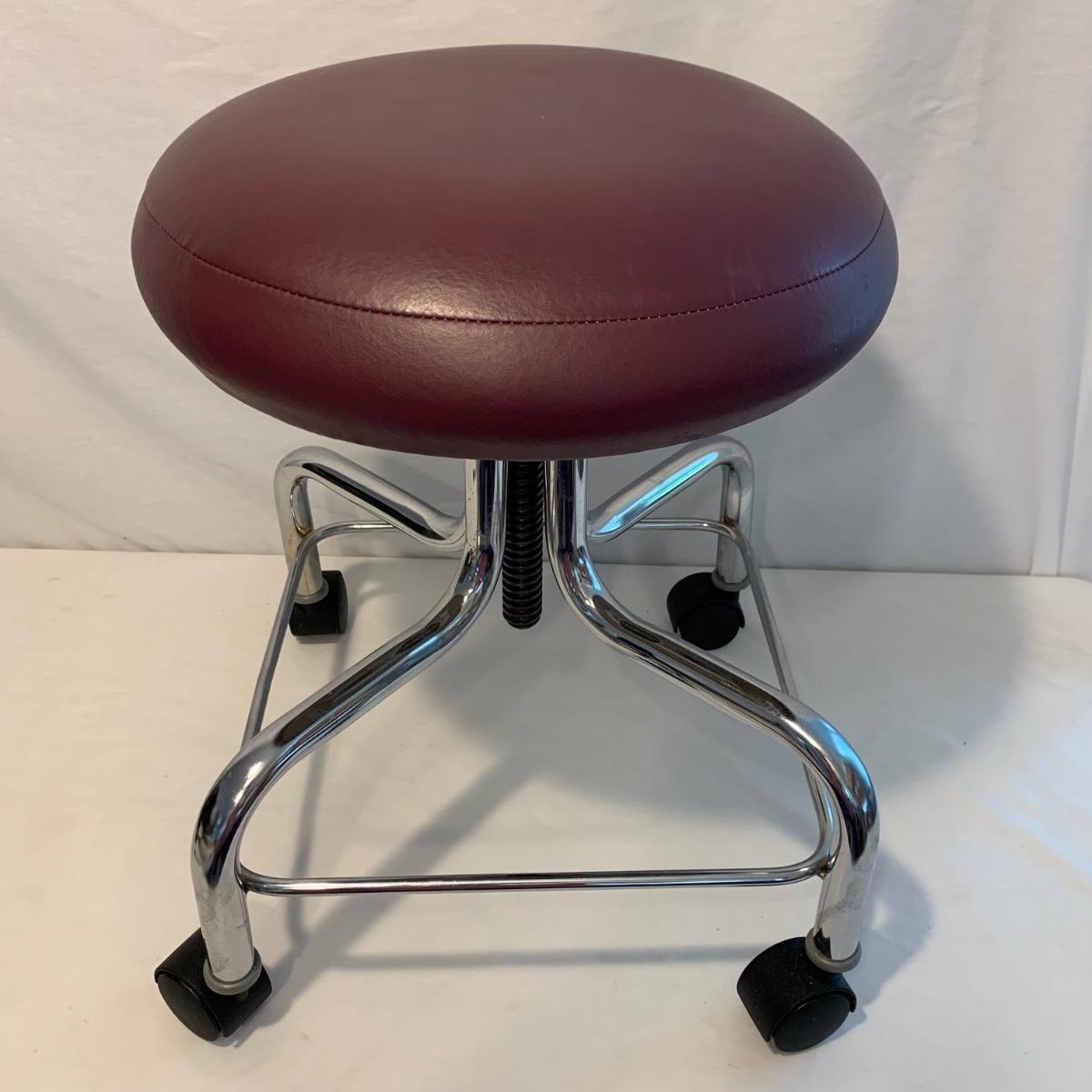 Stool with maroon colored cushioned seat that feels like a vinyl material. Stool has a silver metal base and is on casters. Stool is adjustable in height from 18.5” to 26”. Seat is 15”D. There’s a little rust on the legs; see photos.