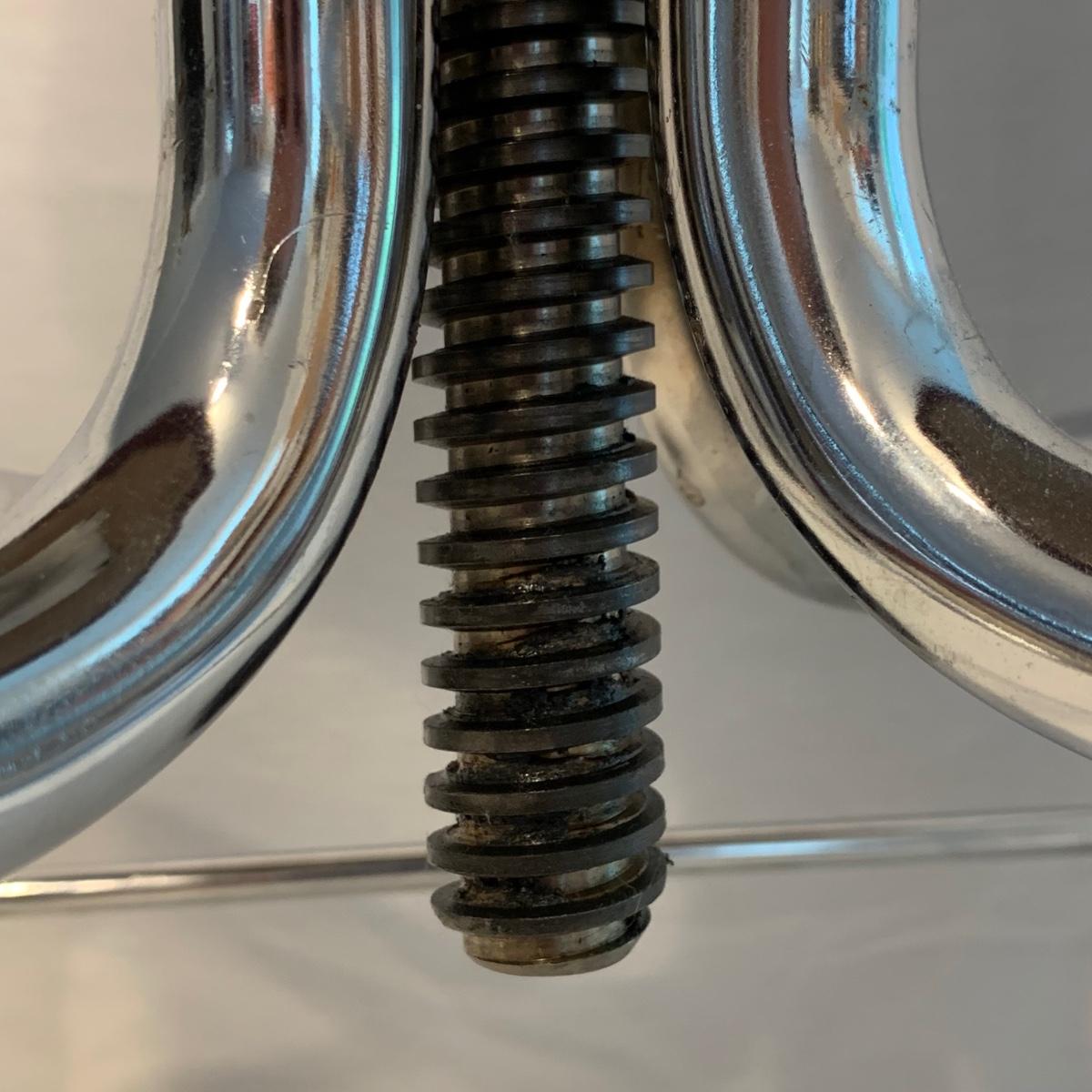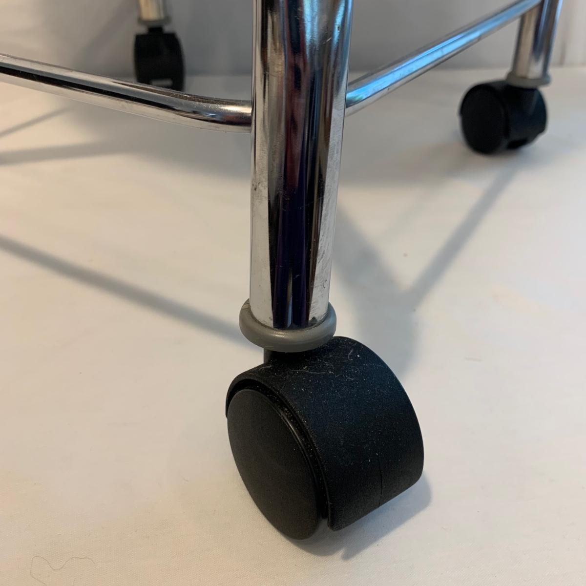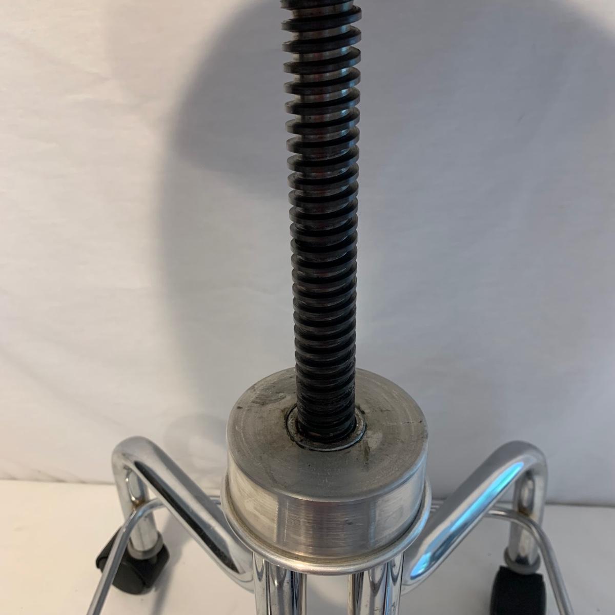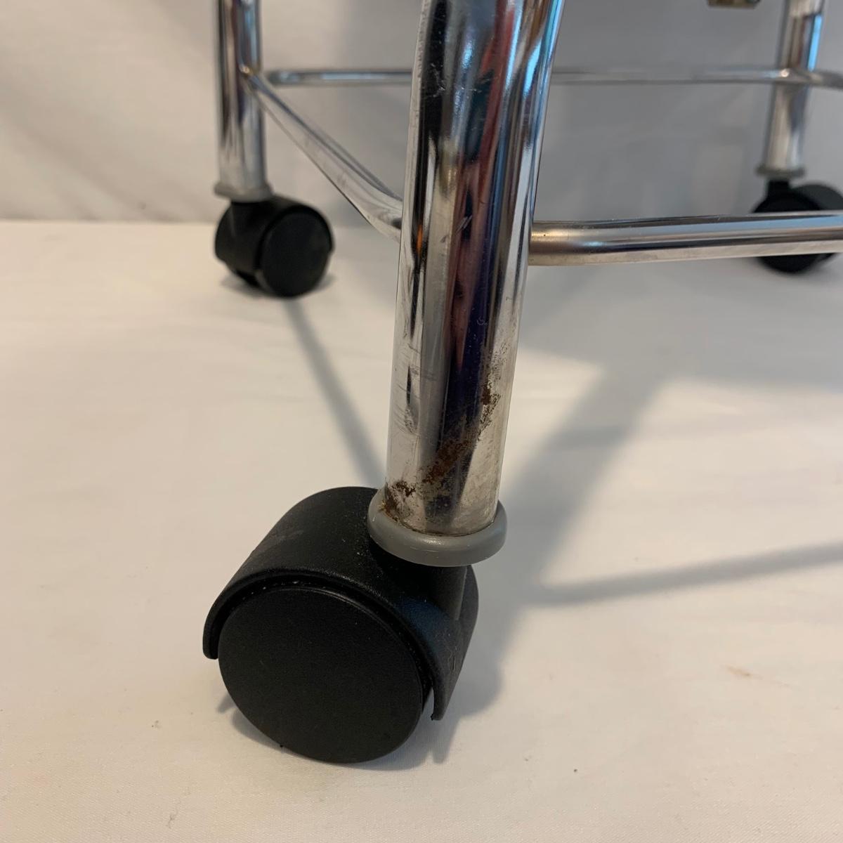Stool with maroon colored cushioned seat that feels like a vinyl material. Stool has a silver metal base and is on casters. Stool is adjustable in height from 18.5” to 26”. Seat is 15”D. There’s a little rust on the legs; see photos.
