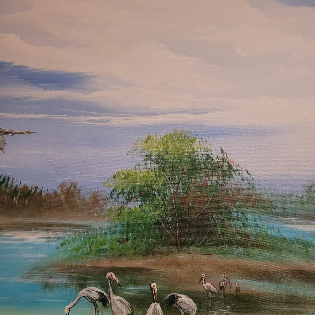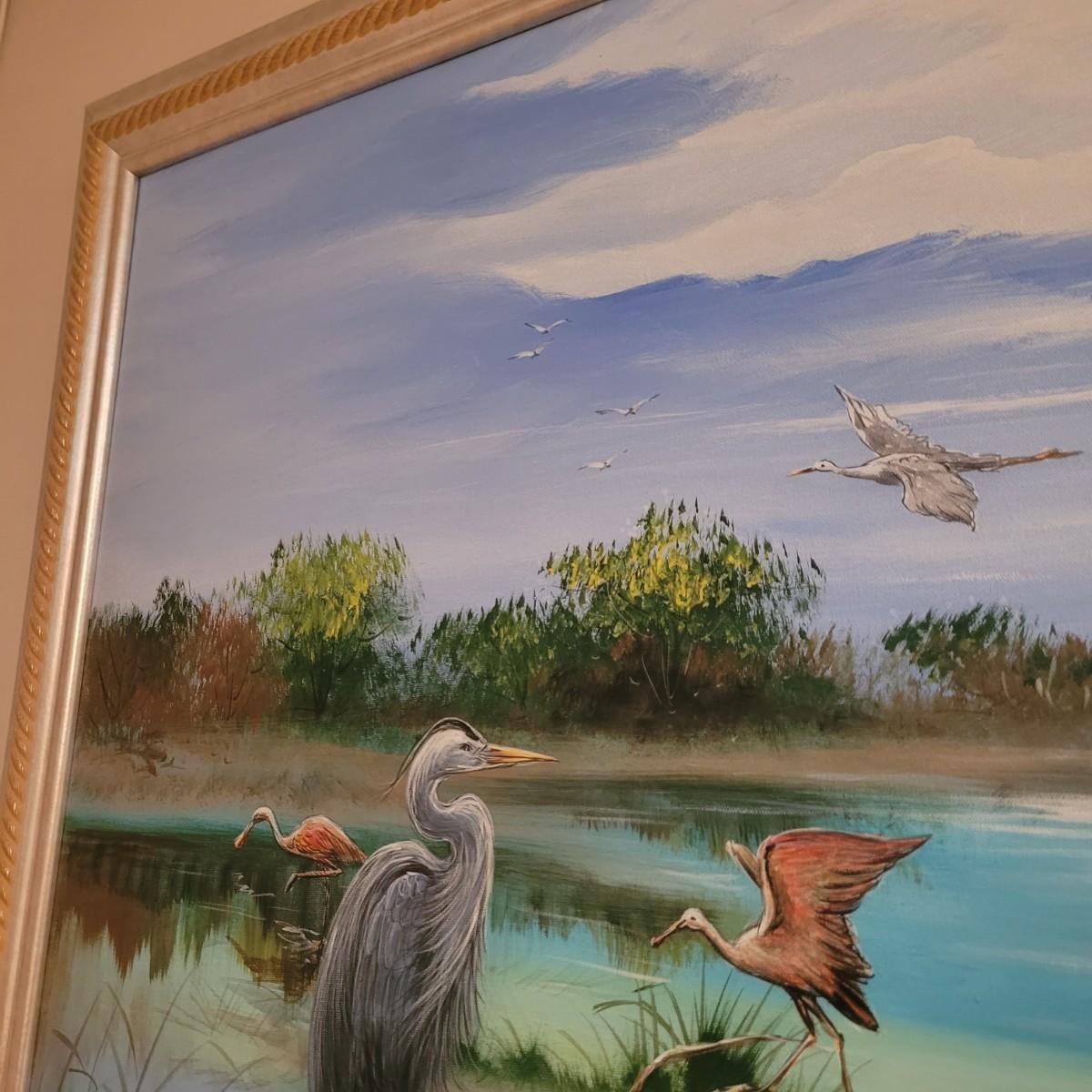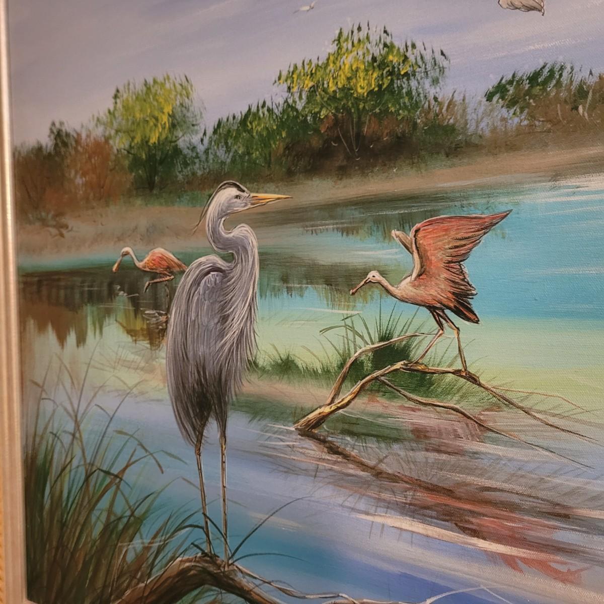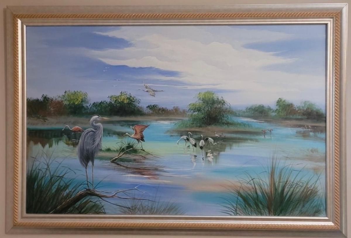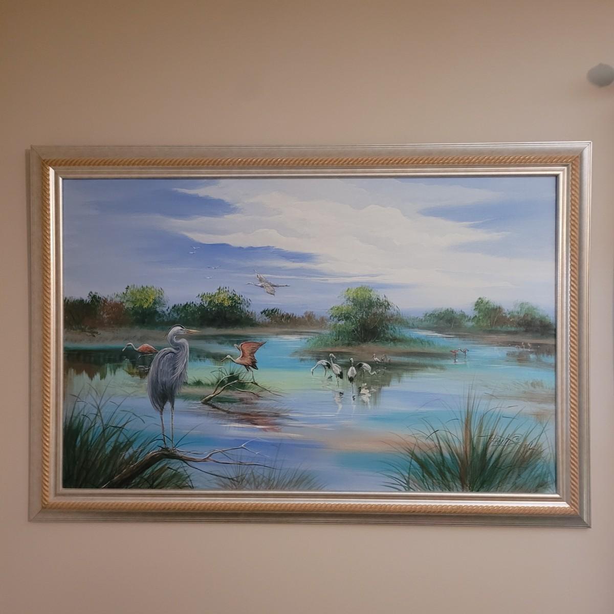 This gorgeous framed, signed painting depicts a serene, quiet marsh with a variety of marsh birds in different activities. Previous owner states that the painting is by Mr. Hahn Kim of Bradenton, Florida. We cannot verify the artist. Frame appears to be wood. Measures approximately 53.5” x 36"H. Shipping available. Shipping art can be costly. We suggest contacting our preferred local shipping provider, Postage Express, with dimensions and getting an estimate before bidding: (828) 255-9250 or shipping@postageexpressnc.com.