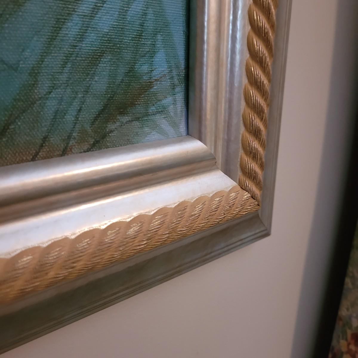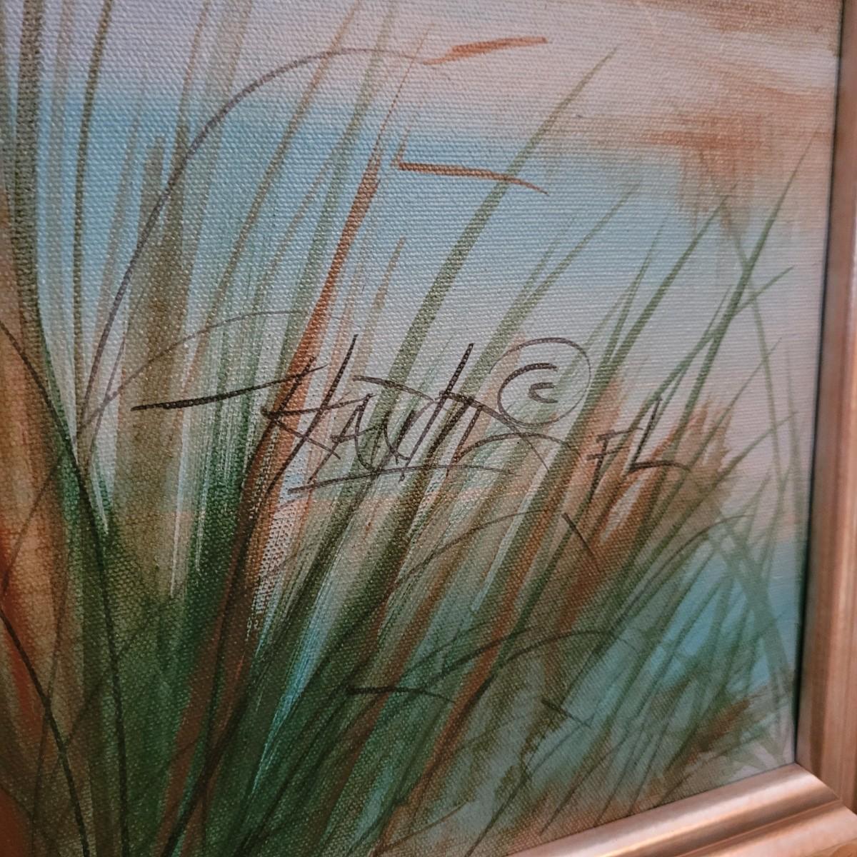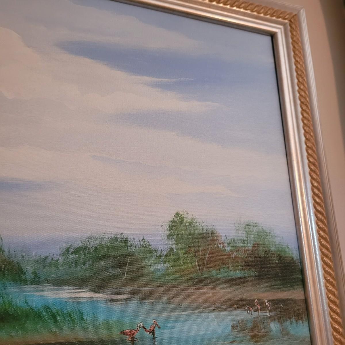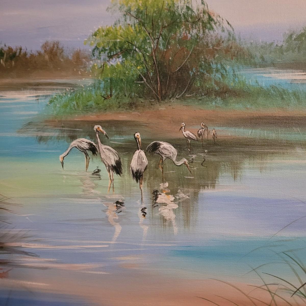 This gorgeous framed, signed painting depicts a serene, quiet marsh with a variety of marsh birds in different activities. Previous owner states that the painting is by Mr. Hahn Kim of Bradenton, Florida. We cannot verify the artist. Frame appears to be wood. Measures approximately 53.5” x 36"H. Shipping available. Shipping art can be costly. We suggest contacting our preferred local shipping provider, Postage Express, with dimensions and getting an estimate before bidding: (828) 255-9250 or shipping@postageexpressnc.com.