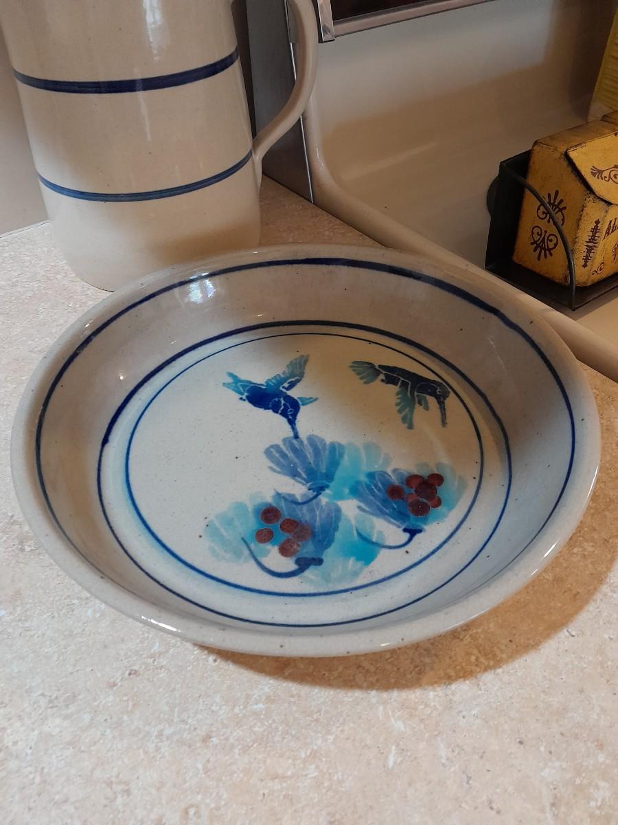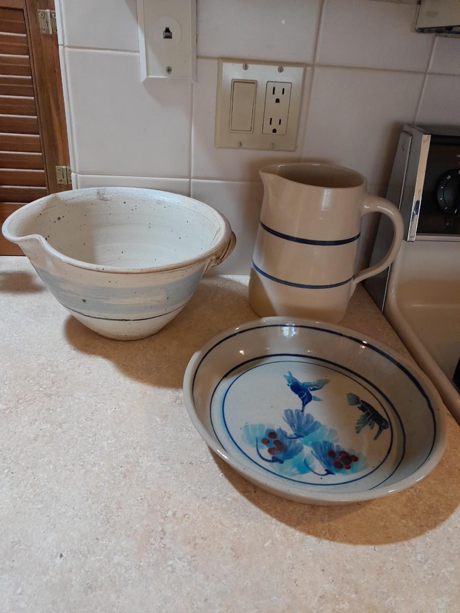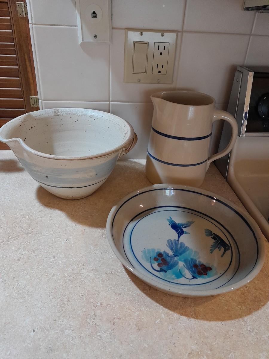 MARSHALL POTTERY PITCHER, POTTERY BATTER BOWL, AND PIE DISH