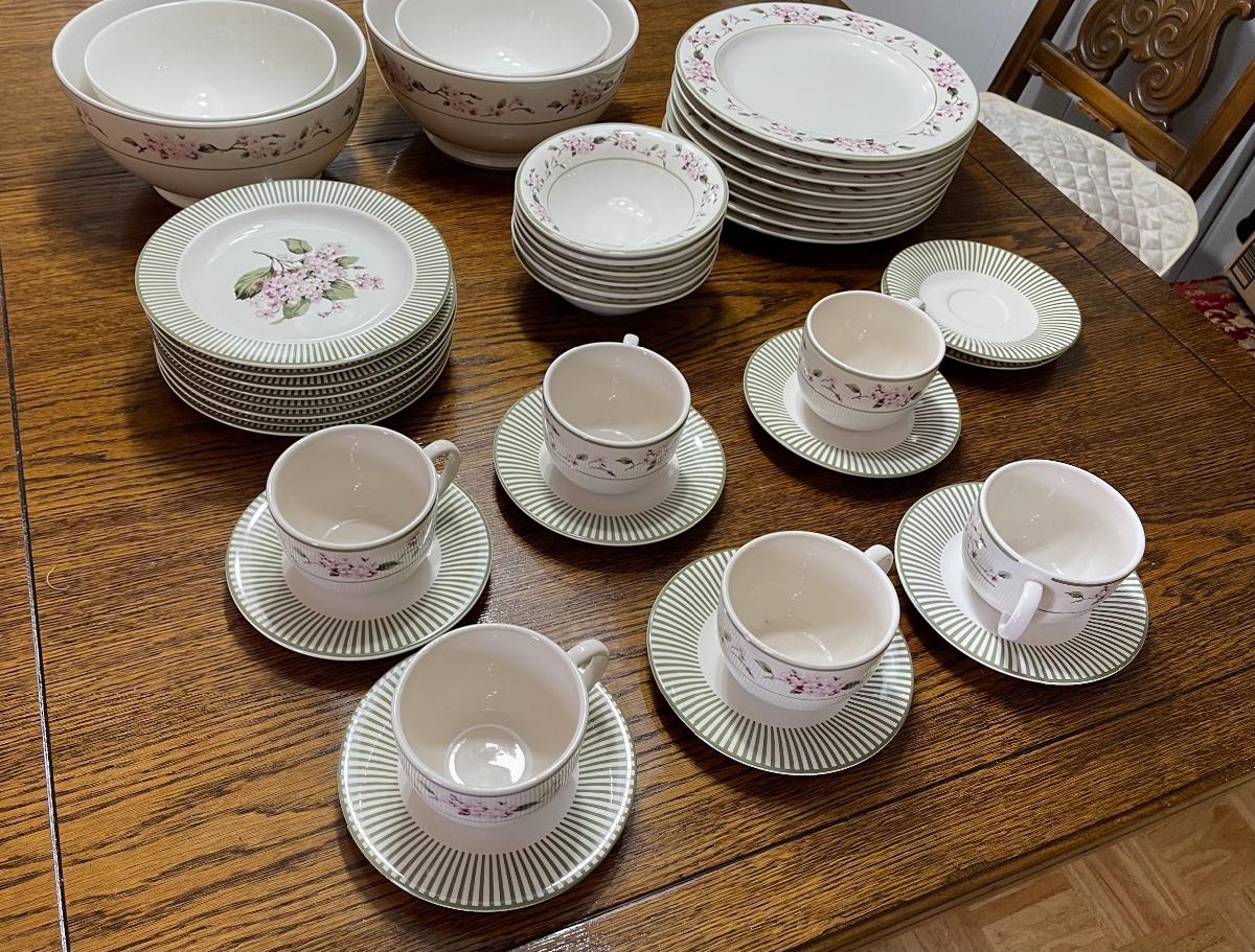 Ceramic dinnerware set with pink flowers and sage green border. In very good condition. 2 mixing bowl sets, 8 dinner plates, 7 luncheon plates, 6 bowls, 6 cups and saucers. LOCAL PICK UP IN ANGELUS OAKS.