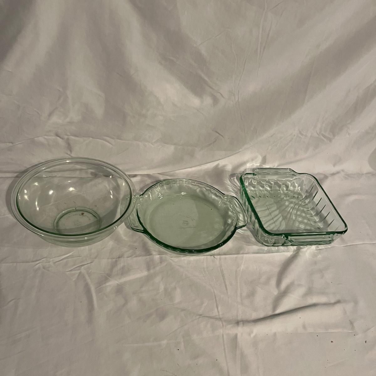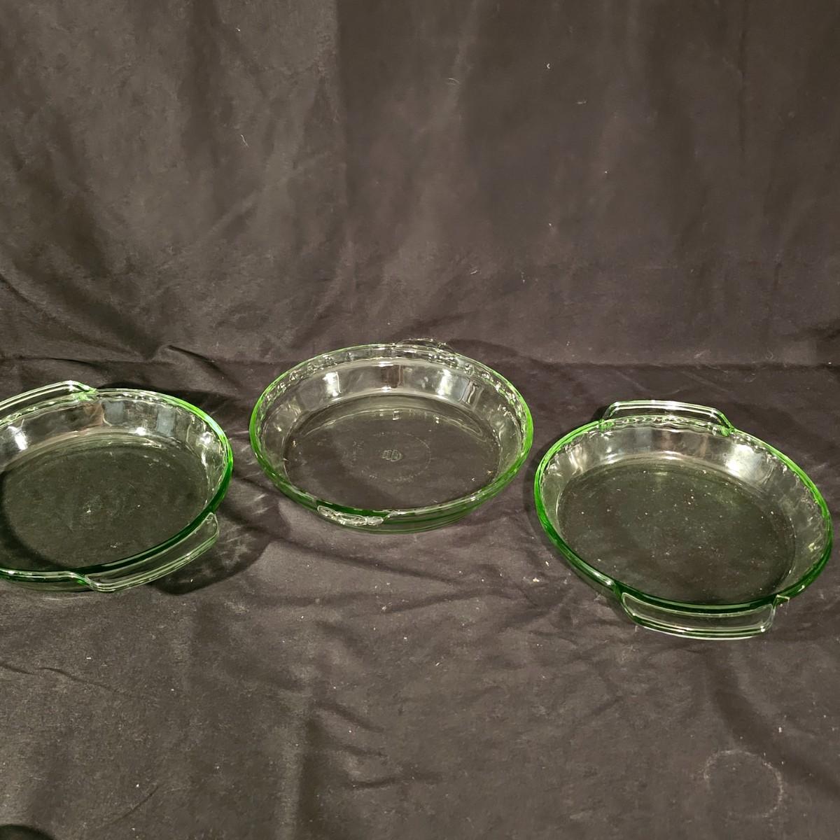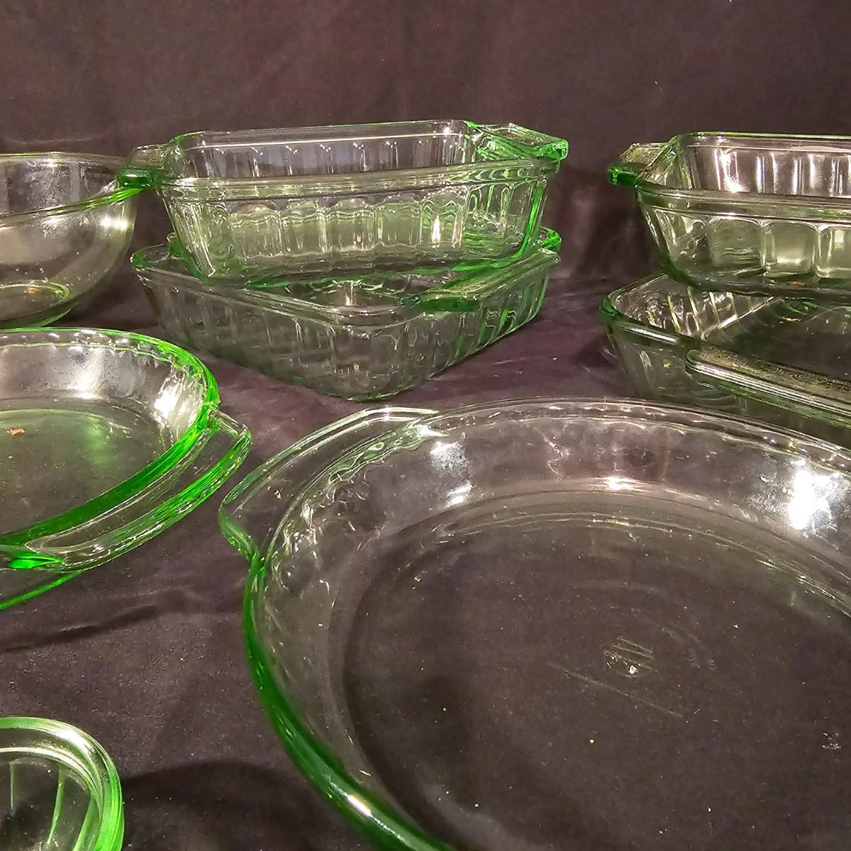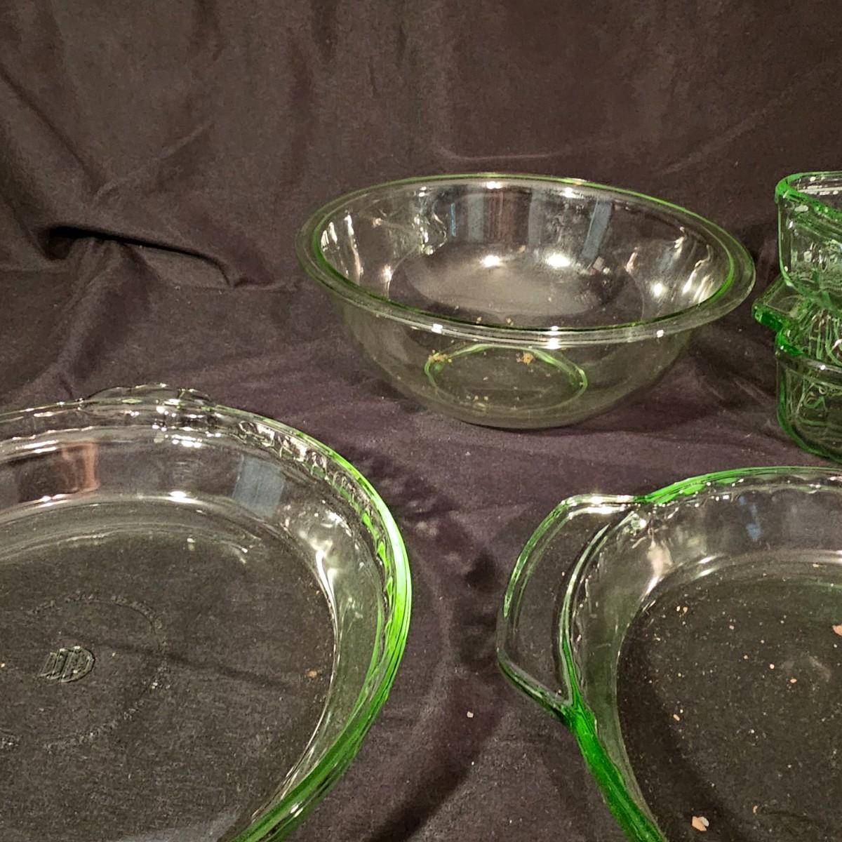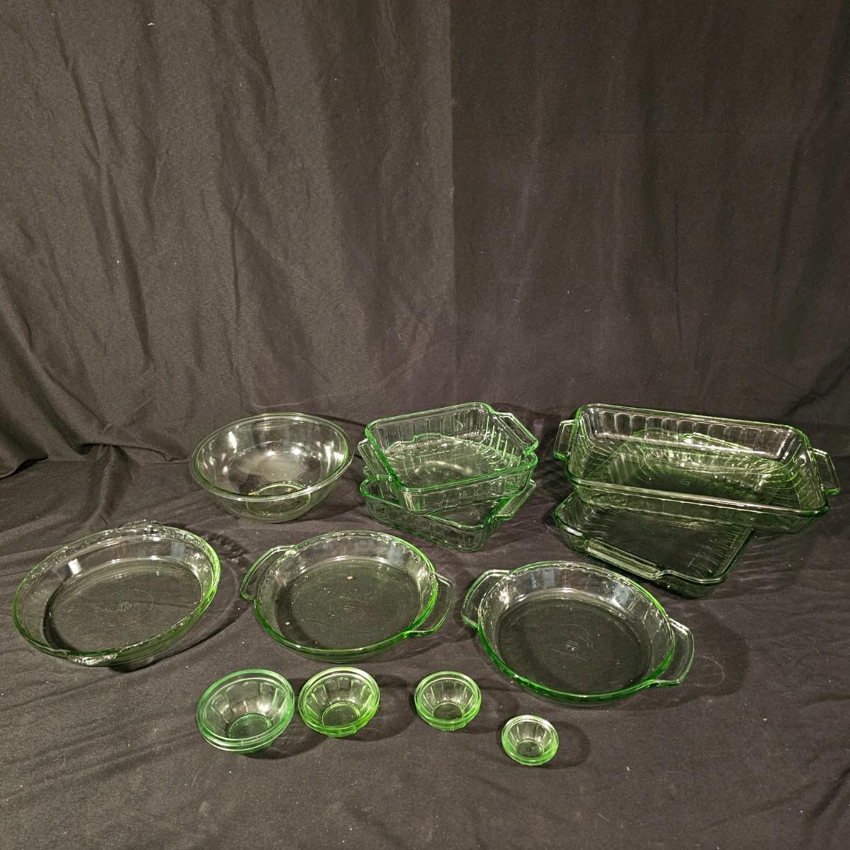 Several different types and sizes of green glass bake/Cookware by Martha Stewart Everyday. Rectangle, square, round, more. Two 10" x 16" rectangle, two 8.5" x 10" square, one 10"D round. Three pie plates, one 10" and two 9.5" round. Set of four small graduated round bowls. See photos for details. Local pickup only.