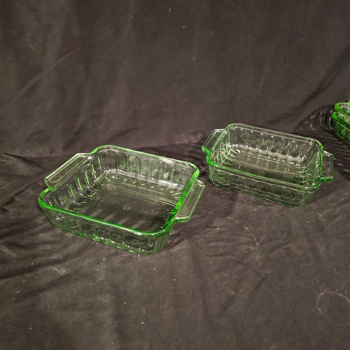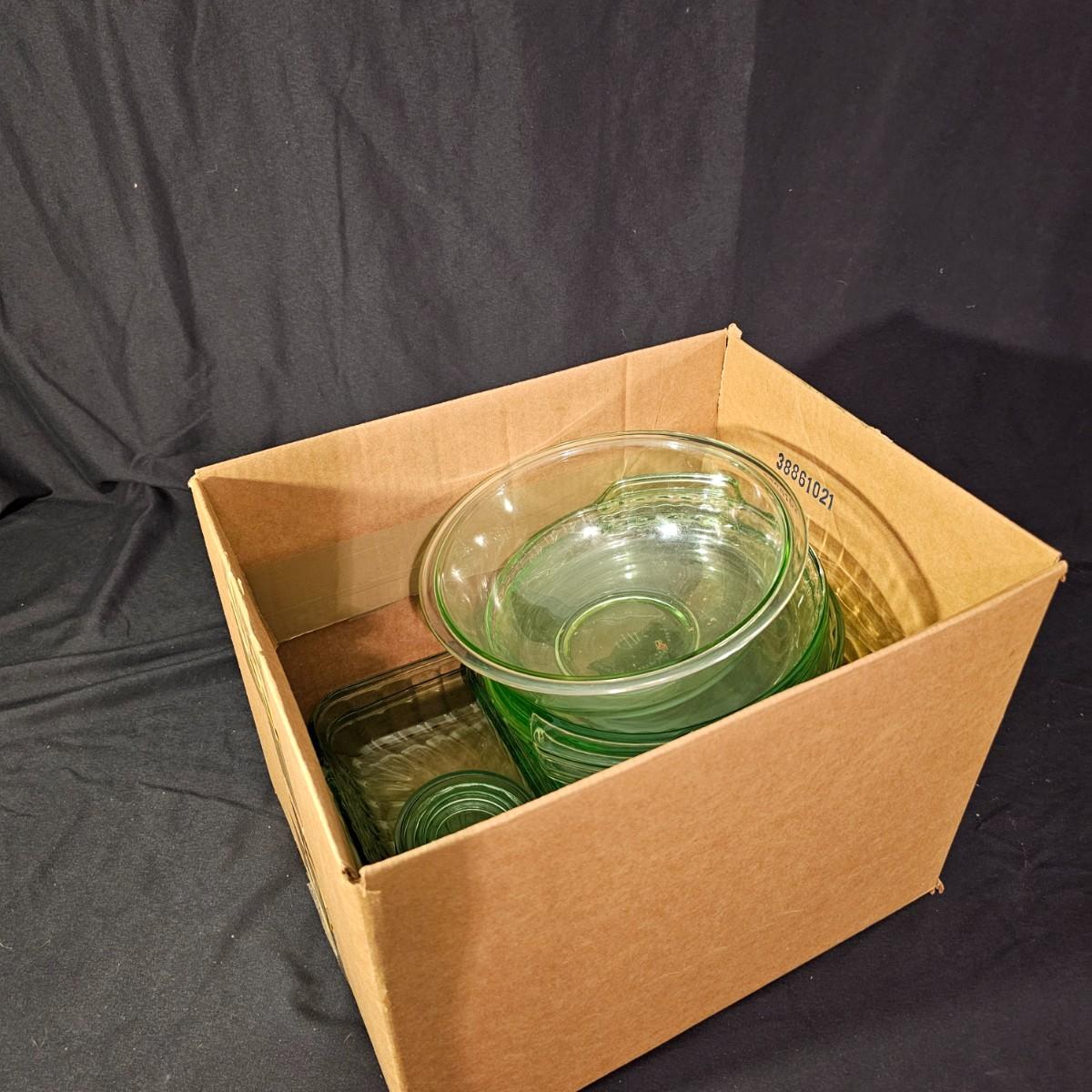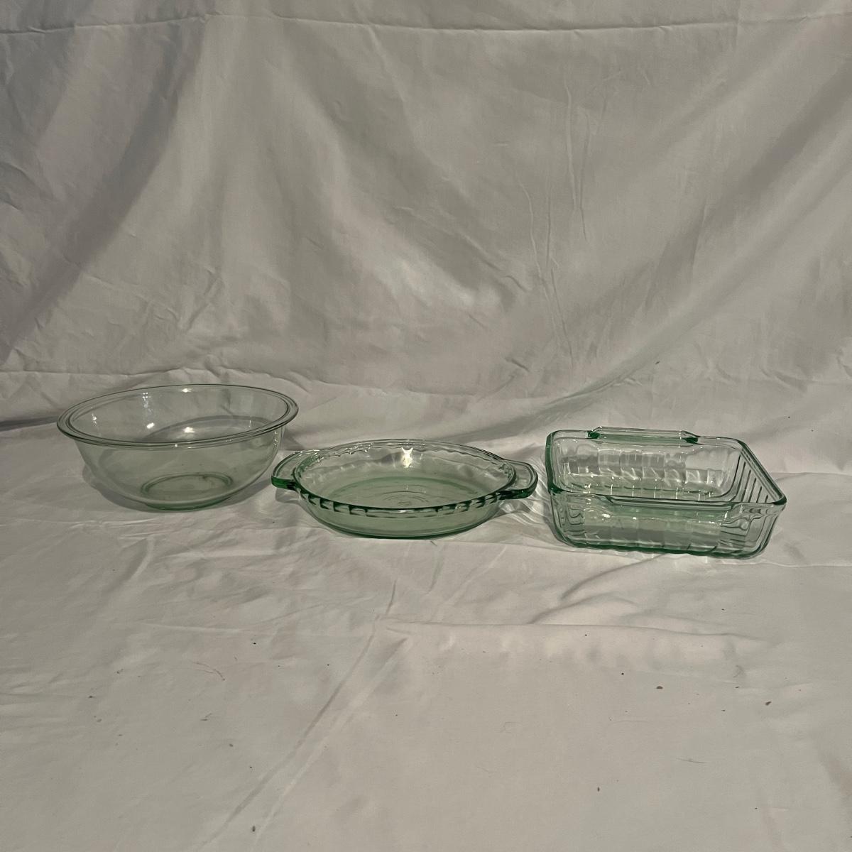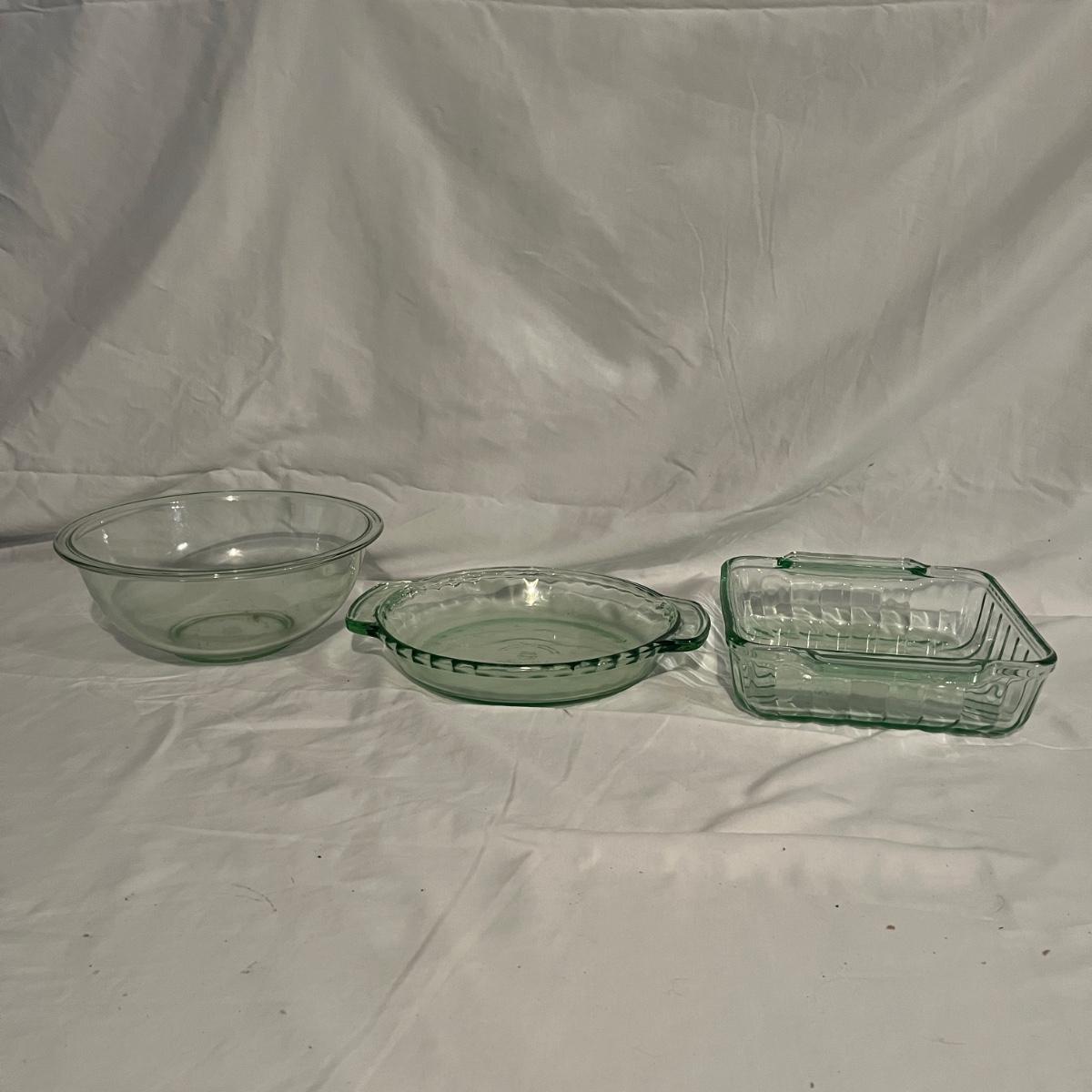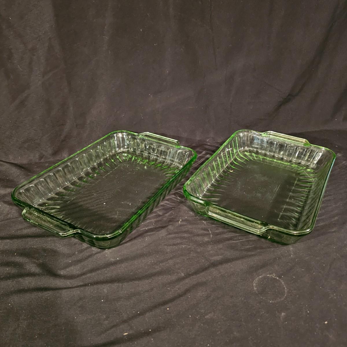 Several different types and sizes of green glass bake/Cookware by Martha Stewart Everyday. Rectangle, square, round, more. Two 10" x 16" rectangle, two 8.5" x 10" square, one 10"D round. Three pie plates, one 10" and two 9.5" round. Set of four small graduated round bowls. See photos for details. Local pickup only.