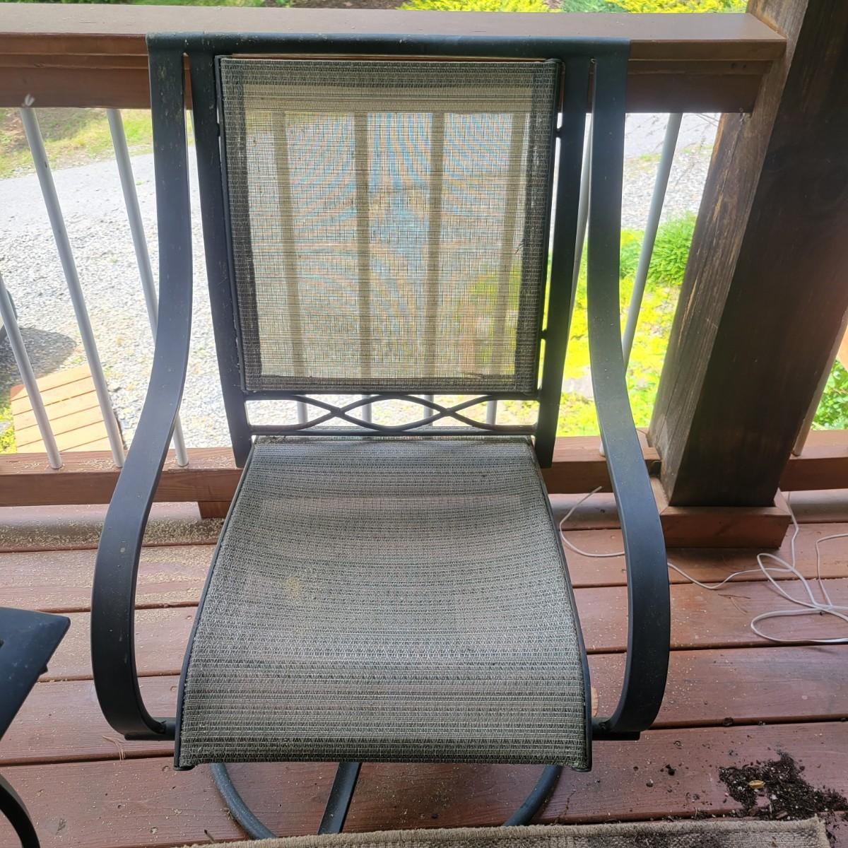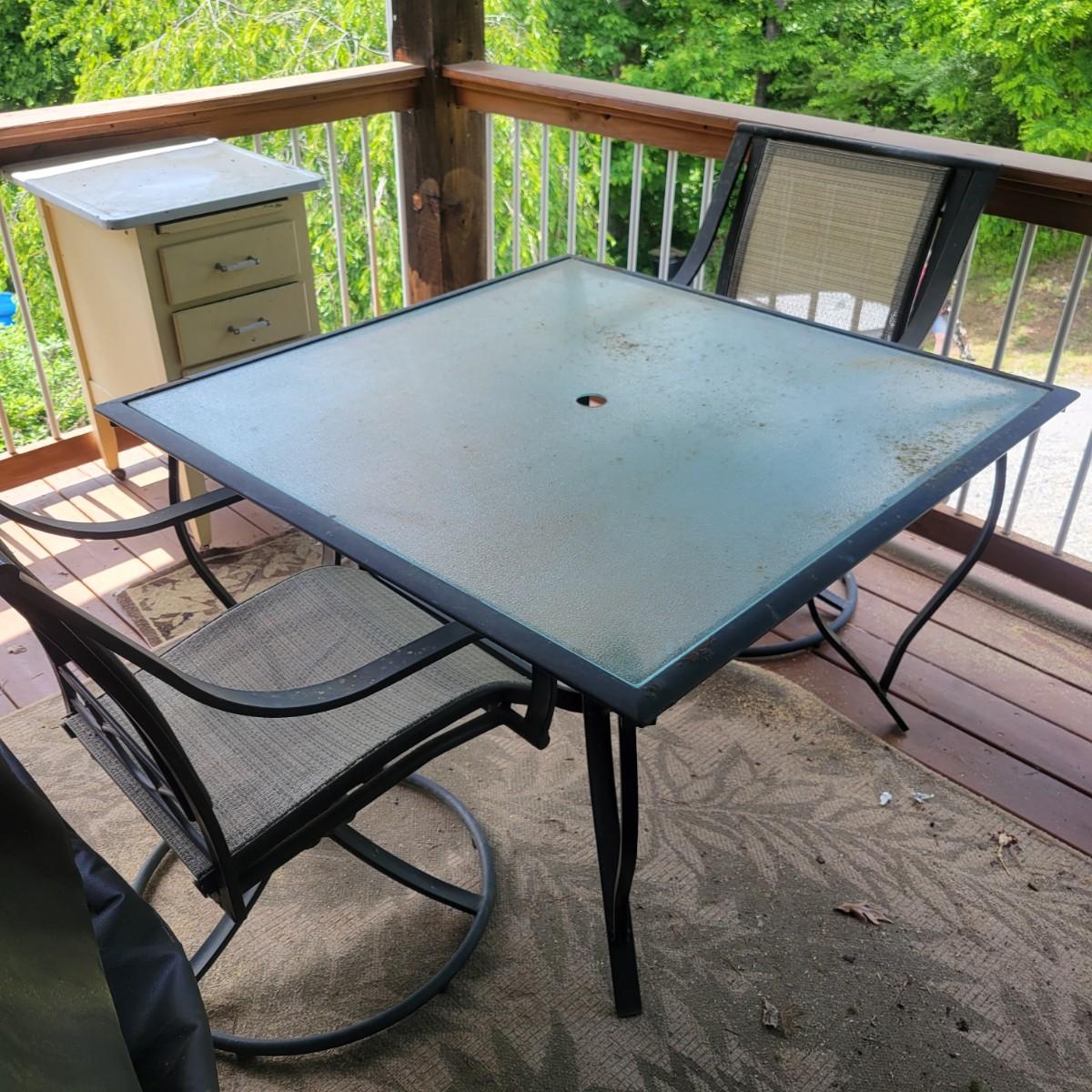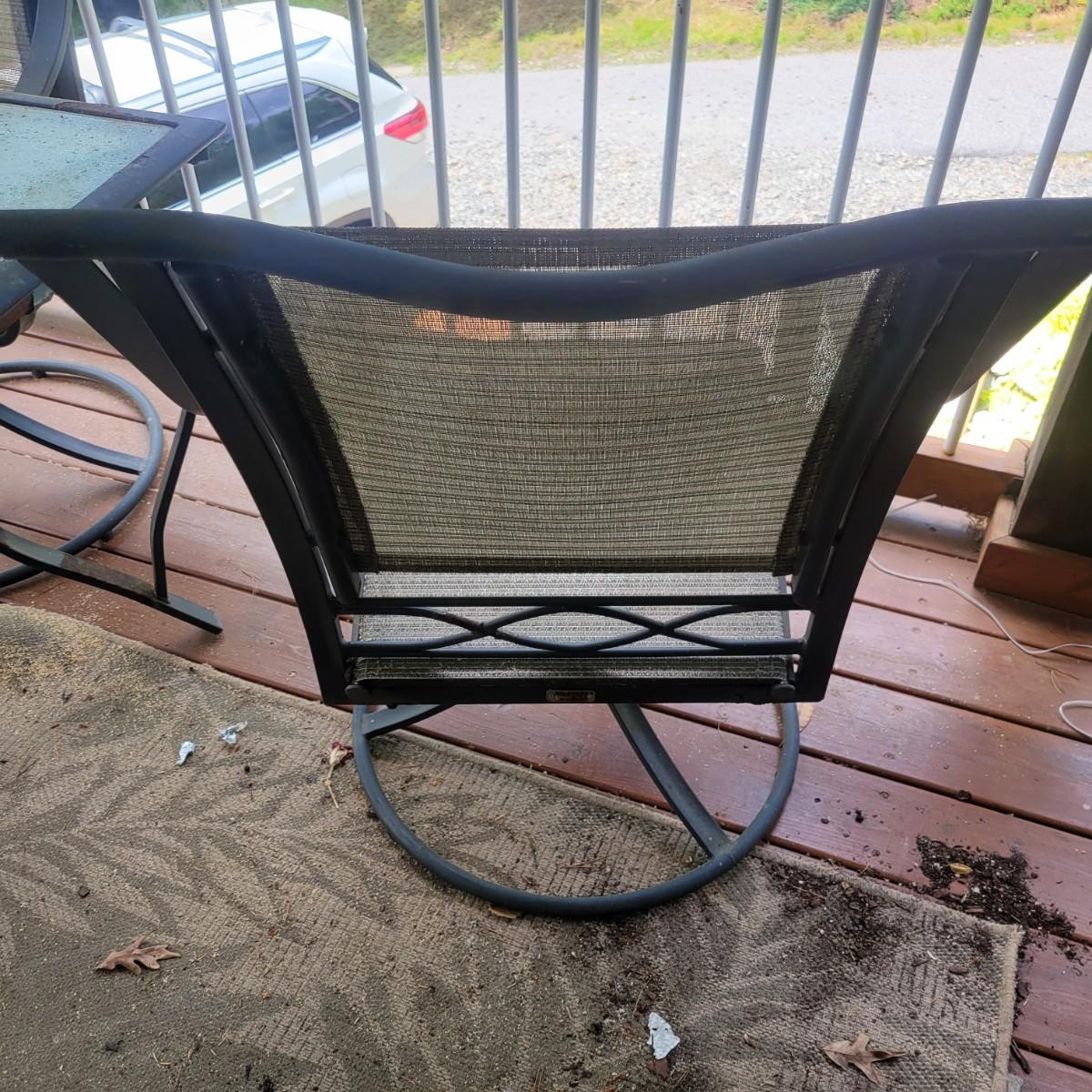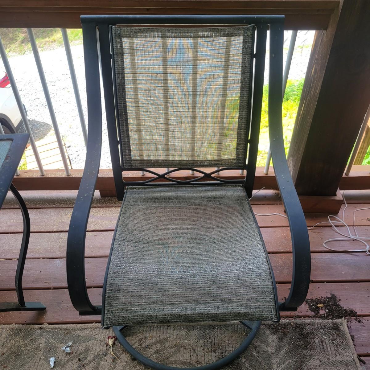 A Matha Stewart Living tempered glass top patio table with a steel frame. The table measures approximately 44" x 44" x 27.5"H. This table comes with two matching chairs that are made of steel with fabric seats and backing, and have swivel bottoms The chairs measure approximately 23" x 26" x 25.5" with a seat height of 17". All three items are showing rust where the powder coating is peeling away, but doesn't affect their use. Local pickup only. Winning bidder must bring assistance to help move and load this item due to its weight and/or size.