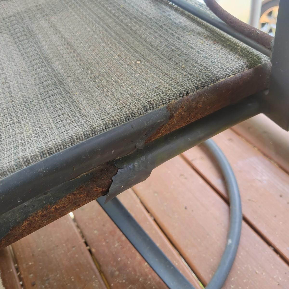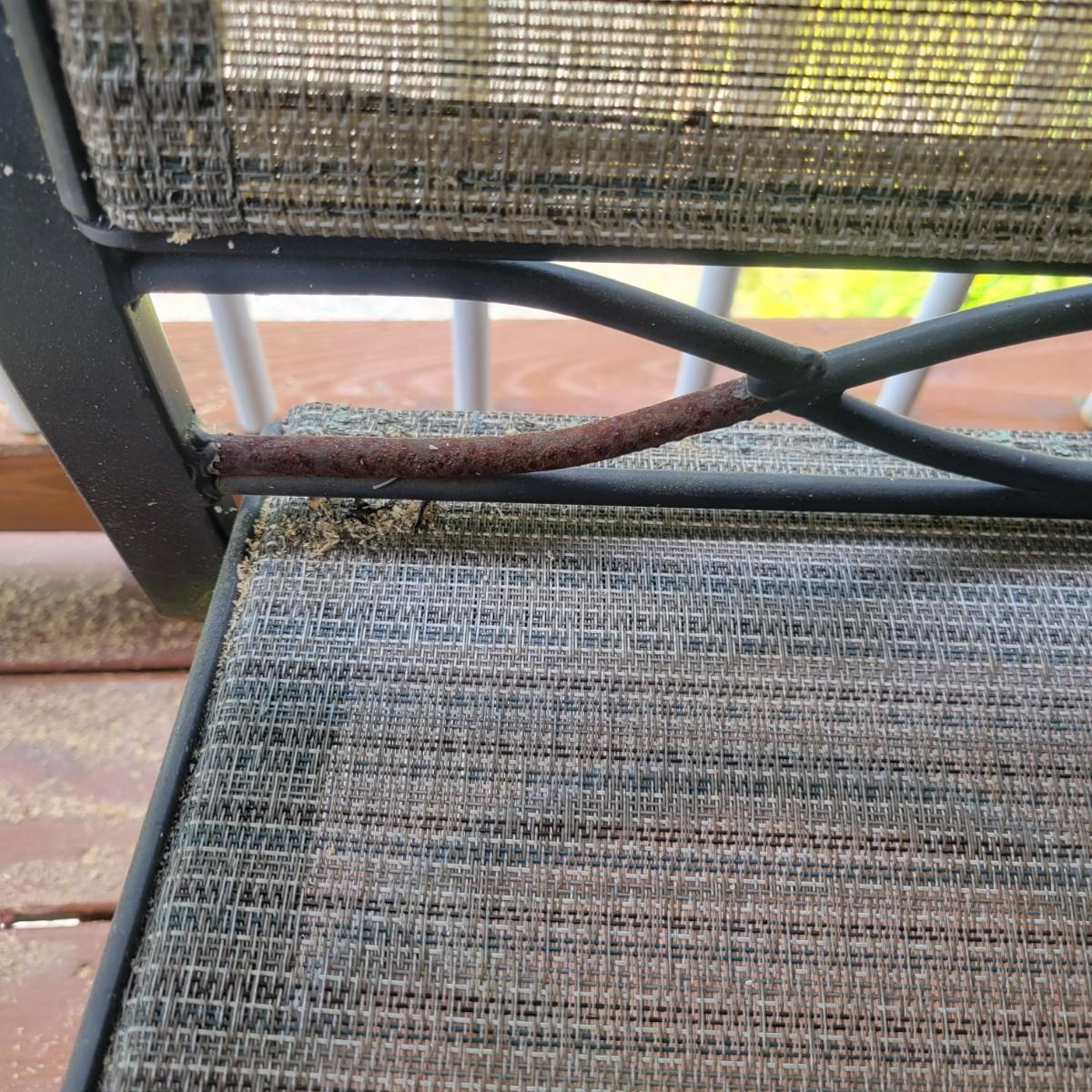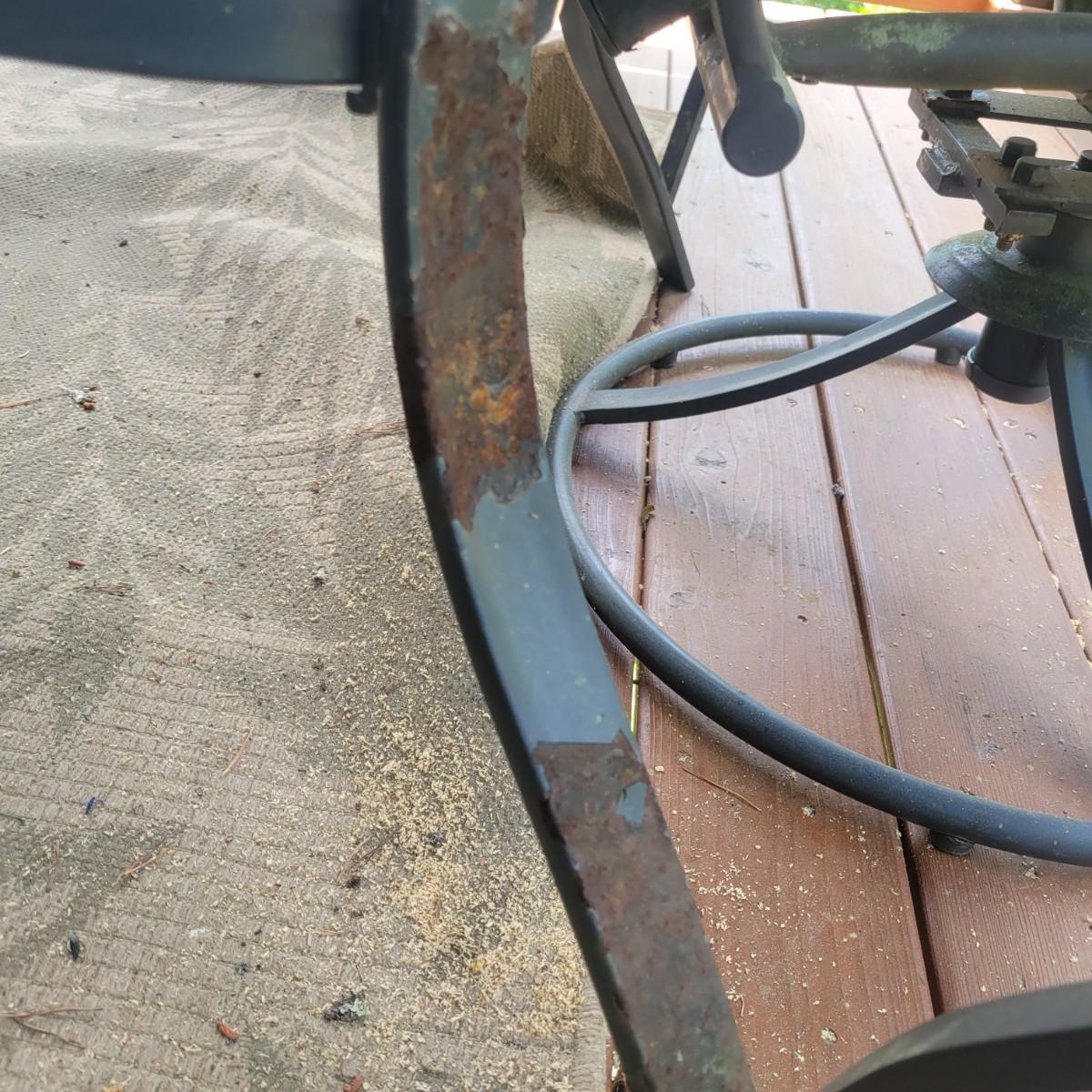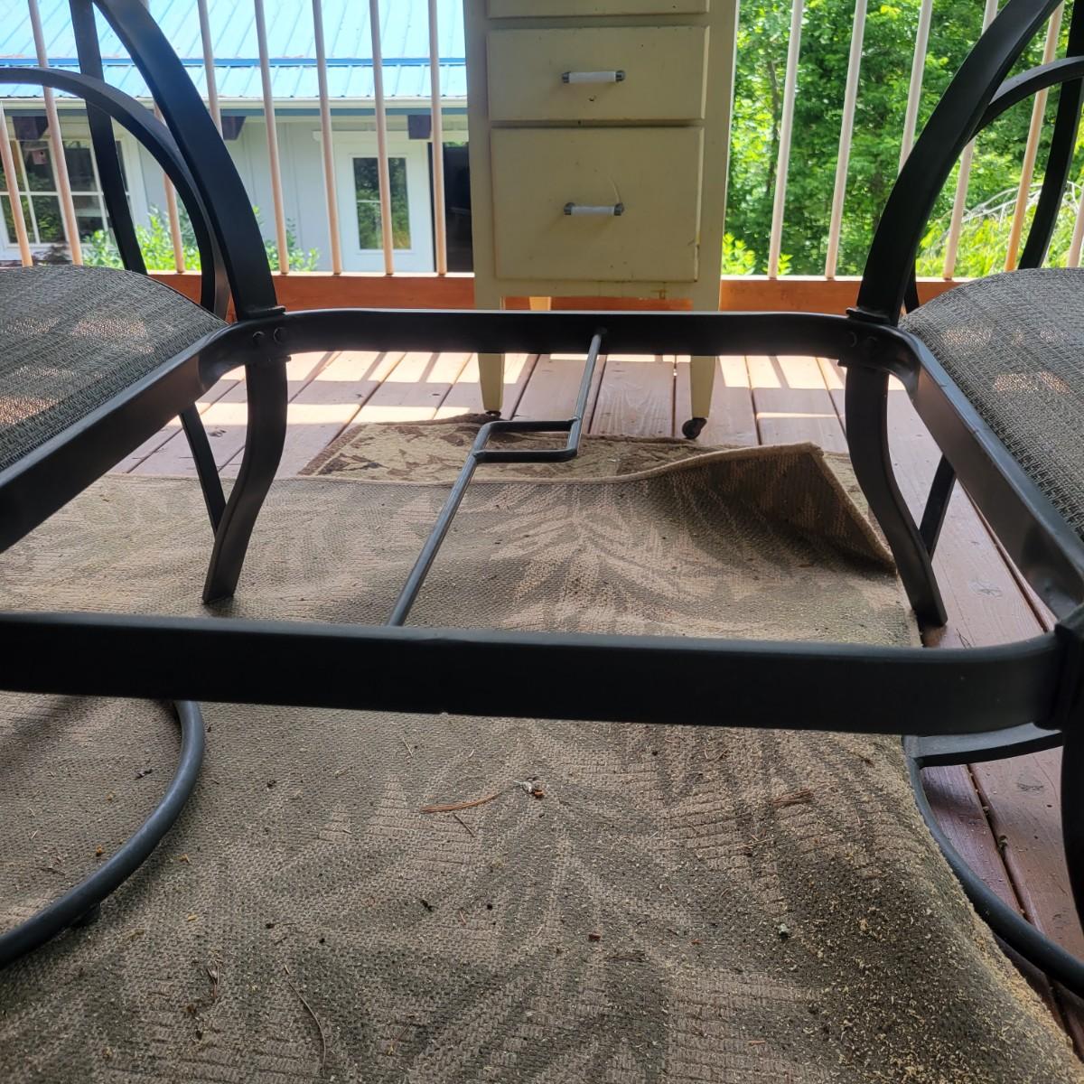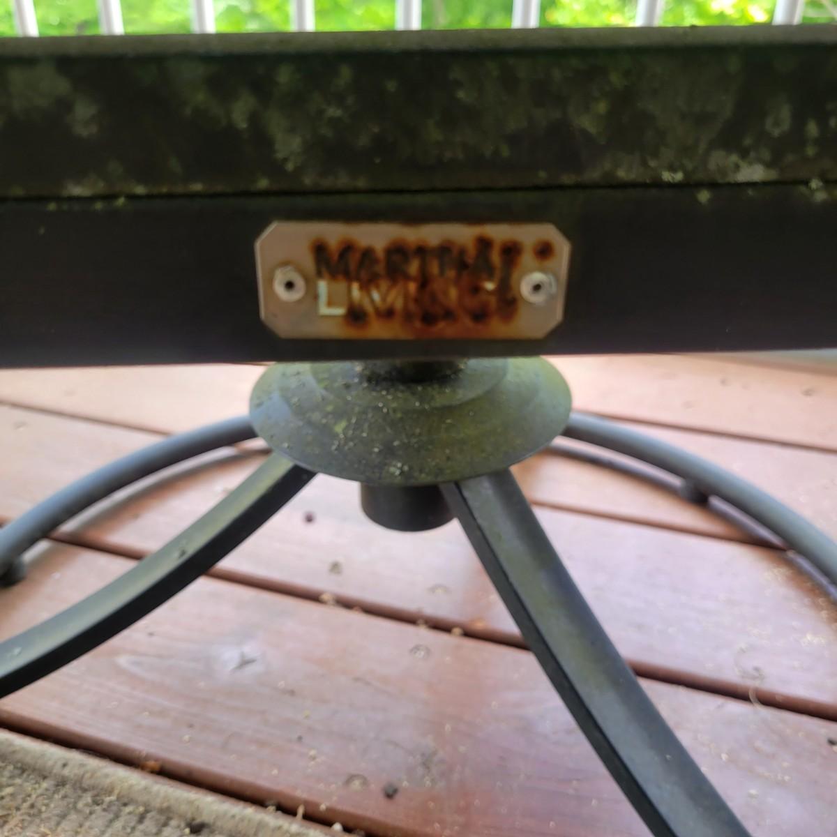 A Matha Stewart Living tempered glass top patio table with a steel frame. The table measures approximately 44" x 44" x 27.5"H. This table comes with two matching chairs that are made of steel with fabric seats and backing, and have swivel bottoms The chairs measure approximately 23" x 26" x 25.5" with a seat height of 17". All three items are showing rust where the powder coating is peeling away, but doesn't affect their use. Local pickup only. Winning bidder must bring assistance to help move and load this item due to its weight and/or size.