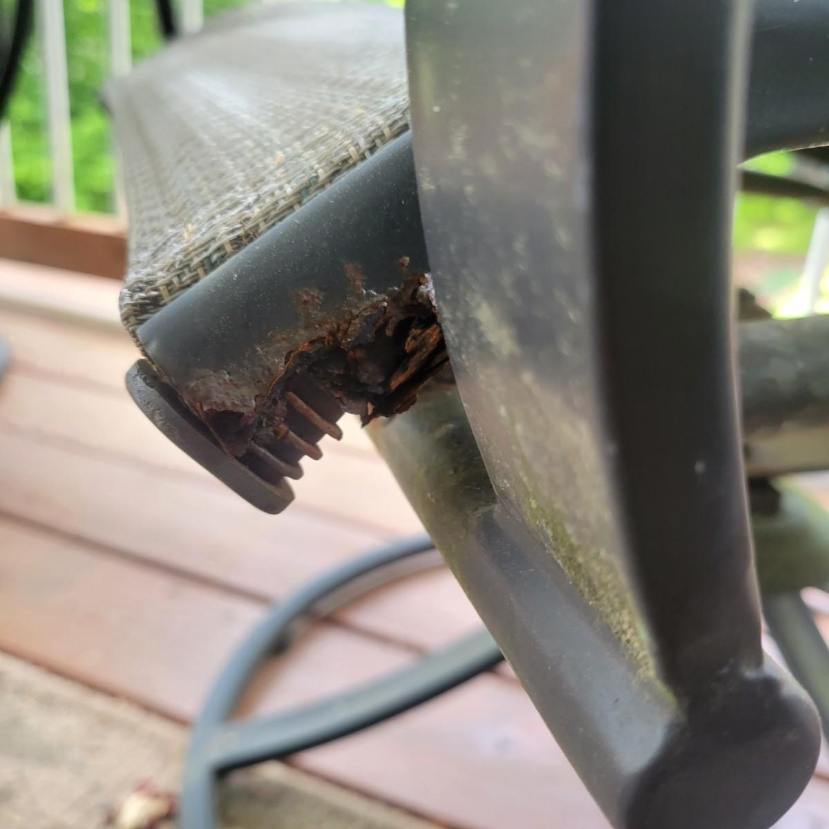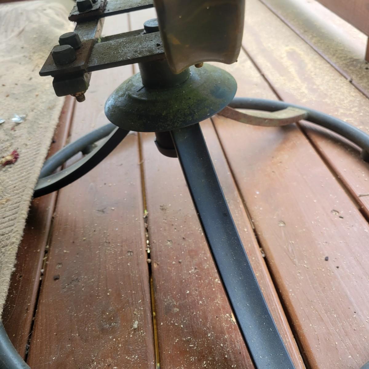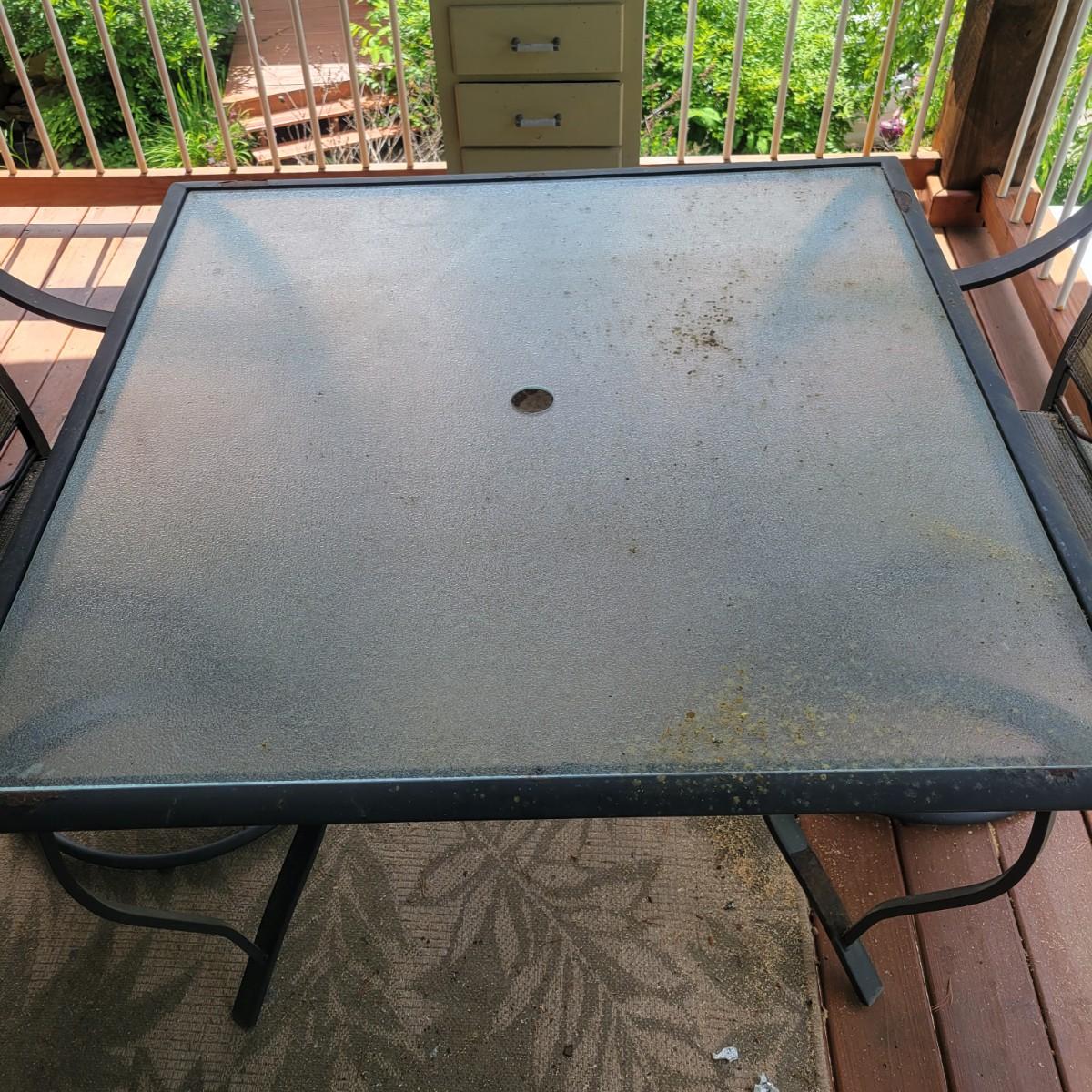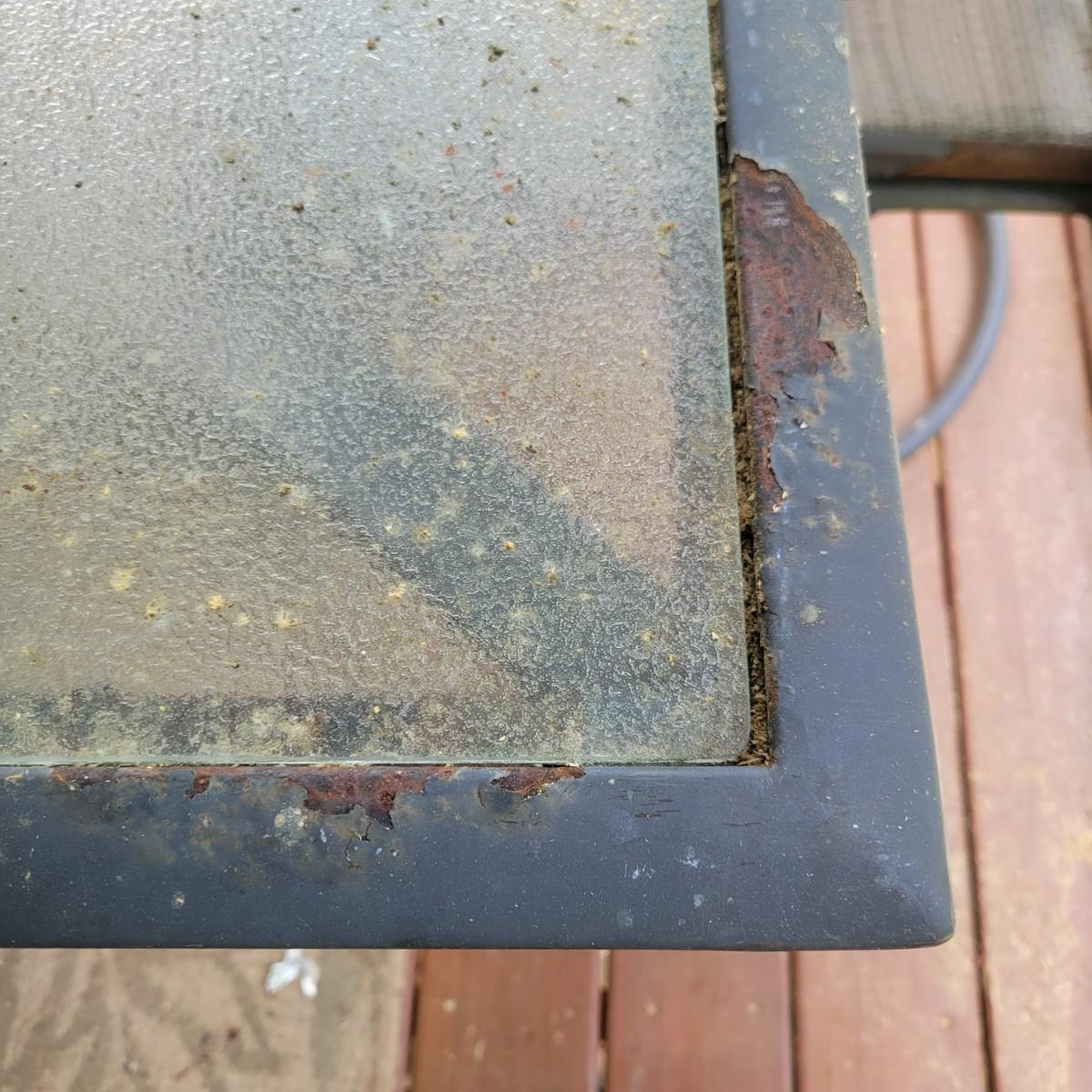 A Matha Stewart Living tempered glass top patio table with a steel frame. The table measures approximately 44" x 44" x 27.5"H. This table comes with two matching chairs that are made of steel with fabric seats and backing, and have swivel bottoms The chairs measure approximately 23" x 26" x 25.5" with a seat height of 17". All three items are showing rust where the powder coating is peeling away, but doesn't affect their use. Local pickup only. Winning bidder must bring assistance to help move and load this item due to its weight and/or size.