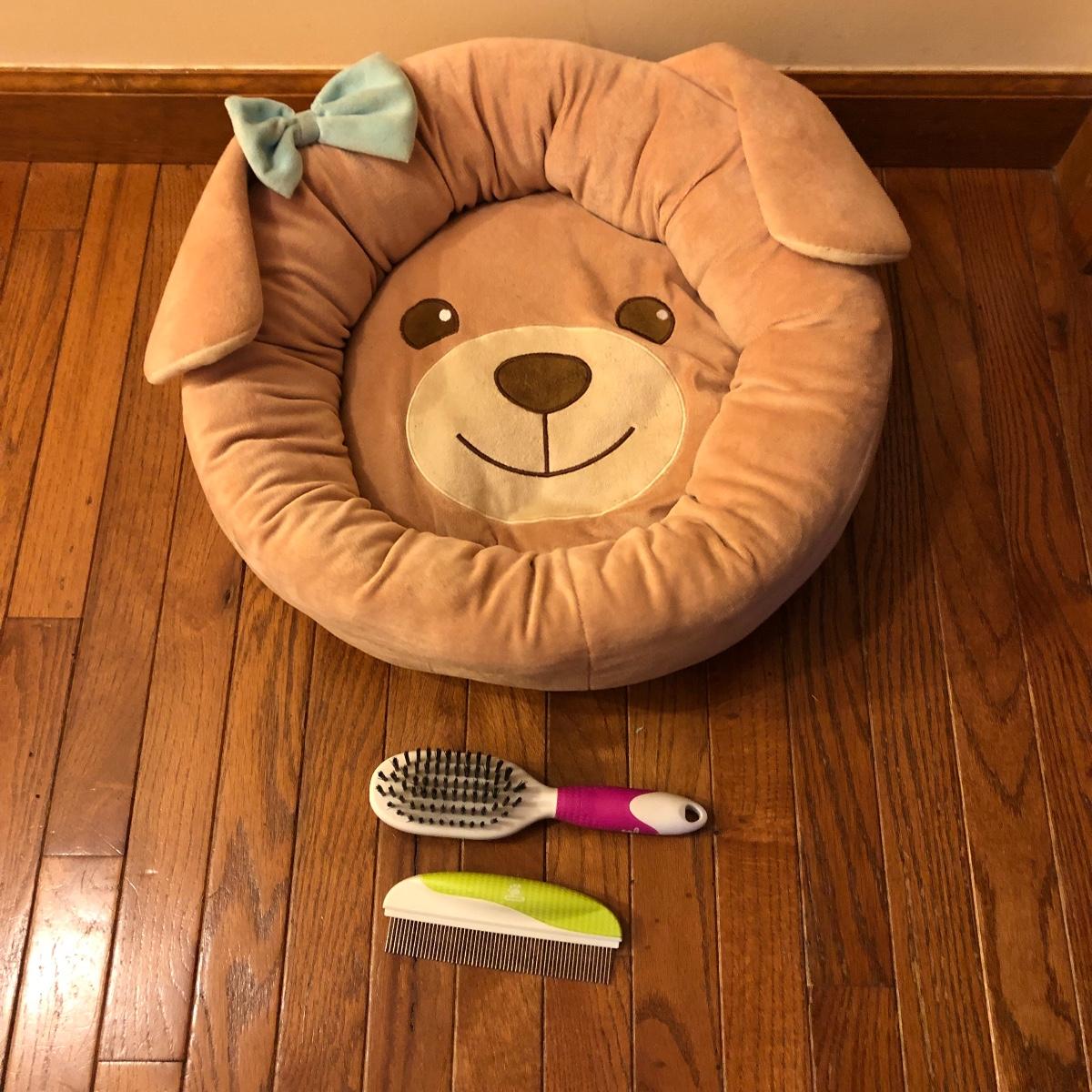 This lot includes a Martha Stewart pet bed, a dog brush with both wire and synthetic bristles and a pet comb. The bed measures 19” in diameter. Shipping Available.