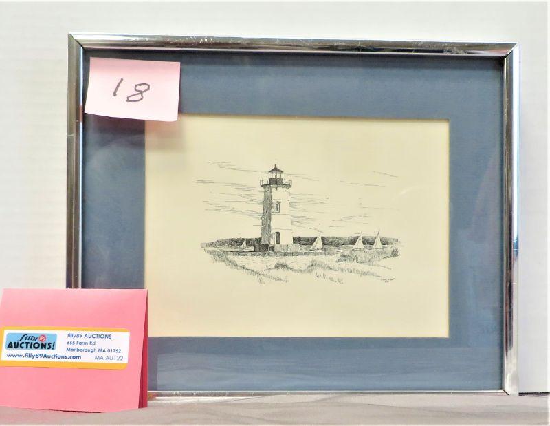 Vintage (1974) signed Martha's Vineyard Lighthouse by Clark M Goff (Sudbury MA) Pen & Ink Framed. Silver Metal Frame measures 8.5" x 10". Please preview and email questions / concerns prior to bidding.