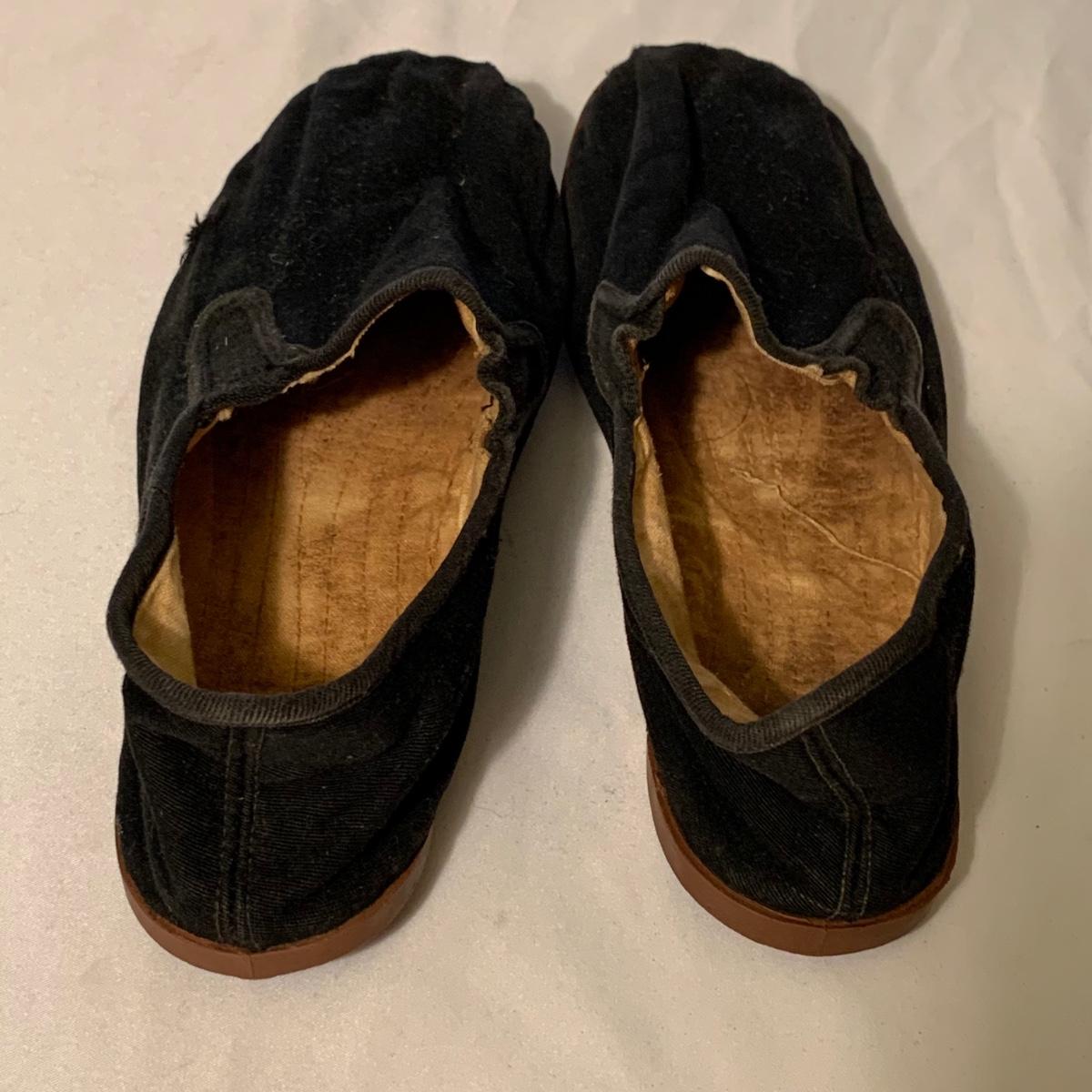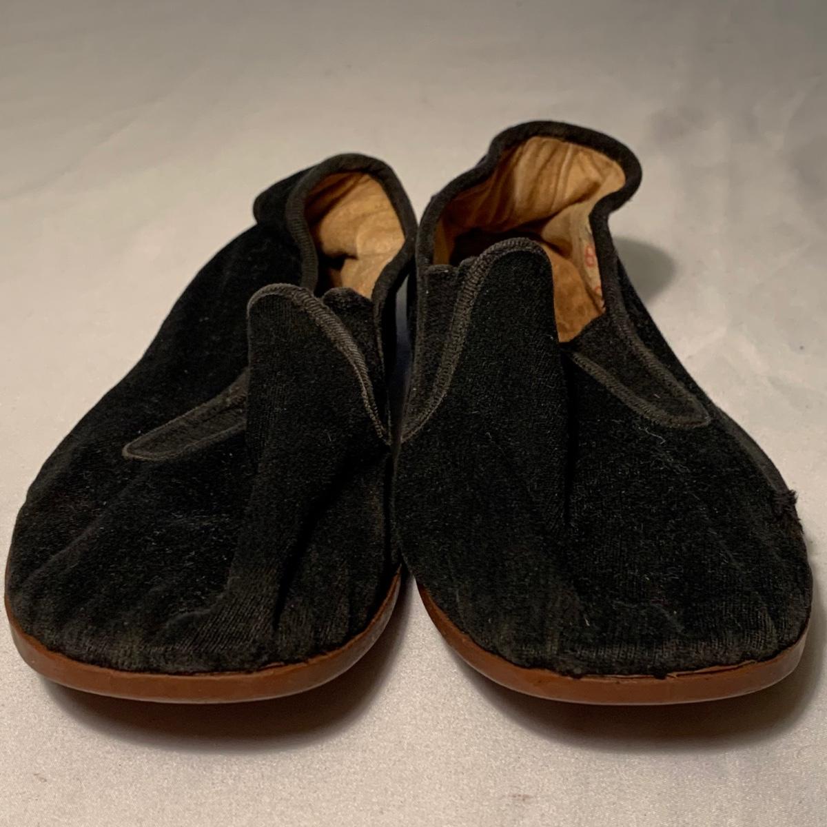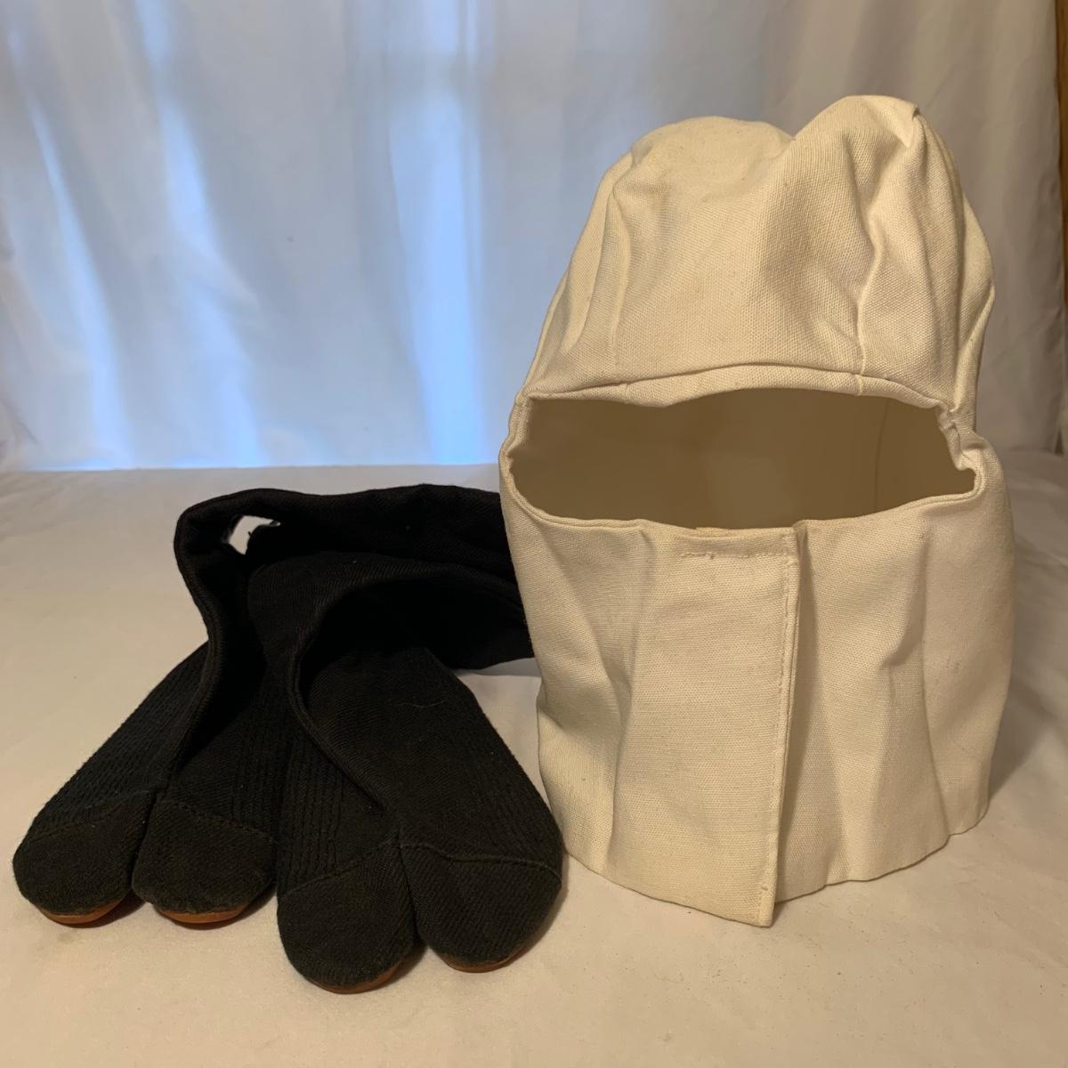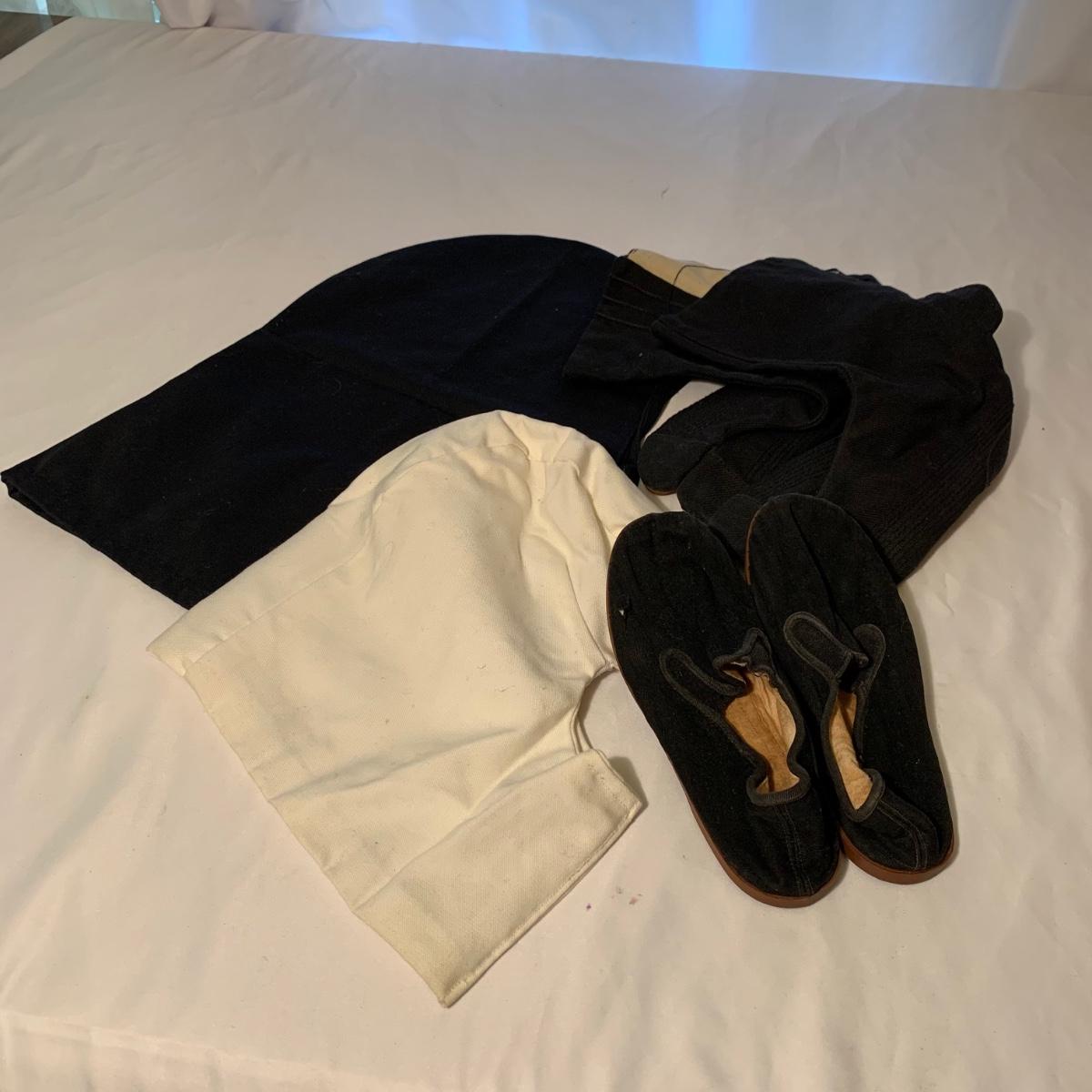 Four items of martial arts gear. One pair of Chinese made Gong Fu brand king fu shoes, size 32. They are about 9” long. They are flat and black and show some wear, but feel like they are strong and have quite a bit more life in them. There is a pair of Taiwanese made An Buh brand ninja boots, size 3. They are about 9” long. They are black fabric with gold colored fasteners along the leg of the boot. There are also two balaclava style ninja masks. One is white and has a small snap fastener, the other is black and has a tie to fasten. The black mask is AWMA brand. The white mask has some stains that might be washable. Shipping available.