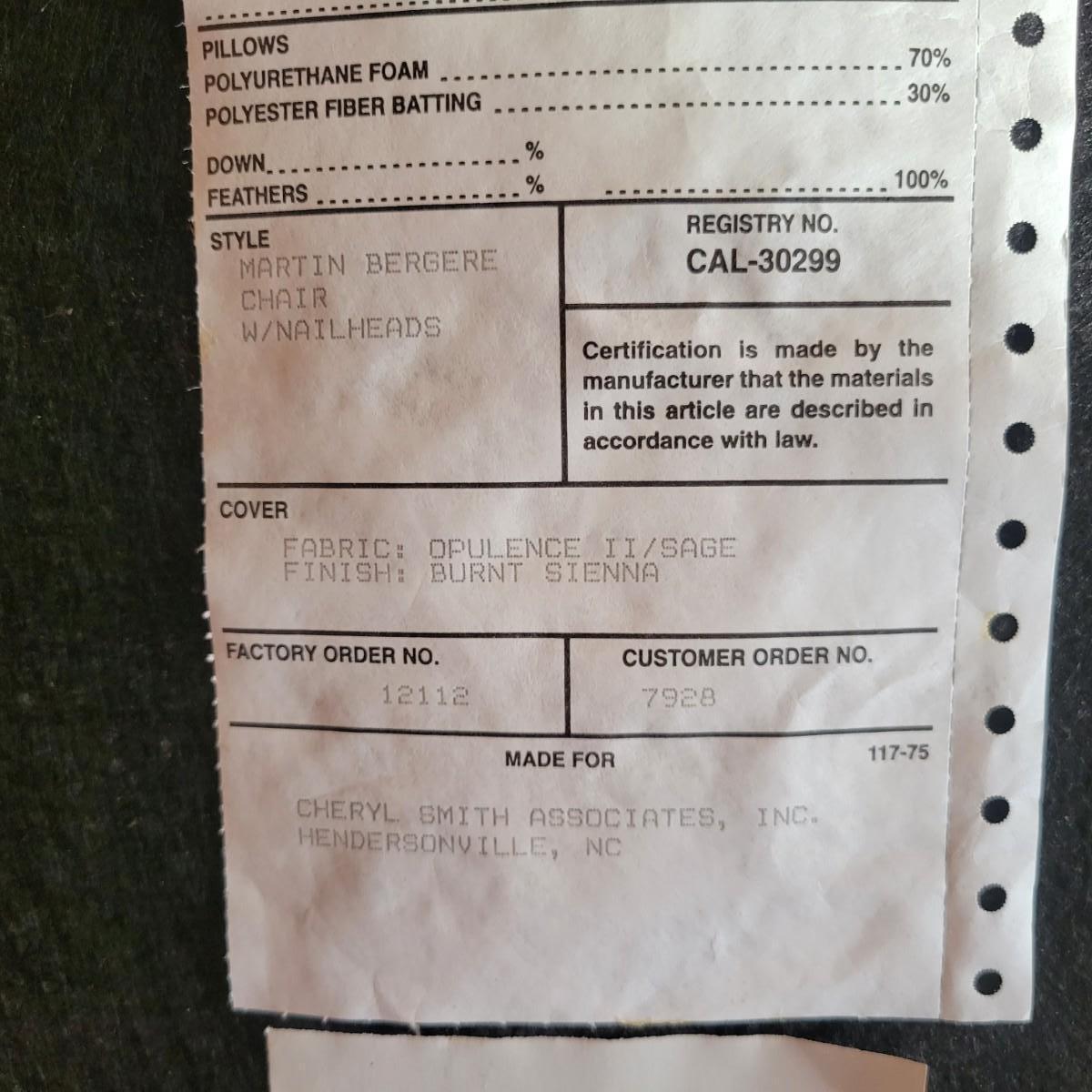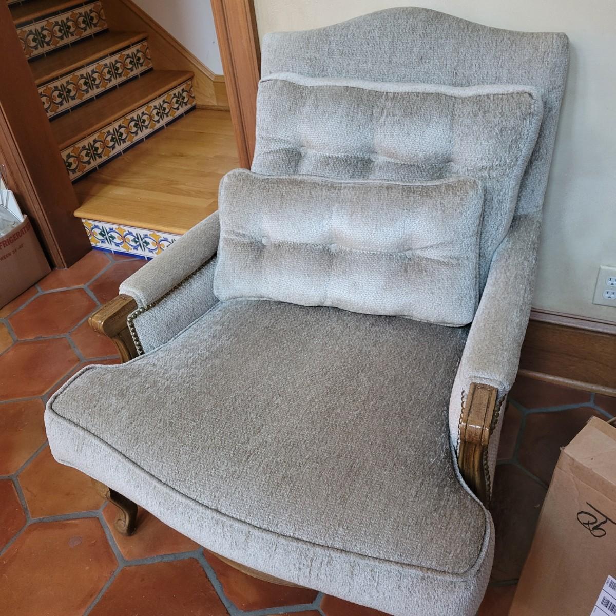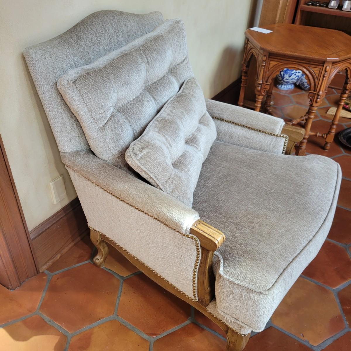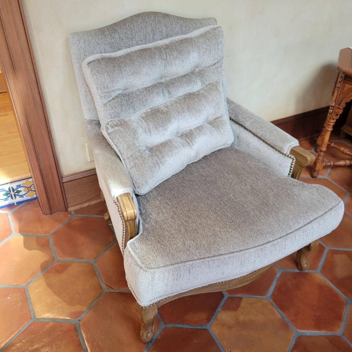 An upholstered Martin Bergere chair that features a wooden frame and brass upholstery tacks. The upholstery is a soft micro fiber in a subtle sage color. It measures approximately 32" x 38" x 38"H with a seat height of 18.5". Local pickup only. Winning bidder must bring assistance to help move and load this item due to its weight and/or size.