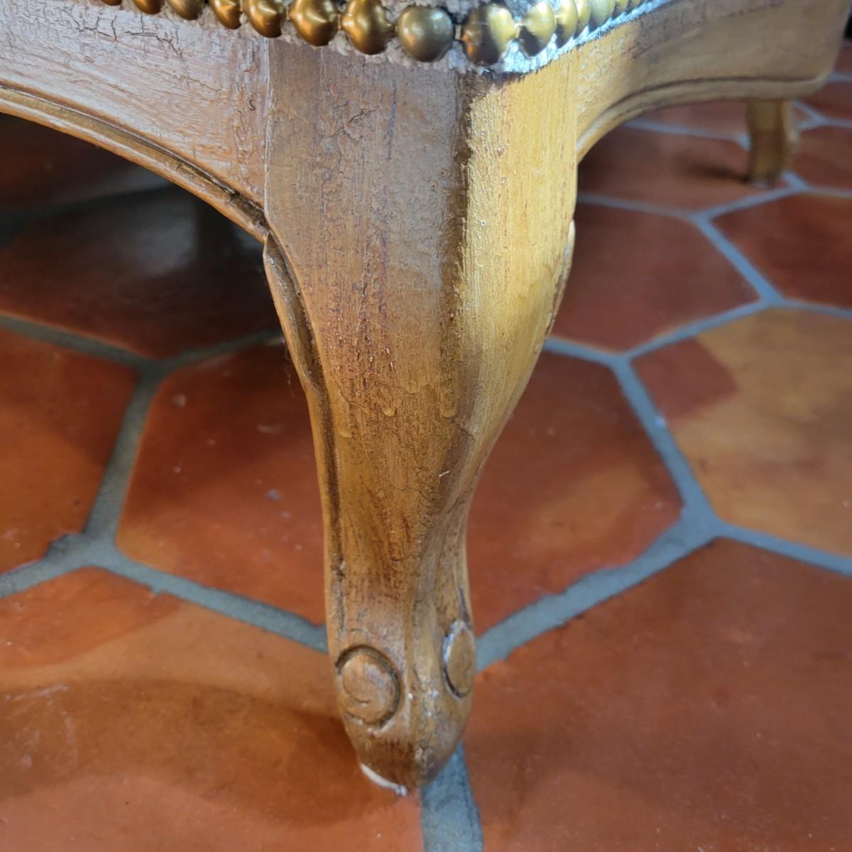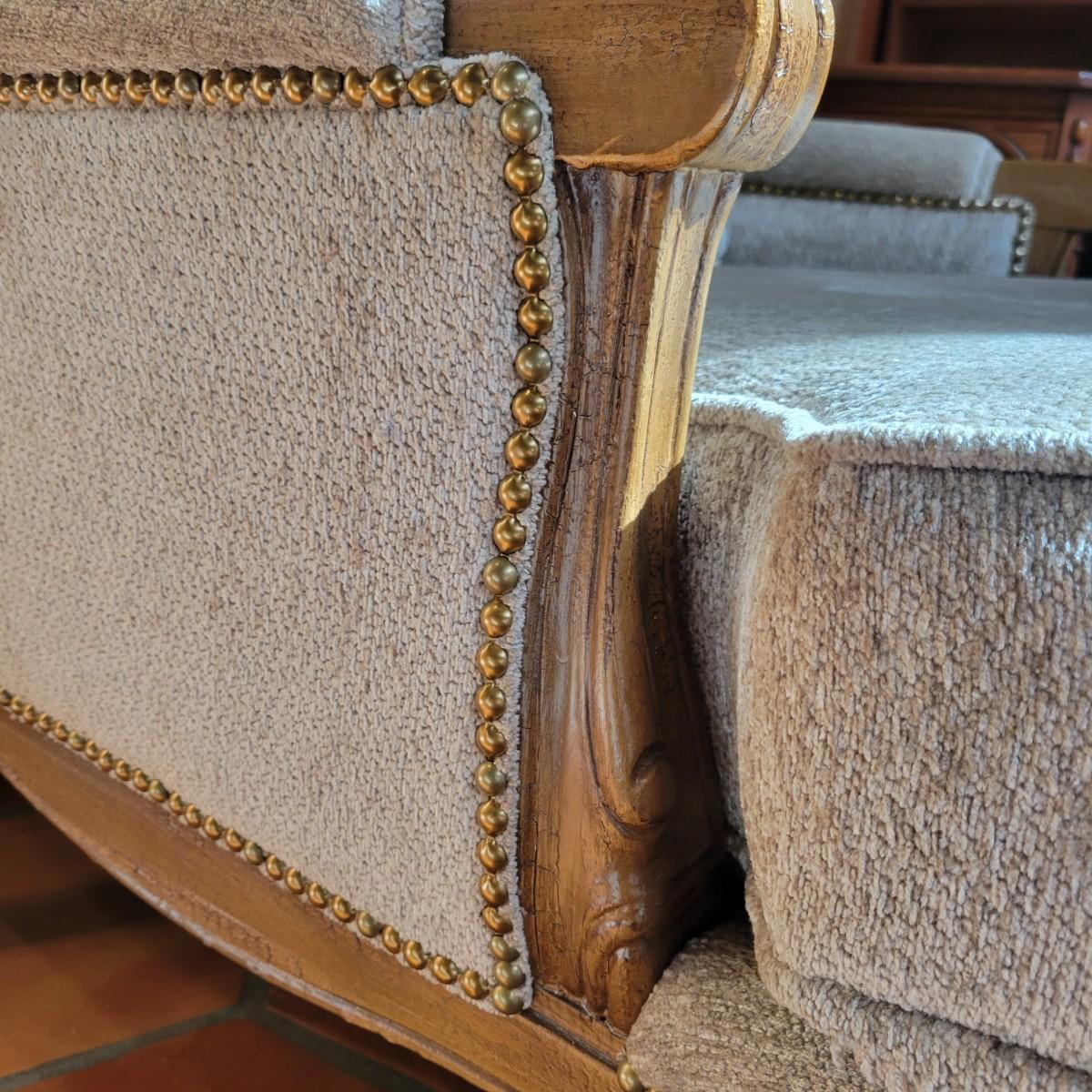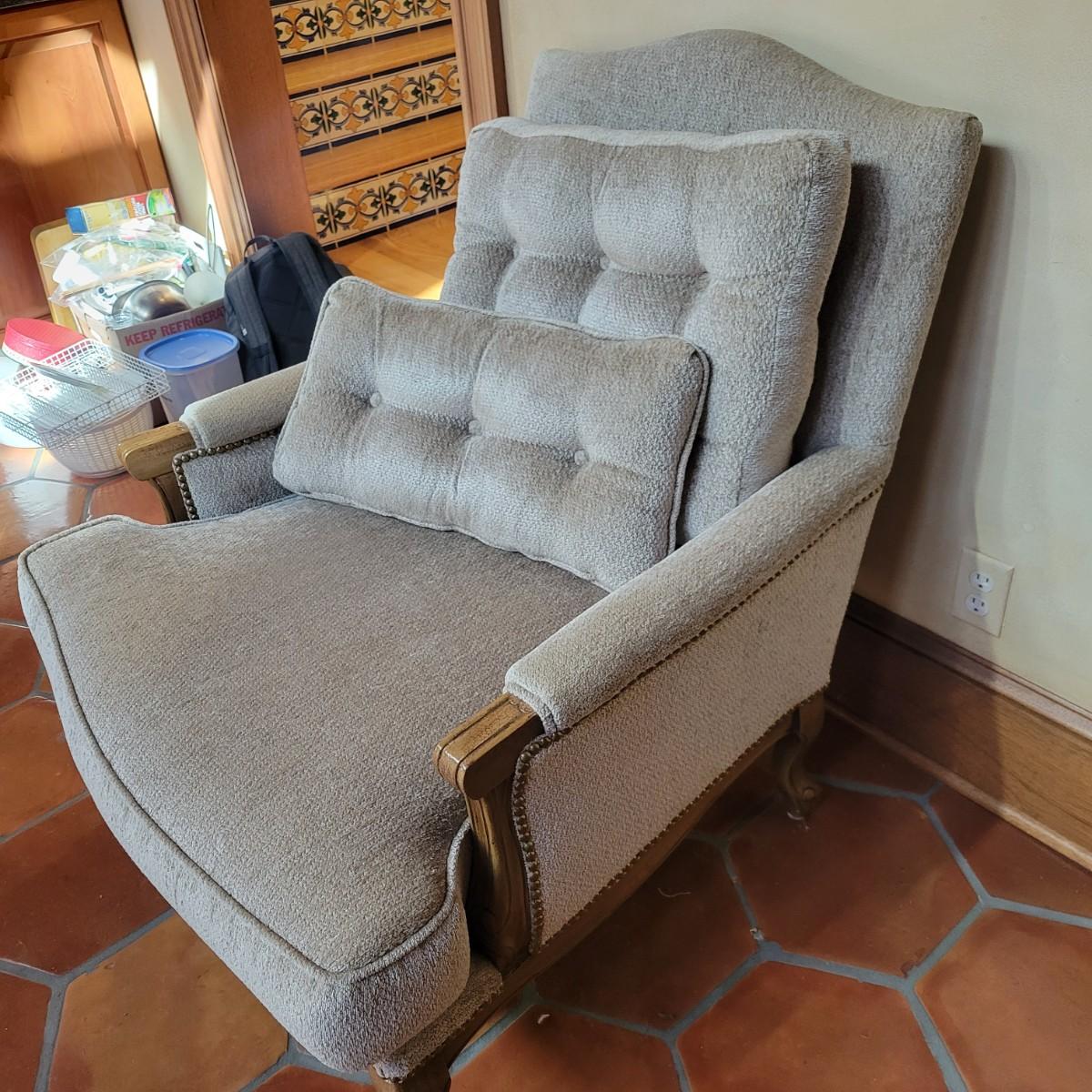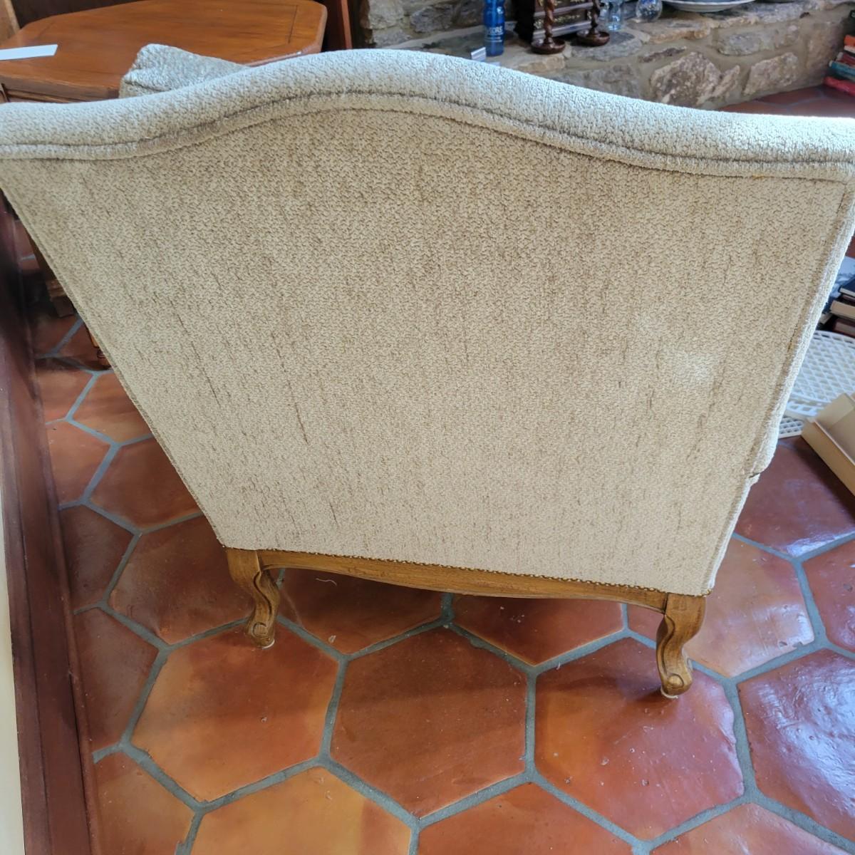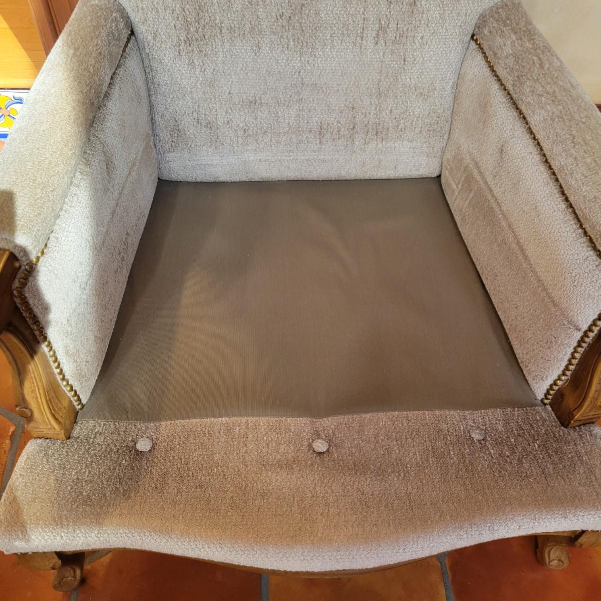 An upholstered Martin Bergere chair that features a wooden frame and brass upholstery tacks. The upholstery is a soft micro fiber in a subtle sage color. It measures approximately 32" x 38" x 38"H with a seat height of 18.5". Local pickup only. Winning bidder must bring assistance to help move and load this item due to its weight and/or size.