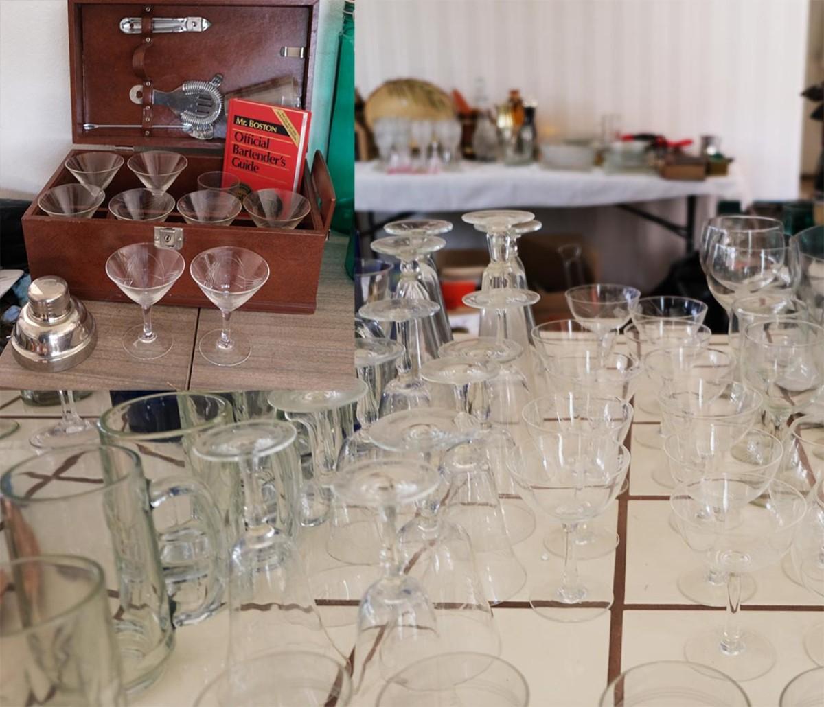 1950's etched glass design, "James Bond" Martini and Cocktail Party Set, including serving bowls and Bartender's Guide. 50+ pieces.