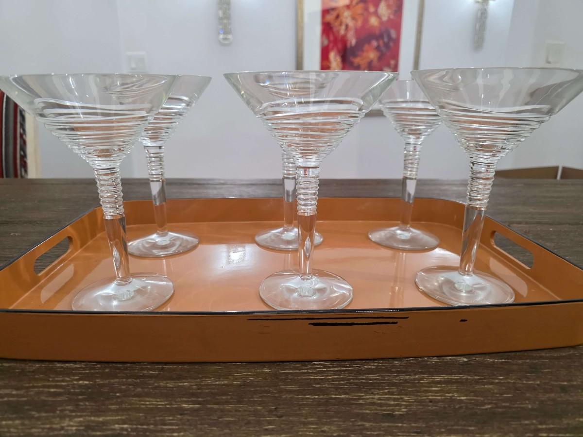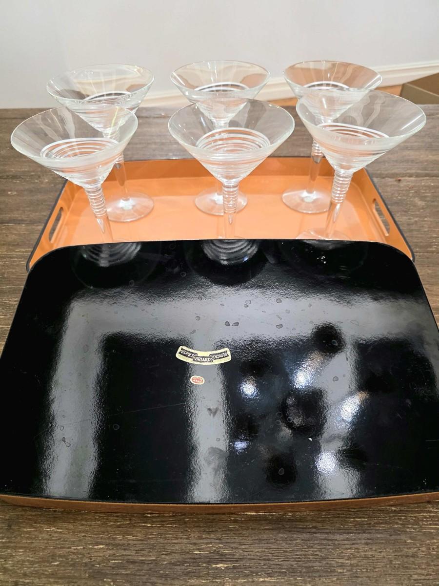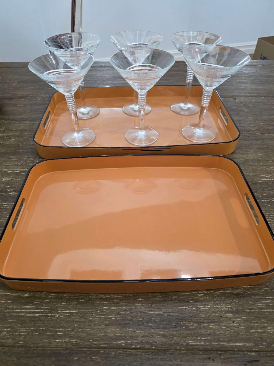 This is a lot including 6 glass martini glasses and 2 trays by Georges Briard Designs. One tray does have some scuffs. Please see pictures for close inspection. The art you may see in the background is NOT included. You are bidding on the lot meaning you must pay for and take the entire lot.