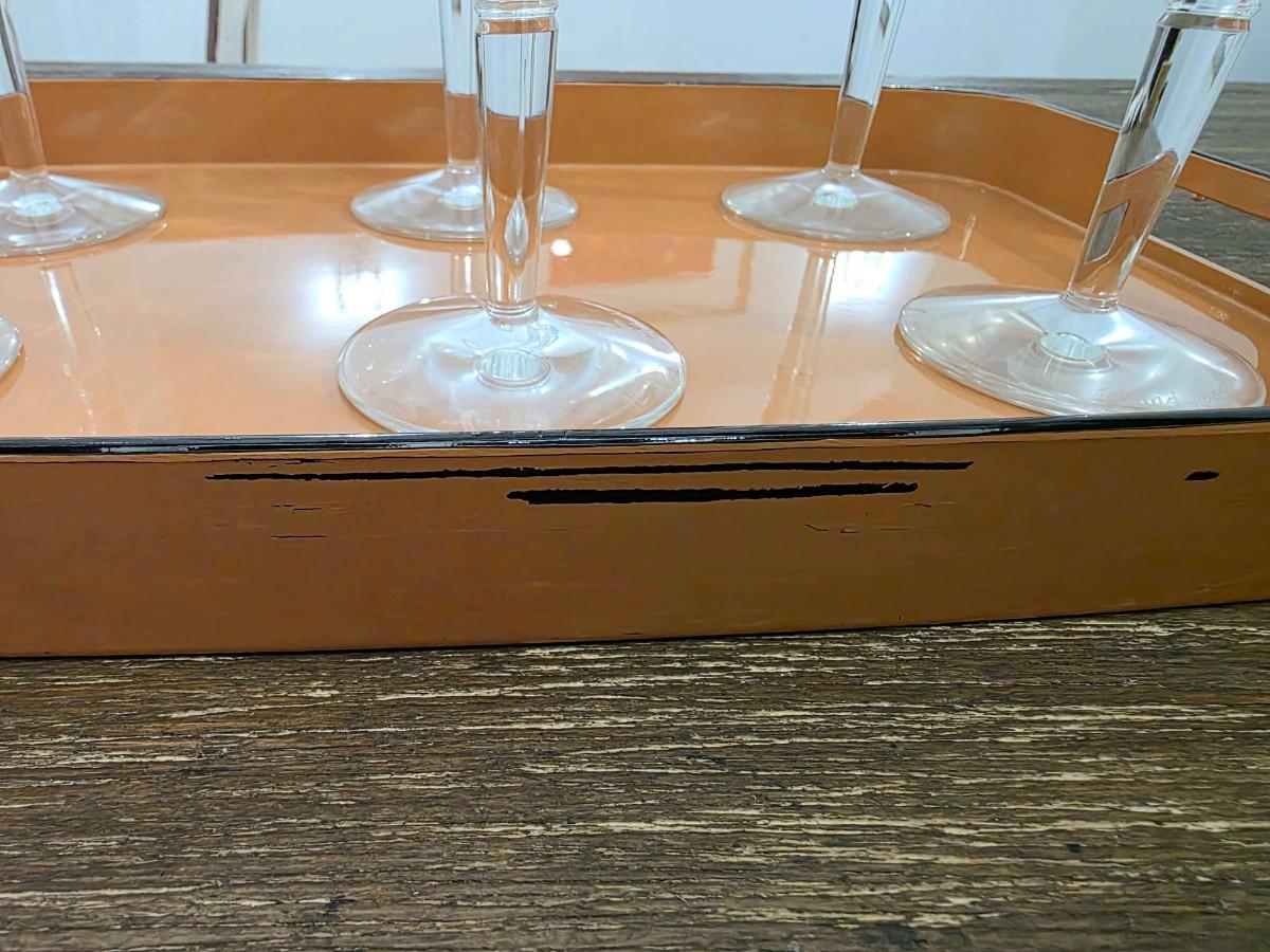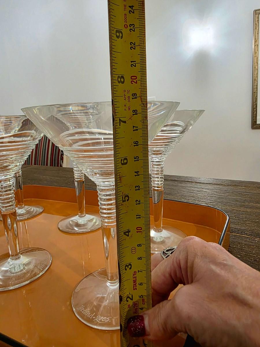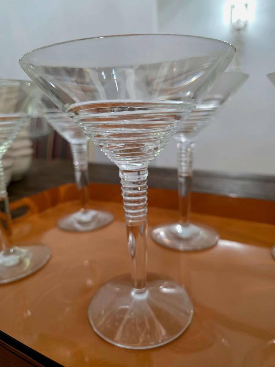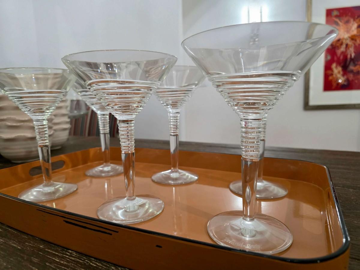 This is a lot including 6 glass martini glasses and 2 trays by Georges Briard Designs. One tray does have some scuffs. Please see pictures for close inspection. The art you may see in the background is NOT included. You are bidding on the lot meaning you must pay for and take the entire lot.