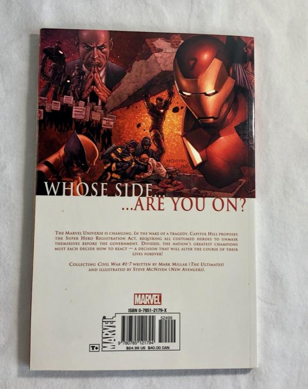The marvel universe is changing. In the wake of a tragedy, Capitol Hill proposes the Super Hero Registration Act, requiring all costumed heroes to unmask themselves before the government. Divided. The nation's greatest champions must each decide how to react - a decision tht will alter the course of their lives forever! Collecting Civil War # 1-7. Written by Mark Millar. Illustrated by Steve McNiven.