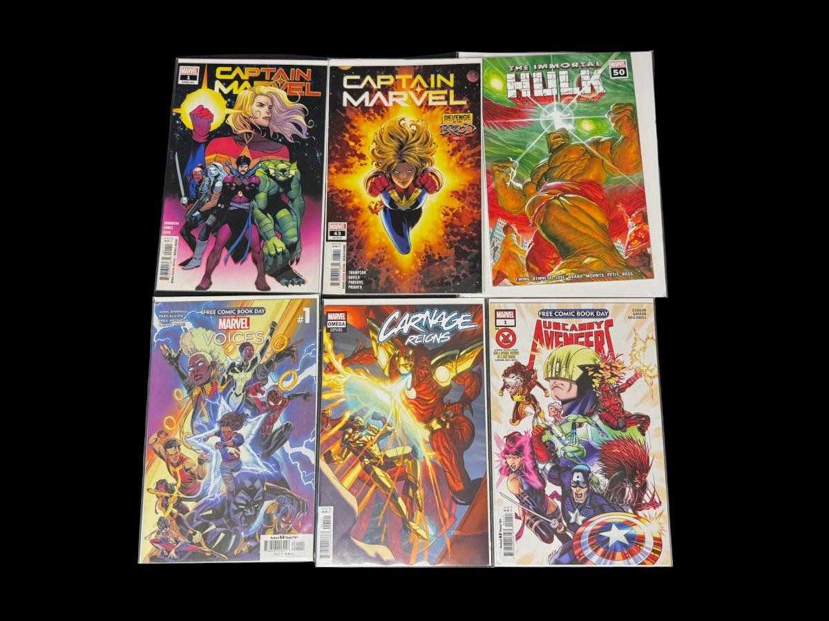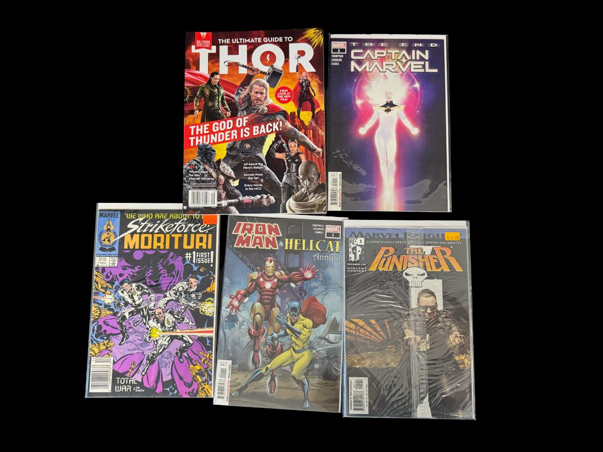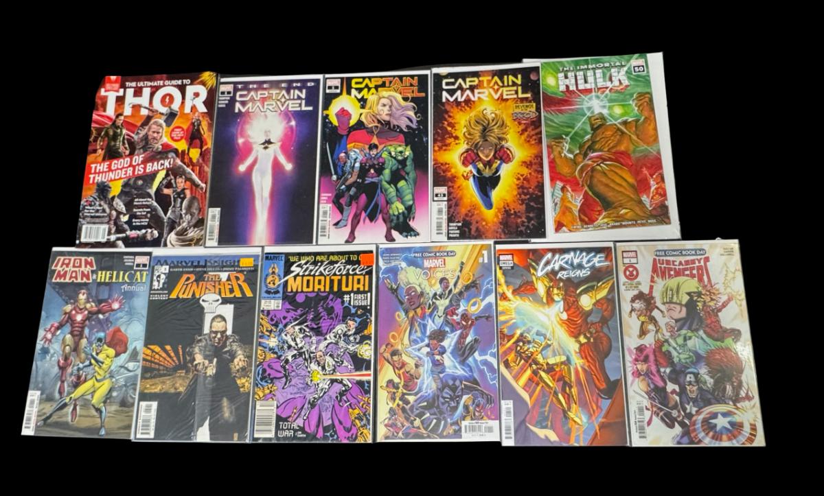 Includes Carnage Reigns, Ultimate Guide to Thor, Voices, Strikeforce Morituri, The Punisher, Iron Man & Hellcat, Uncanny Avengers, Captain Marvel, Immortal Hulk, and more. Total of 11 comic books. All books were preserved upon purchase.